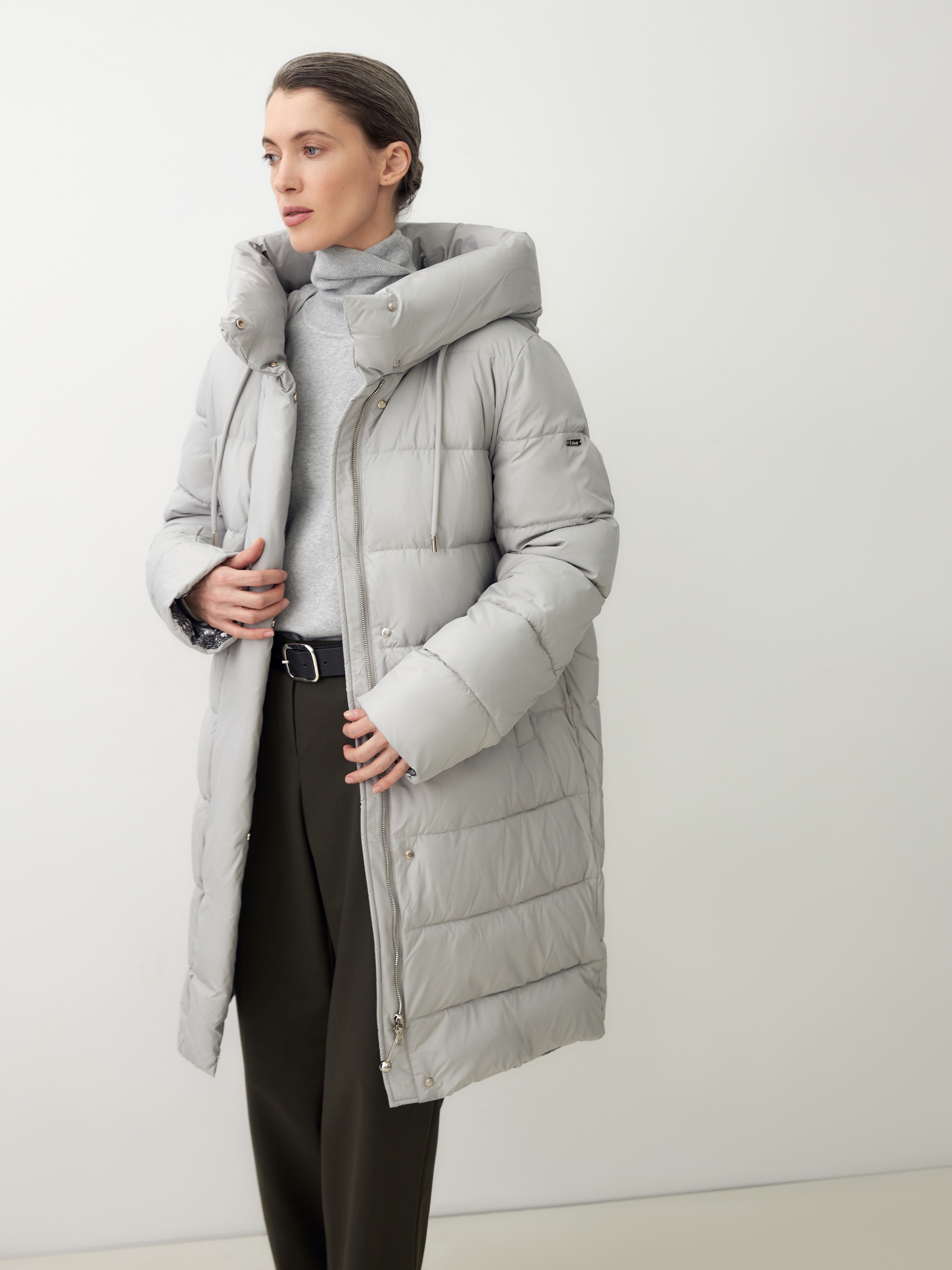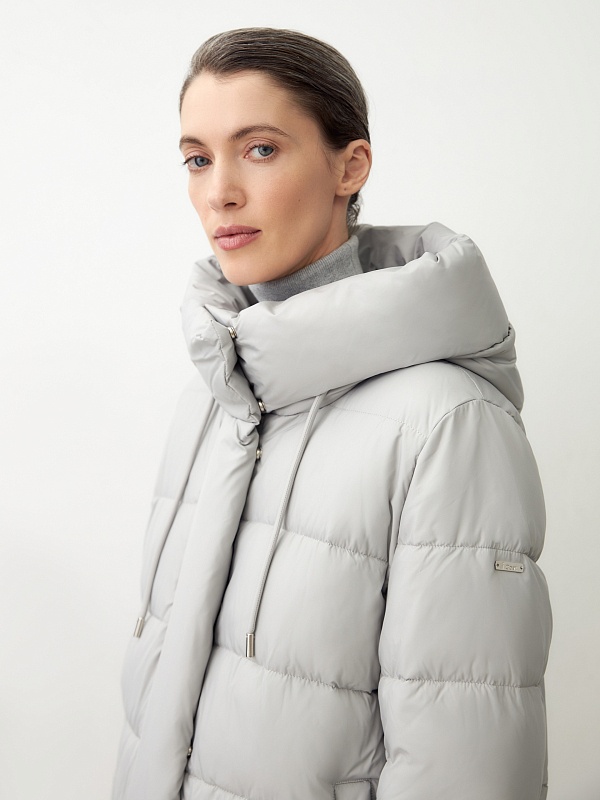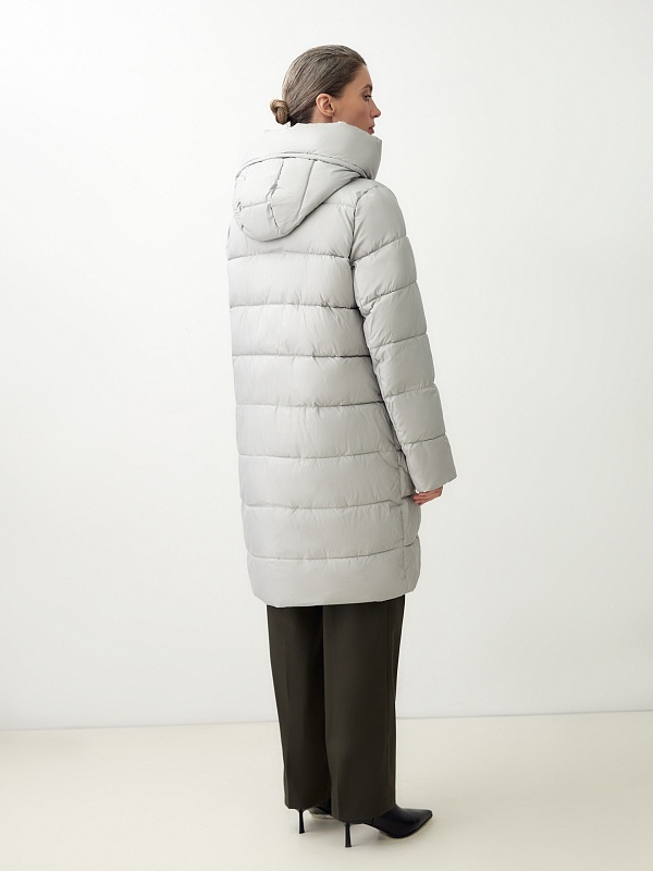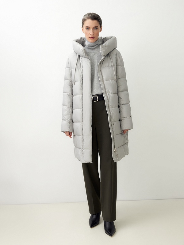 Пальто-пуховик прямого силуэта из плащевой ткани серого цвета. Крупные горизонтальные отстрочки. Втачной рукав, воротник-стойка и капюшон, карманы-листочки, центральная застёжка на молнию и пришивные кнопки. Утеплитель DuPont Sorona.