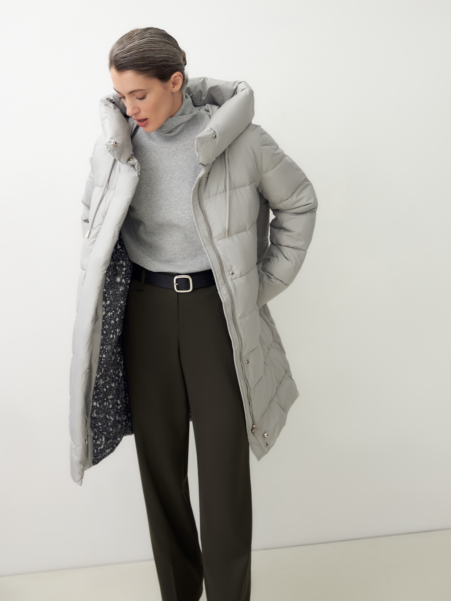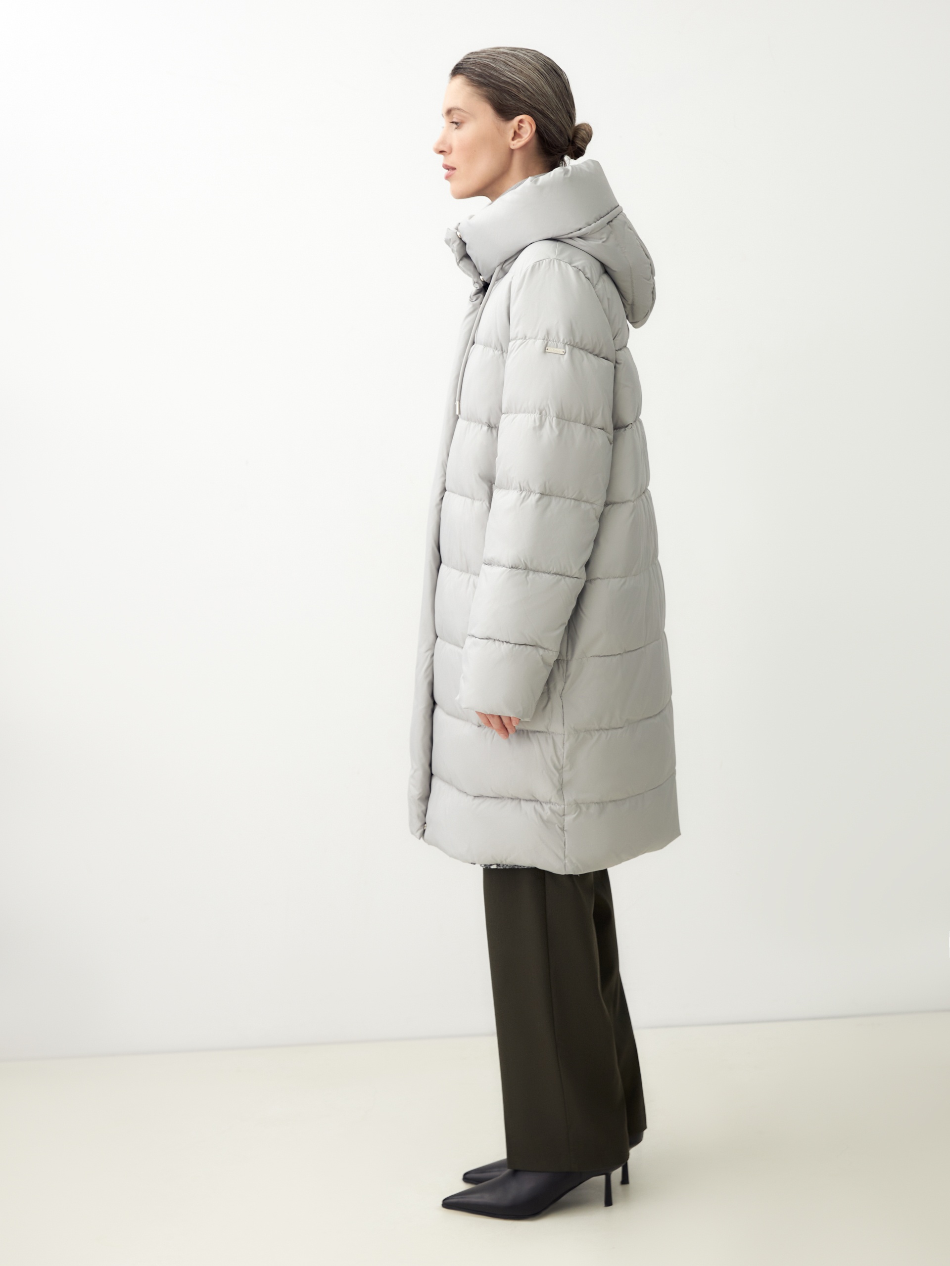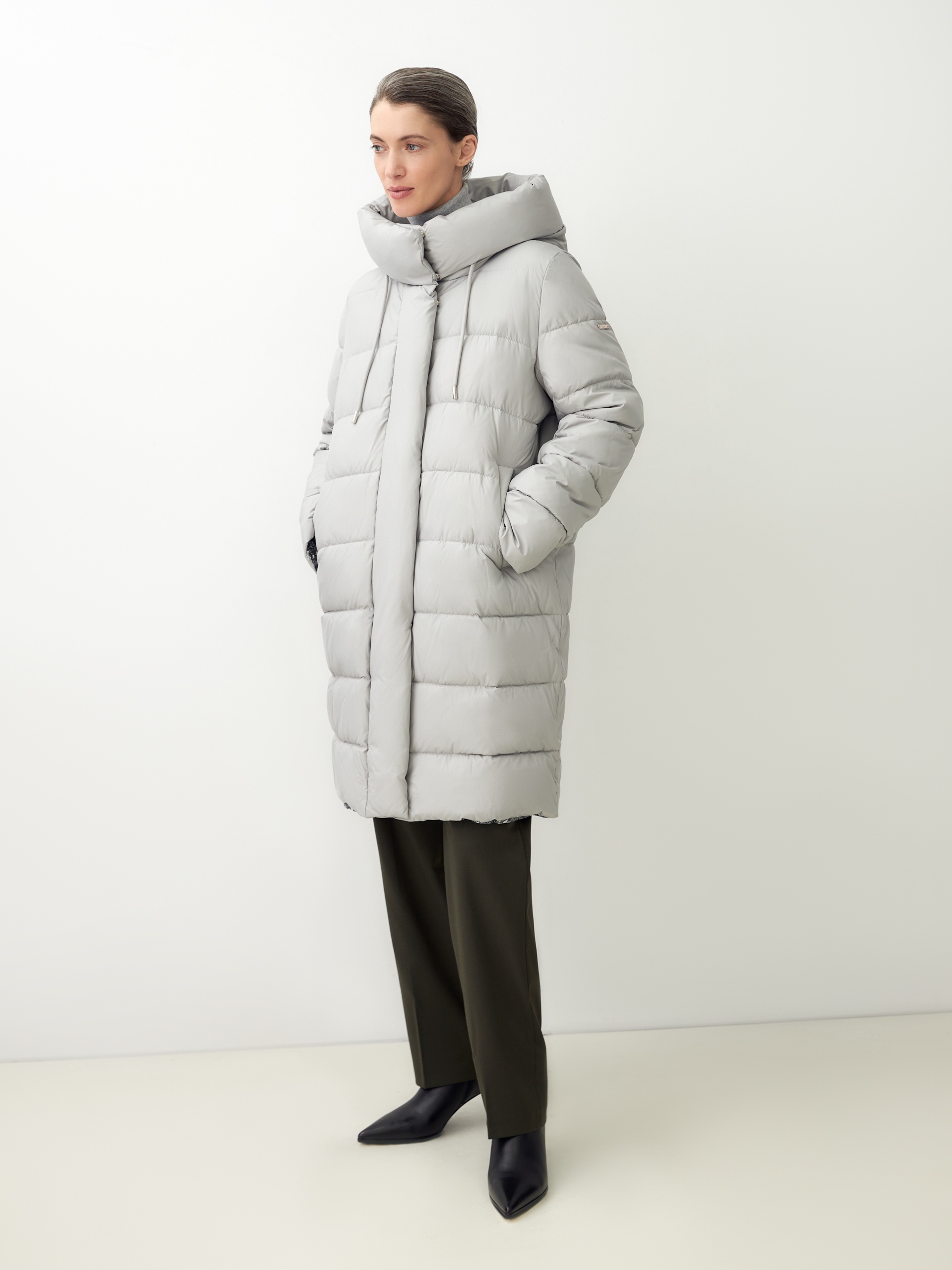 Пальто-пуховик прямого силуэта из плащевой ткани серого цвета. Крупные горизонтальные отстрочки. Втачной рукав, воротник-стойка и капюшон, карманы-листочки, центральная застёжка на молнию и пришивные кнопки. Утеплитель DuPont Sorona.