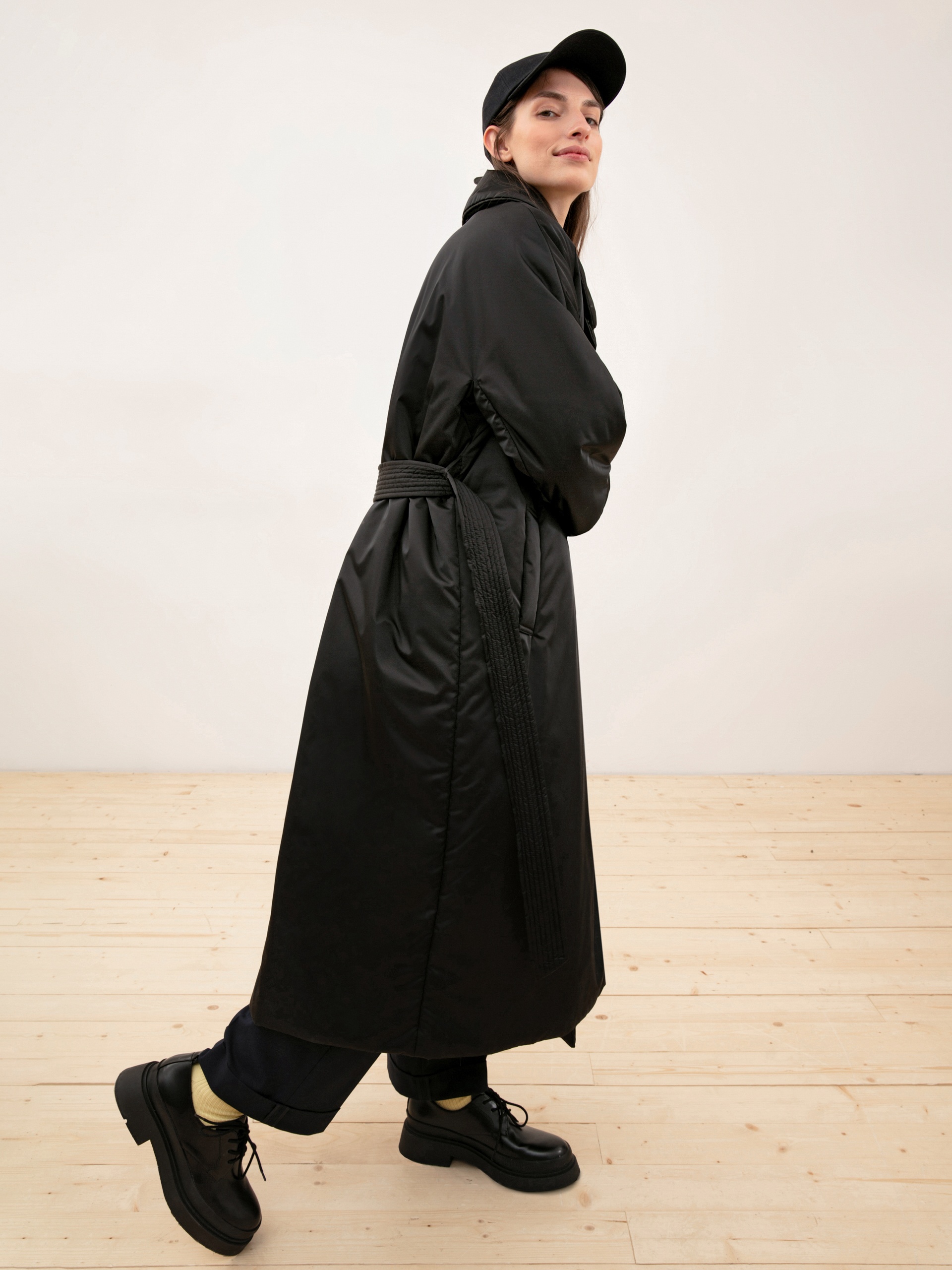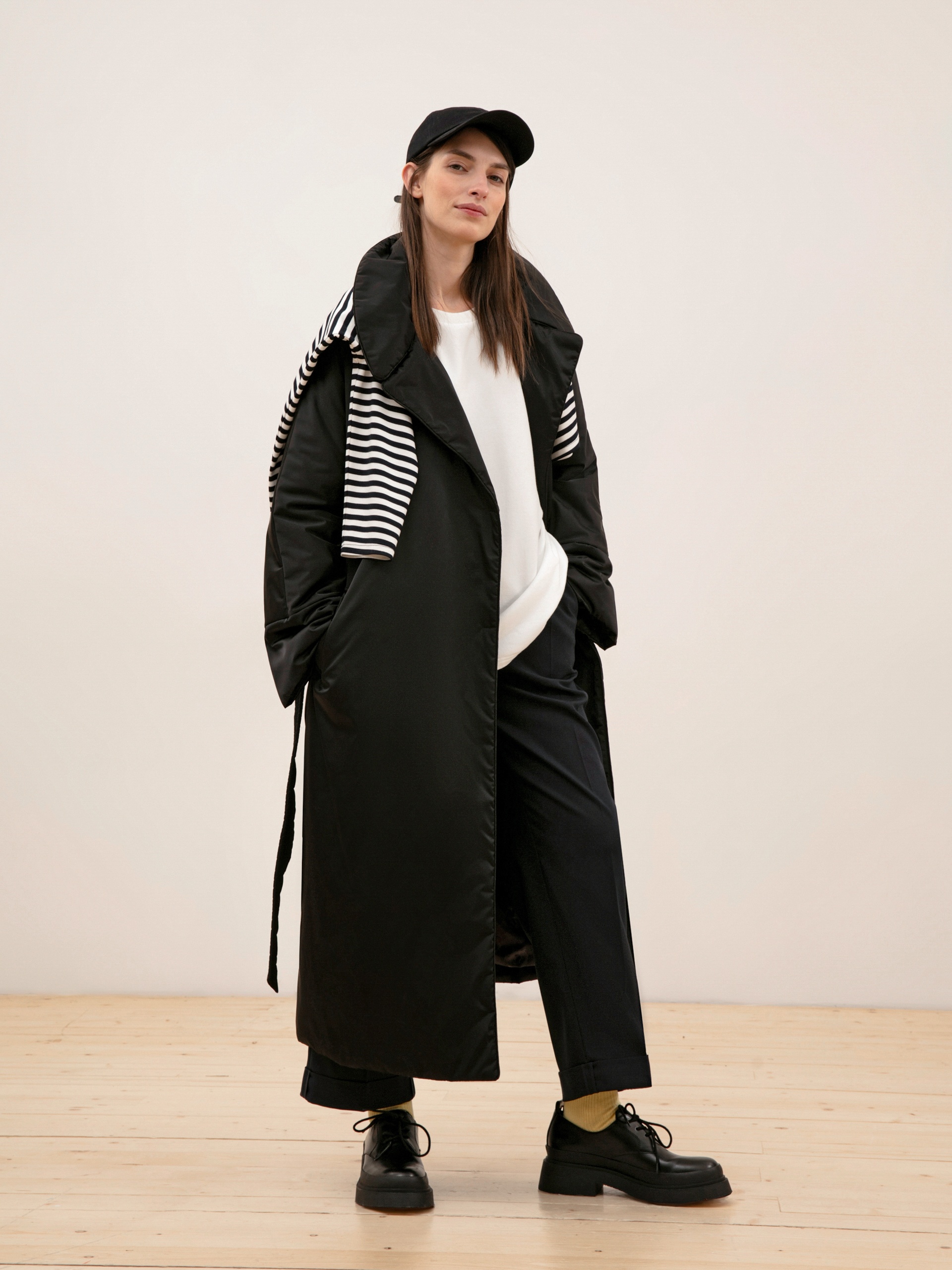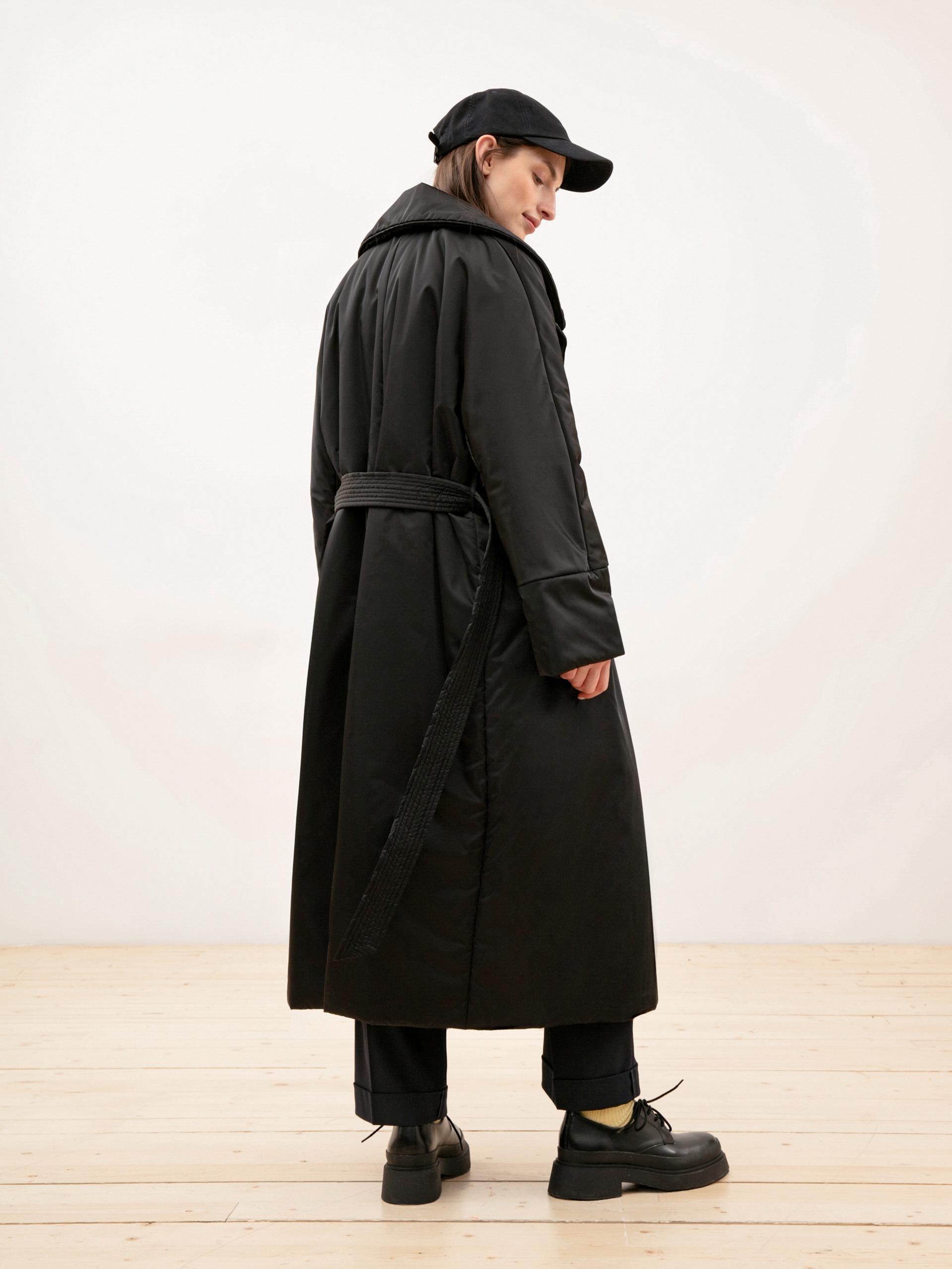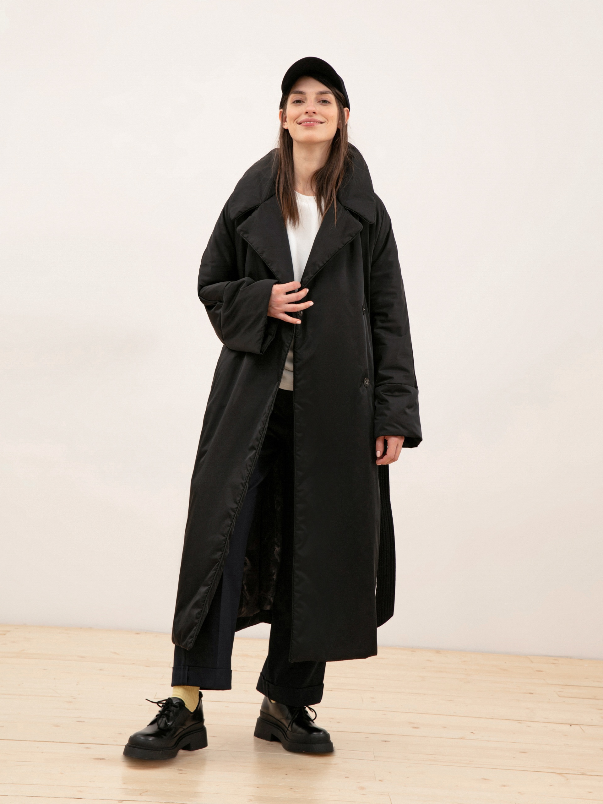 Удлиненное пальто прямого силуэта из плащевой ткани черного цвета. Рукав рубашечный, английский воротник, карманы-листочки, застежка на пришивные кнопки. В качестве декора присутствует пояс из основной ткани с декоративными отстрочками. Длина изделия ниже колена.