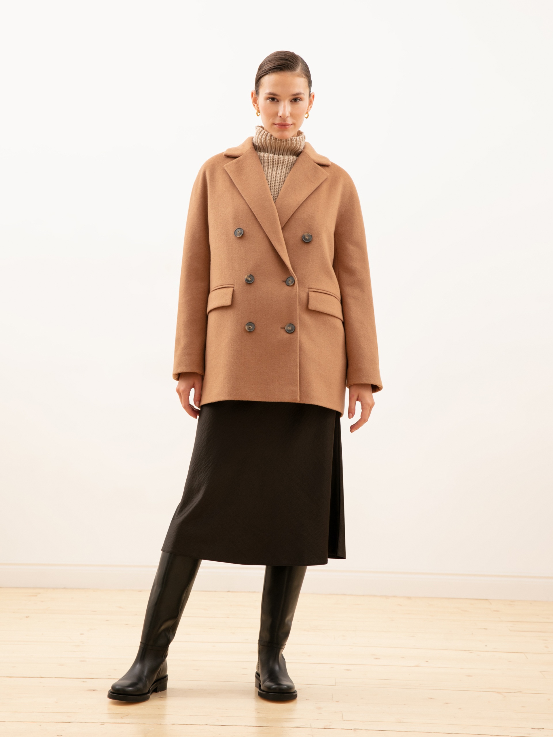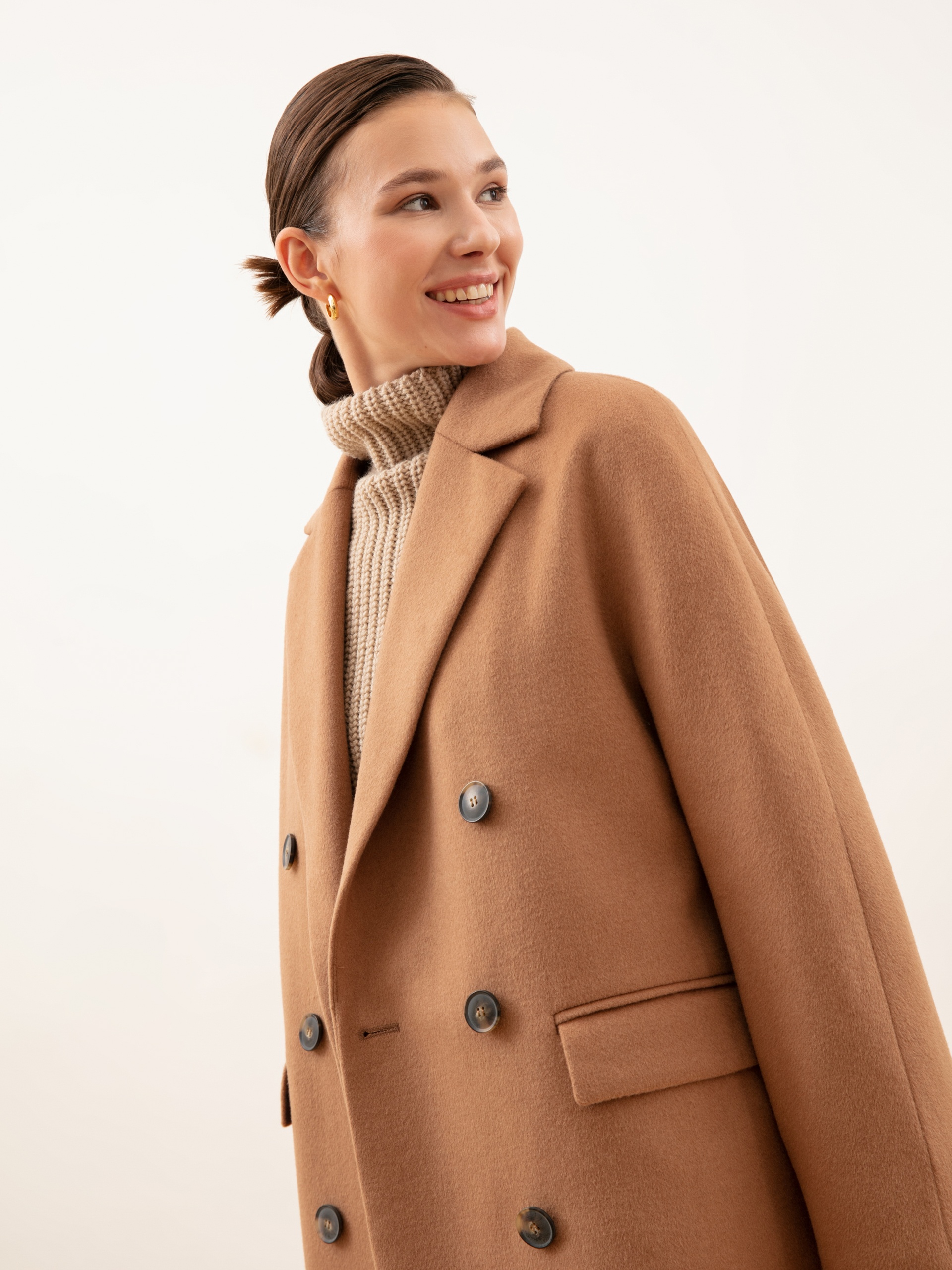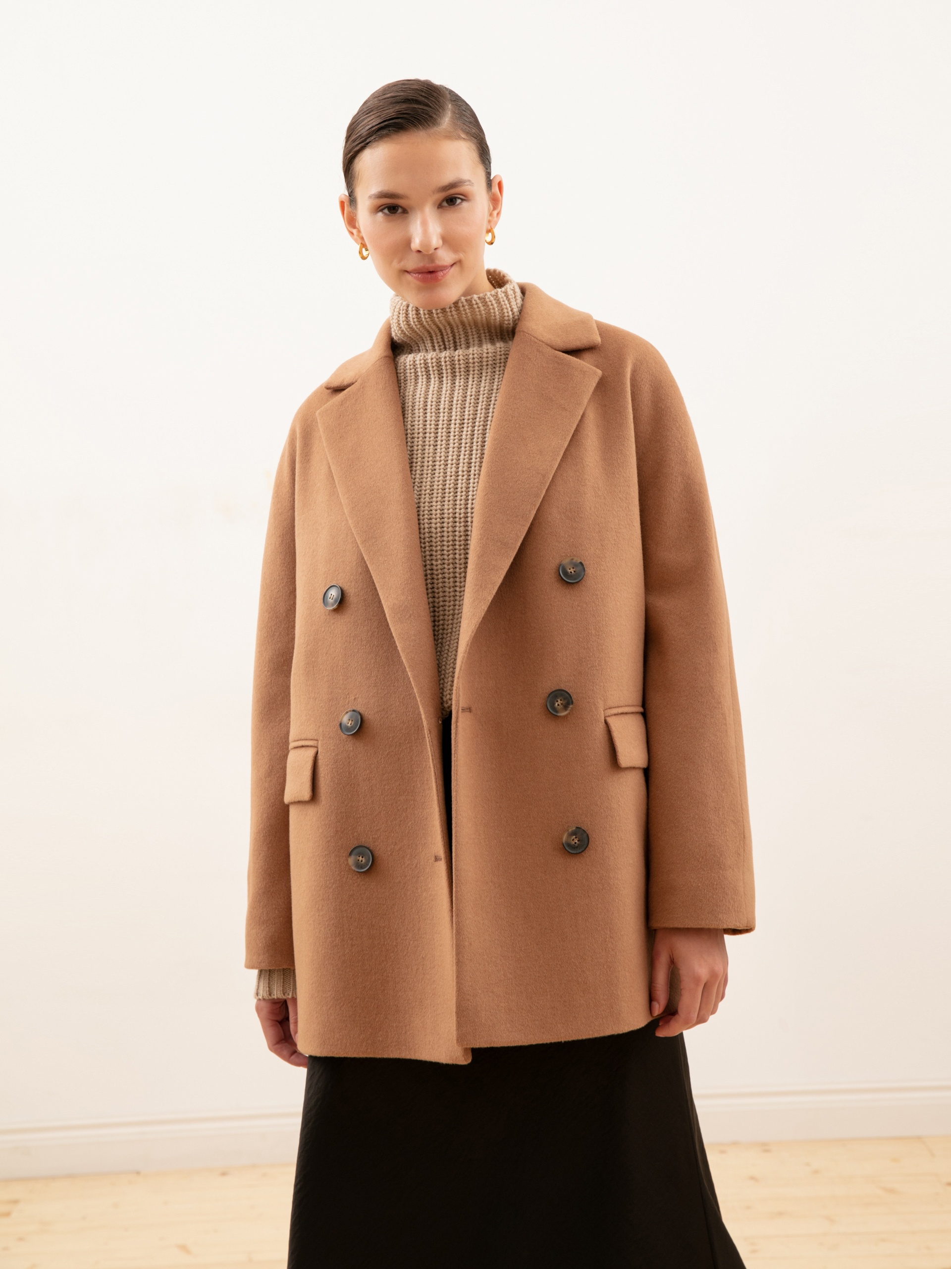 Укороченное двубортное пальто из ворсовой шерстяной ткани оттенка «кэмел». Выполнено с технологией Raft Pro.