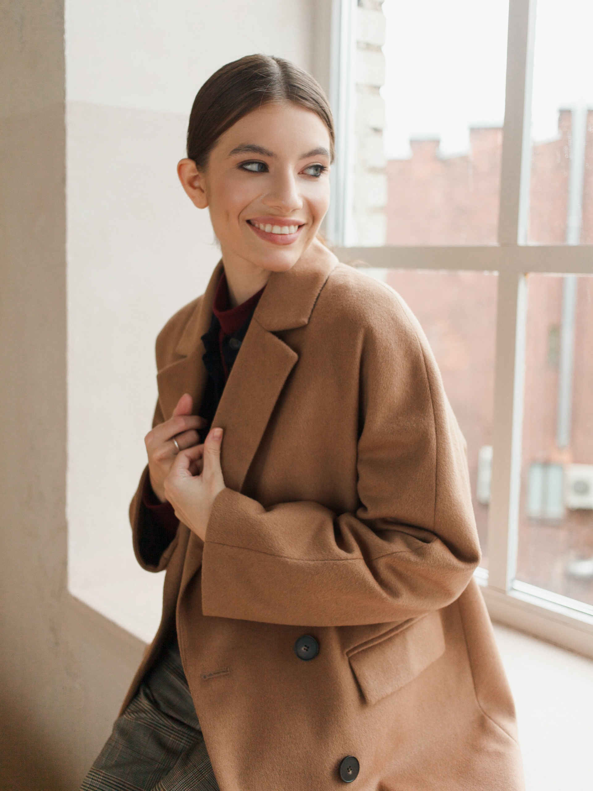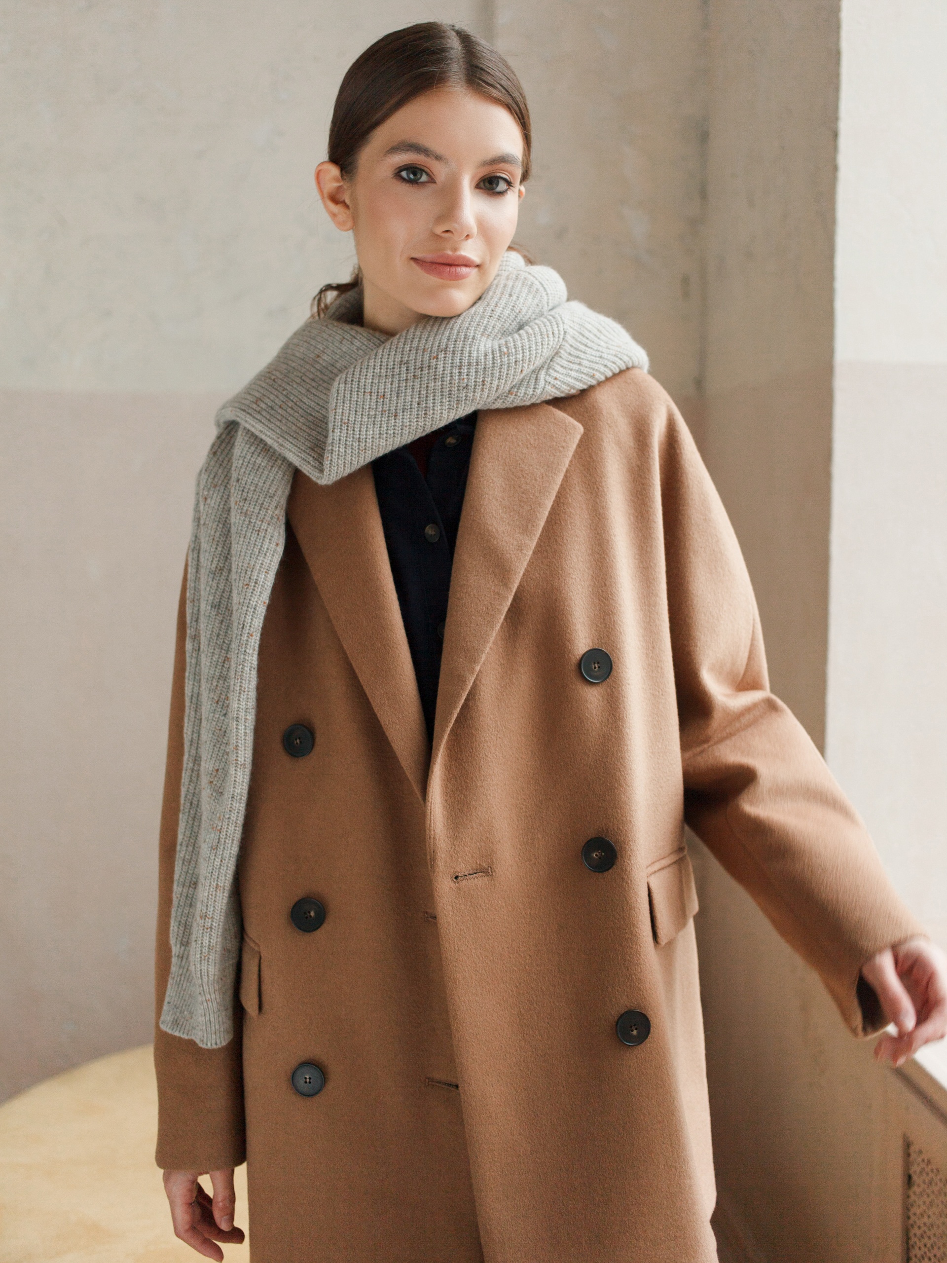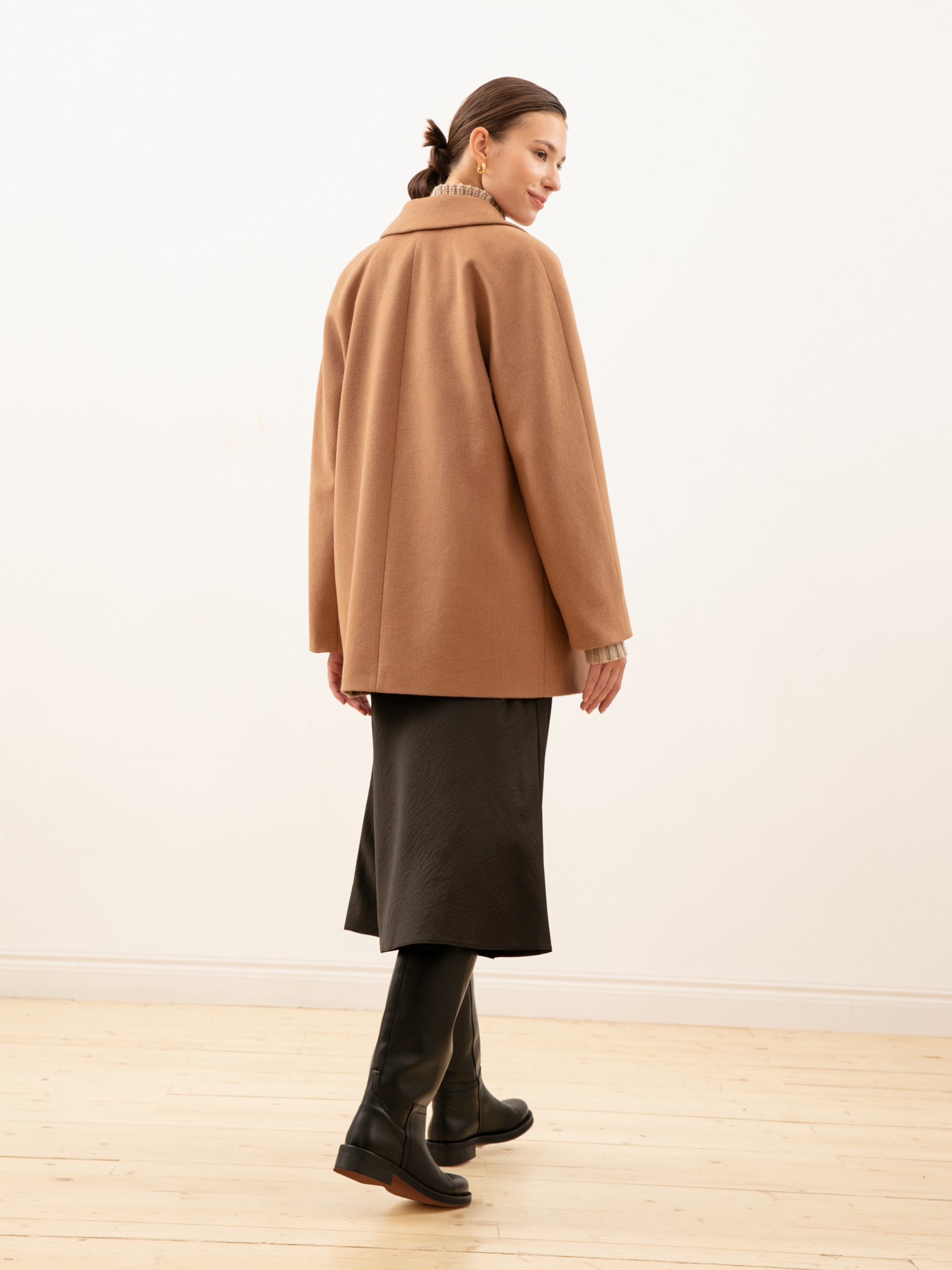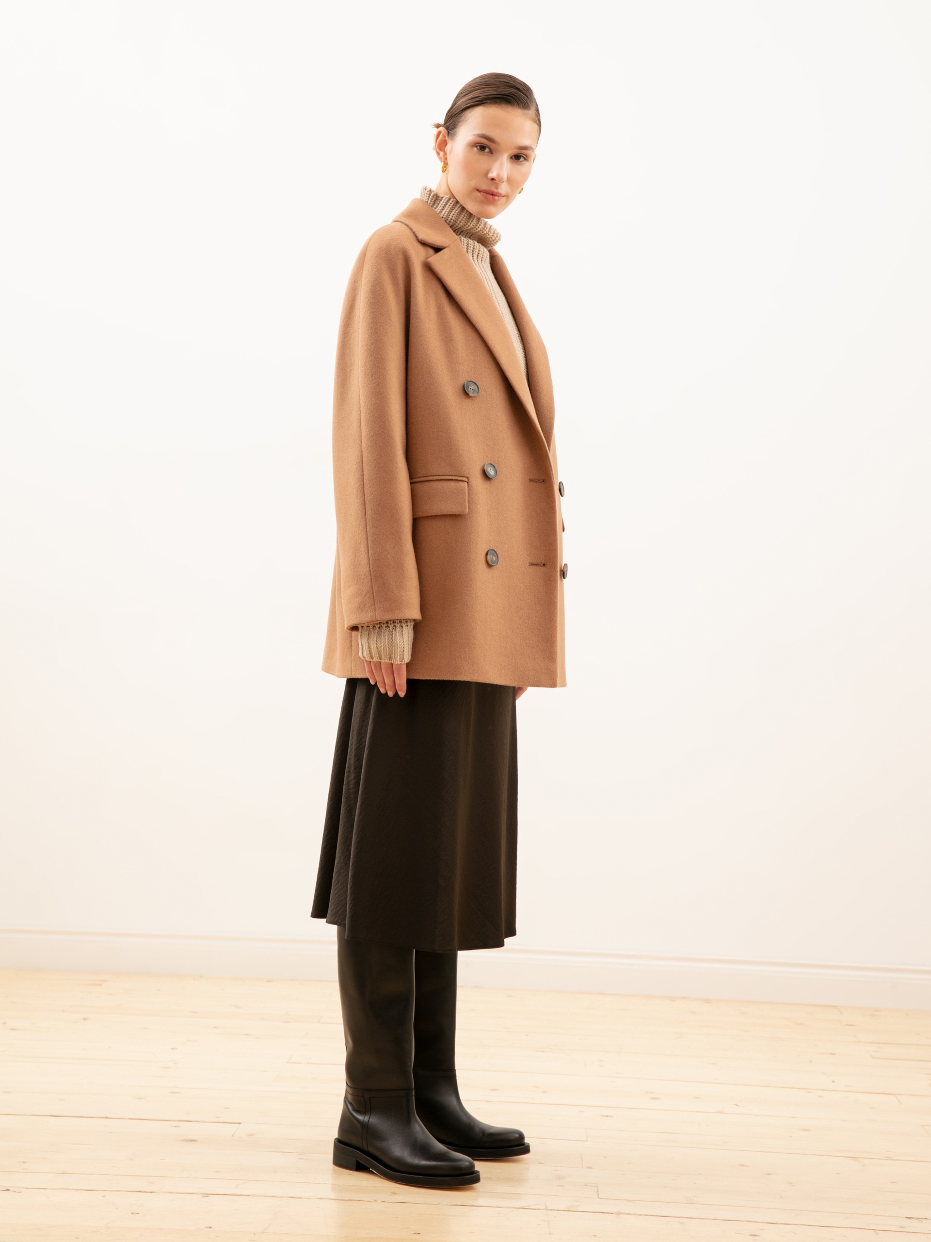 Укороченное двубортное пальто из ворсовой шерстяной ткани оттенка «кэмел». Выполнено с технологией Raft Pro.