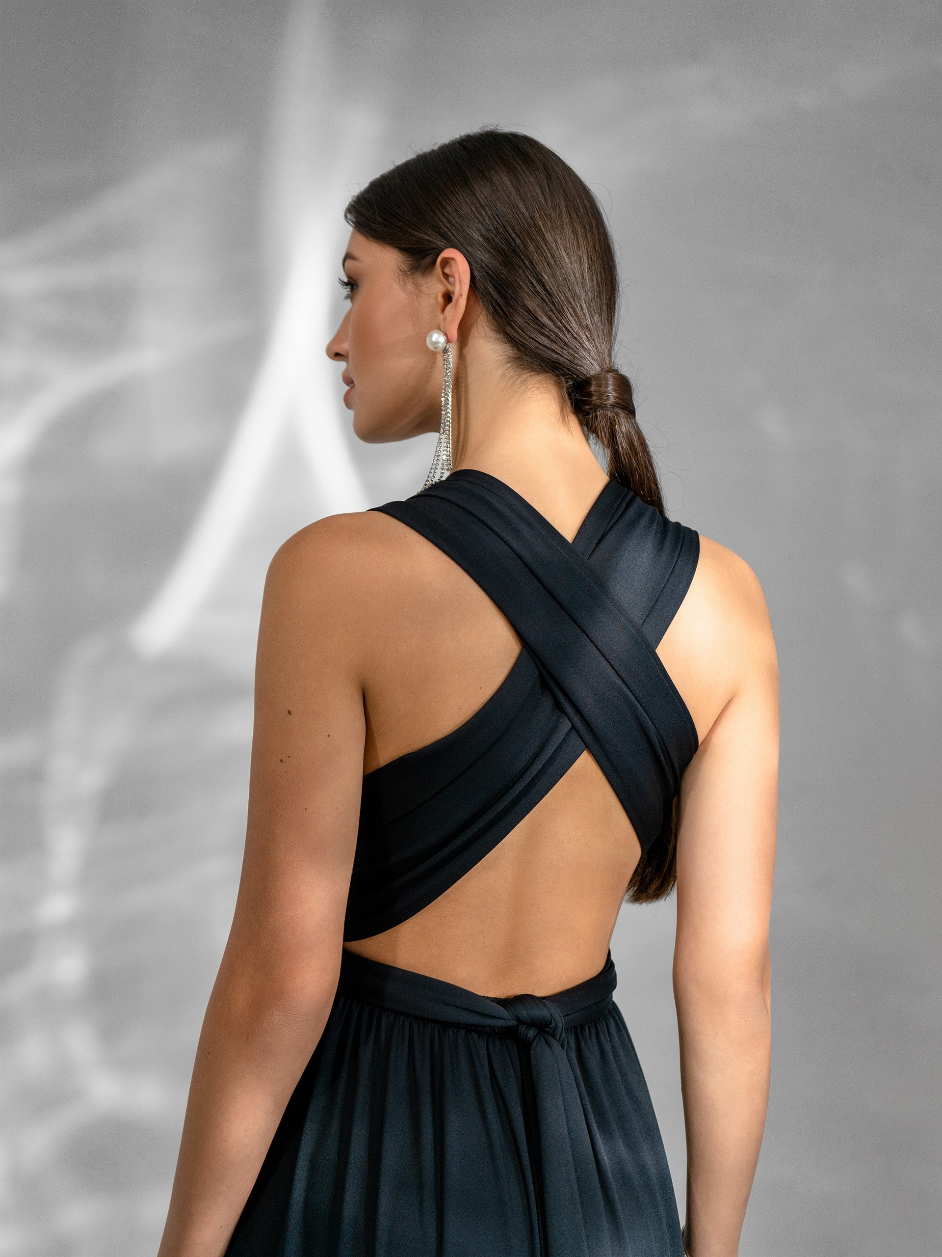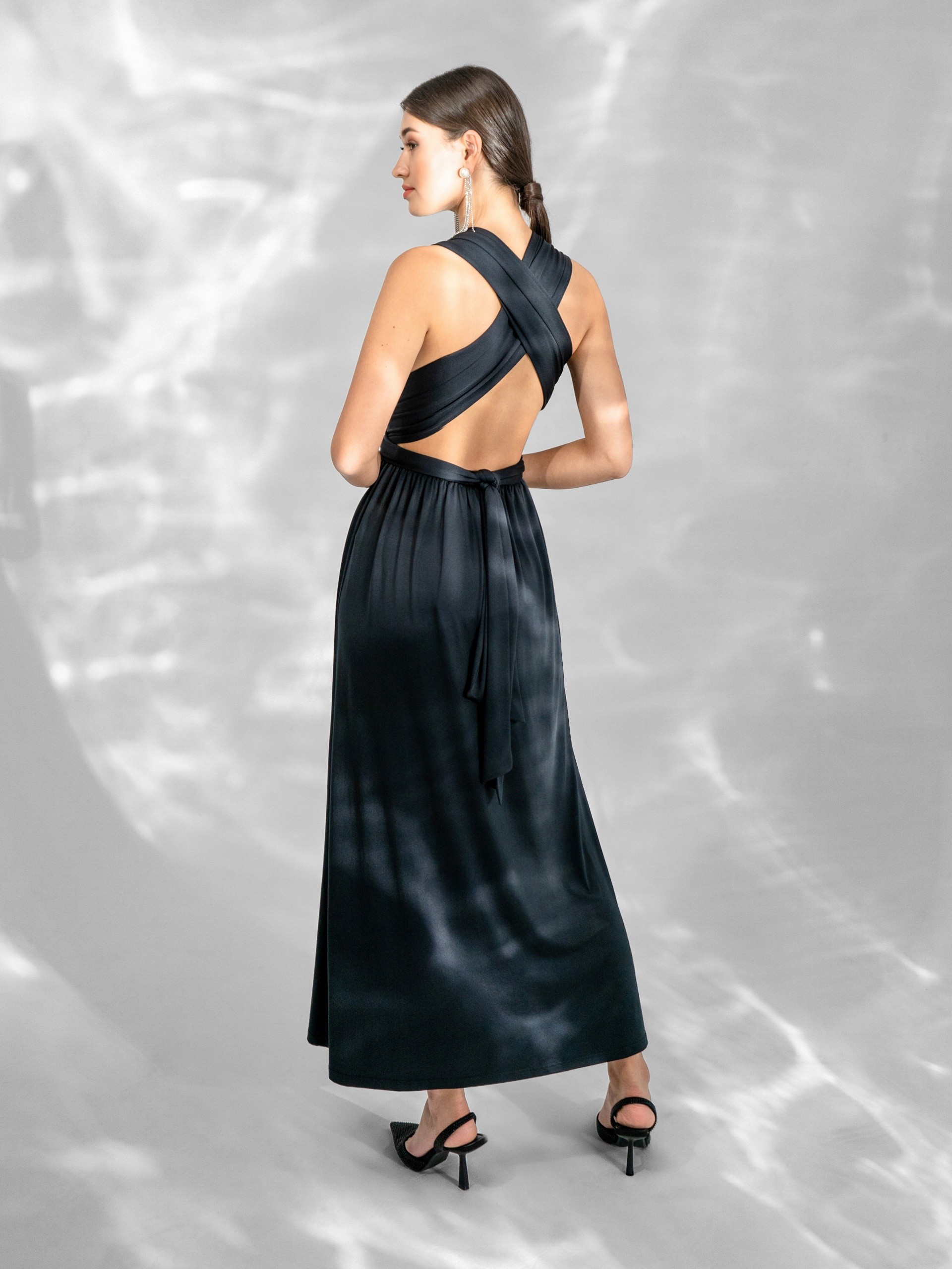 Платье из нежного трикотажа, в черном цвете, сделает из вас роковую богиню. Платье с резинкой на талии и перекресными лямками на спине.
