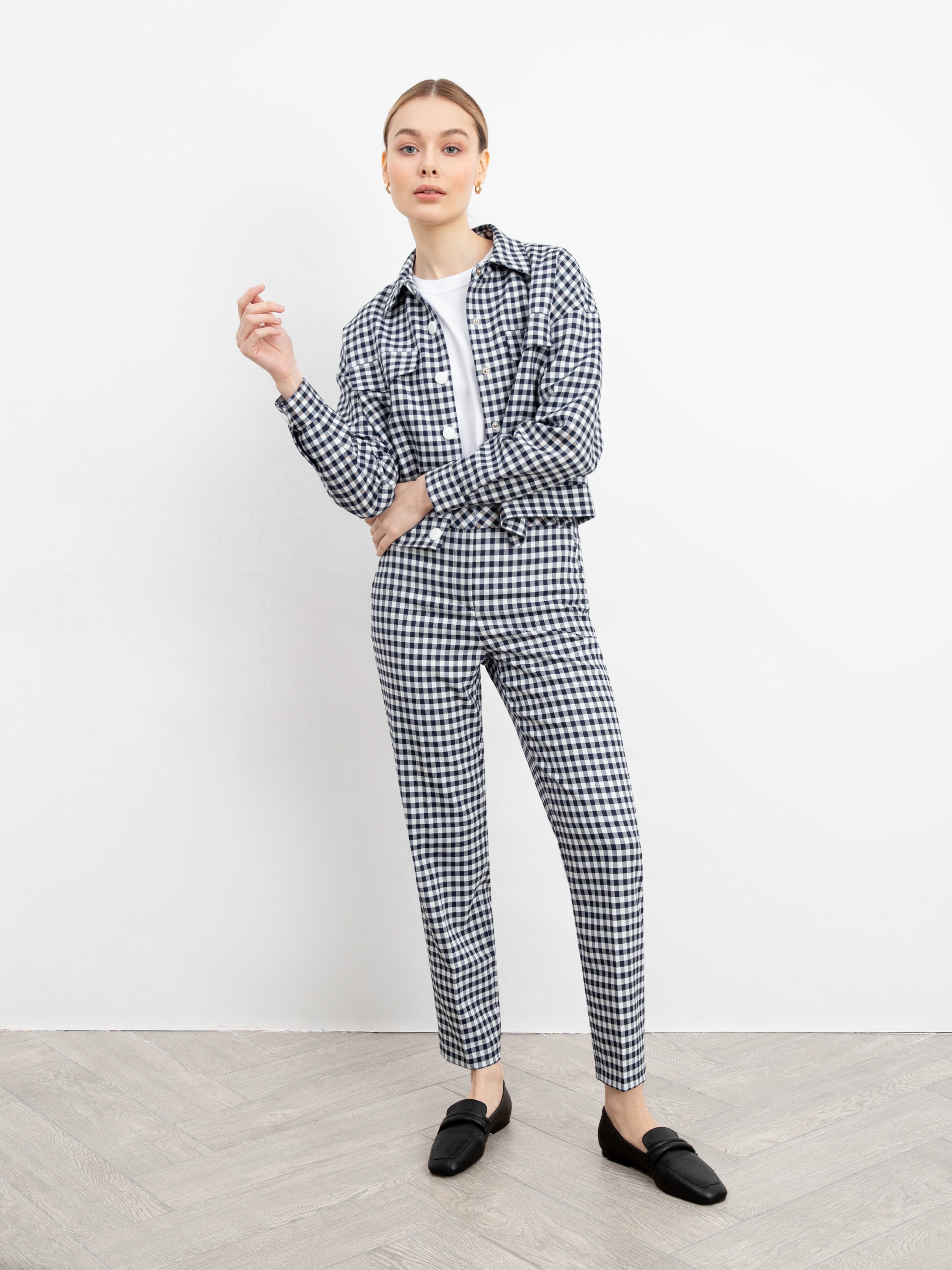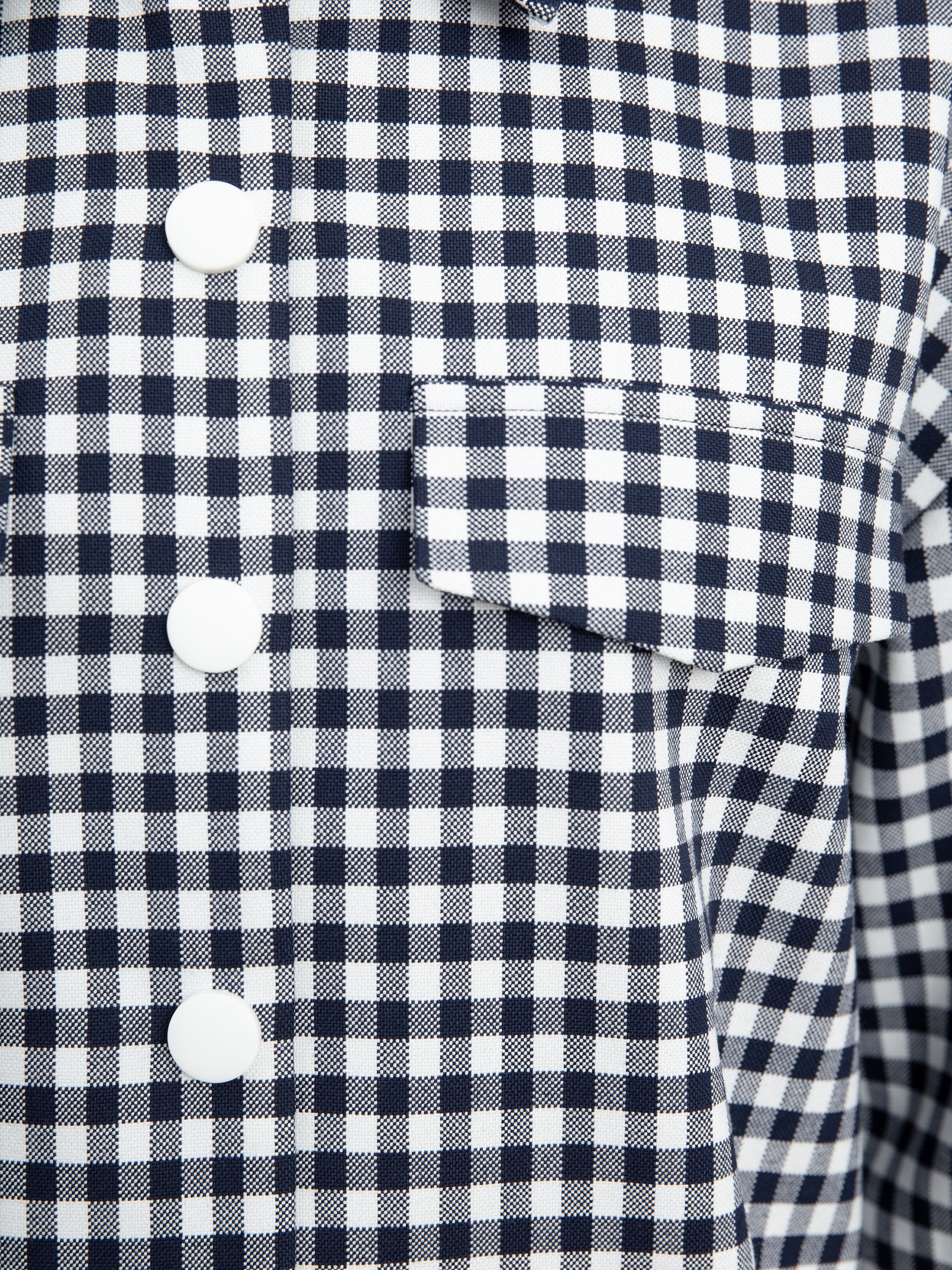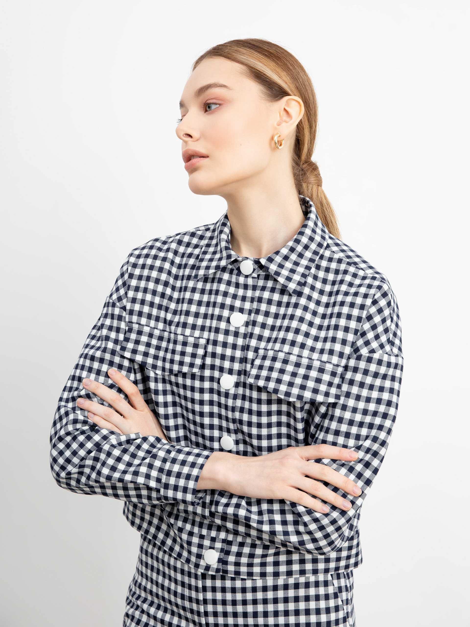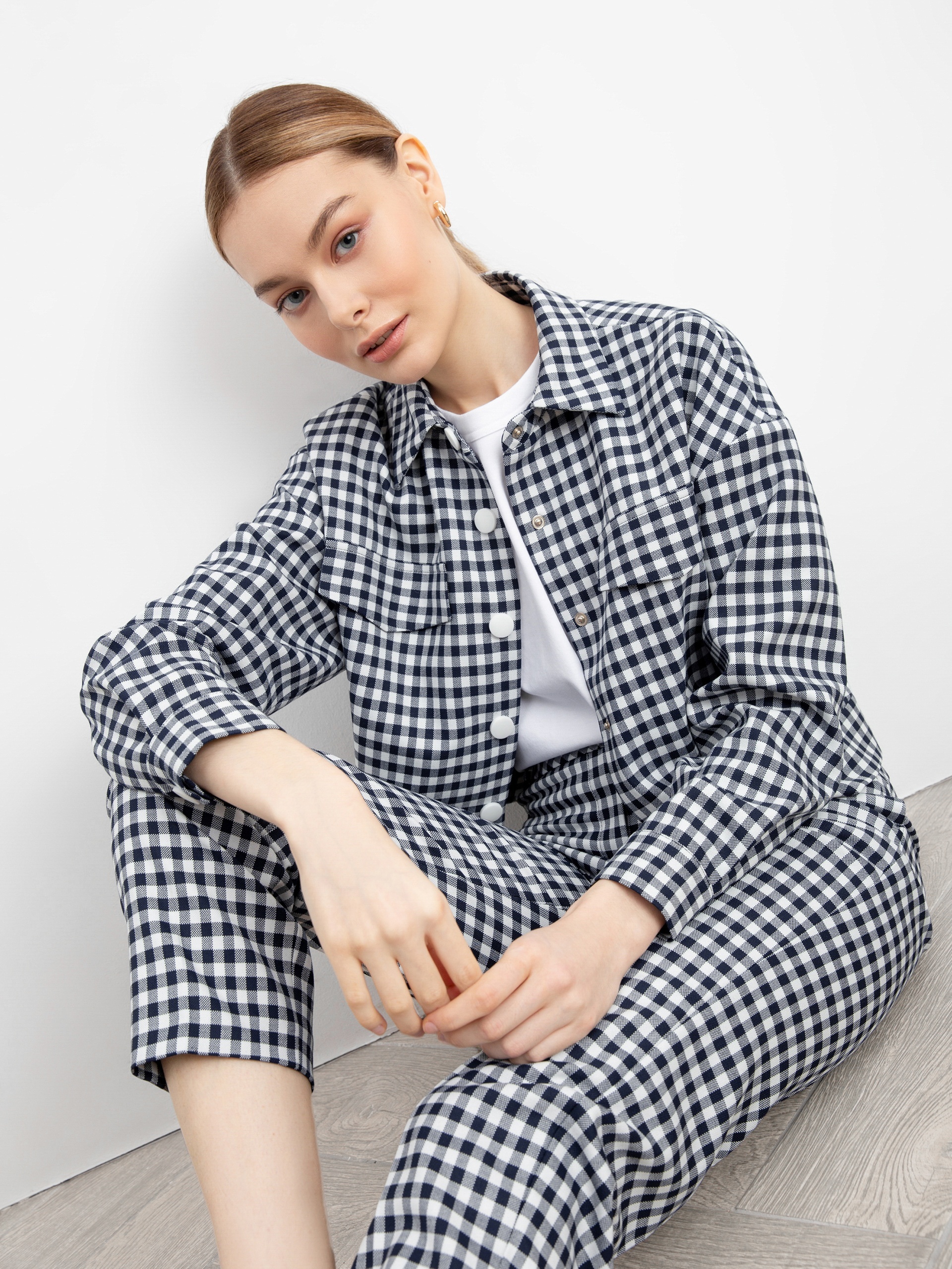 Трендовый жакет на подкладке прямого силуэта с классическим отложным воротником, спущенным плечом и рукавом на манжете. Спереди застежка на кнопки и накладные карманы.