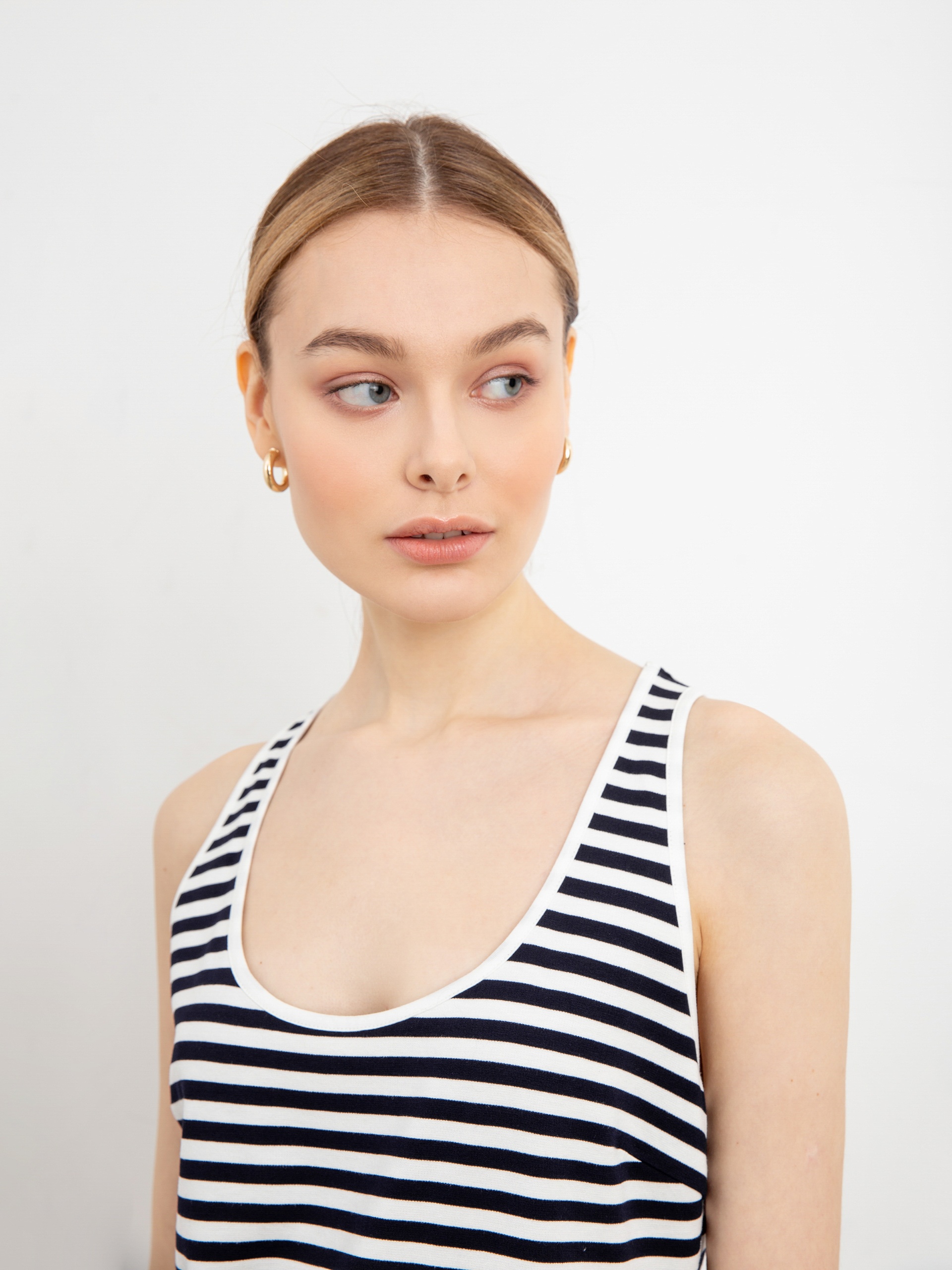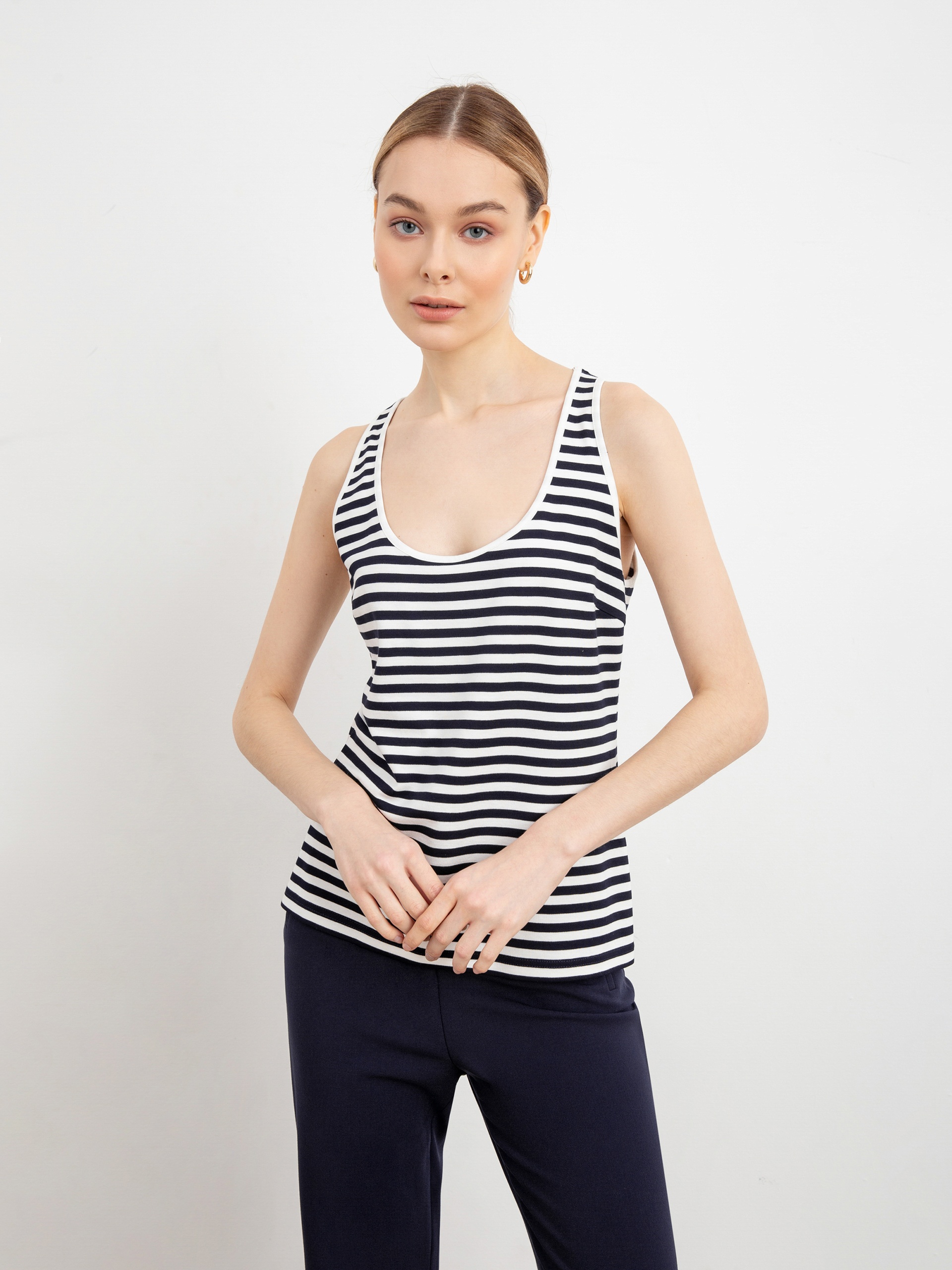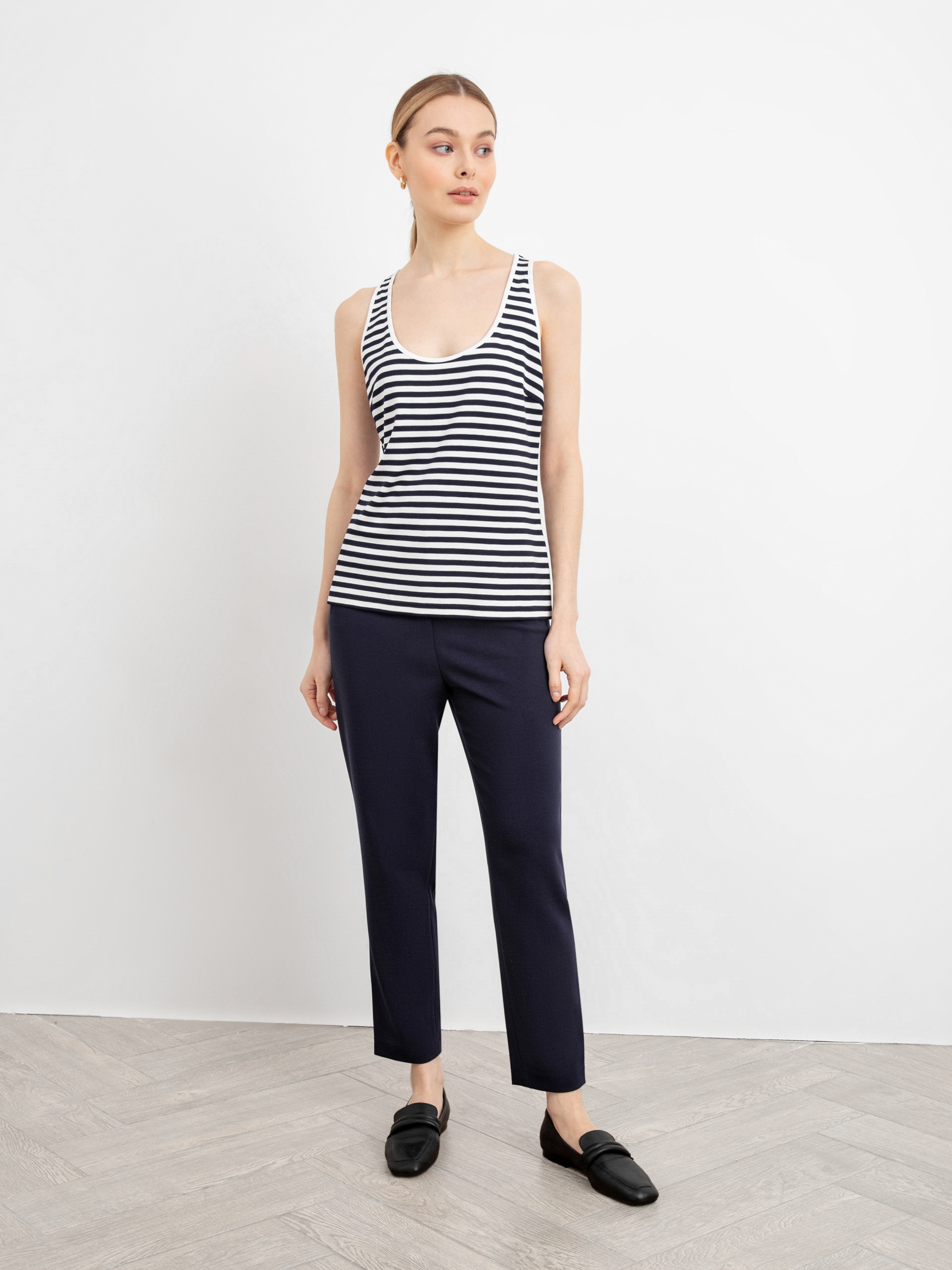 Базовая блуза в эффектную полоску без рукавов прямого силуэта с круглой горловиной. Незаменимая вещь для повседневных городских образов.