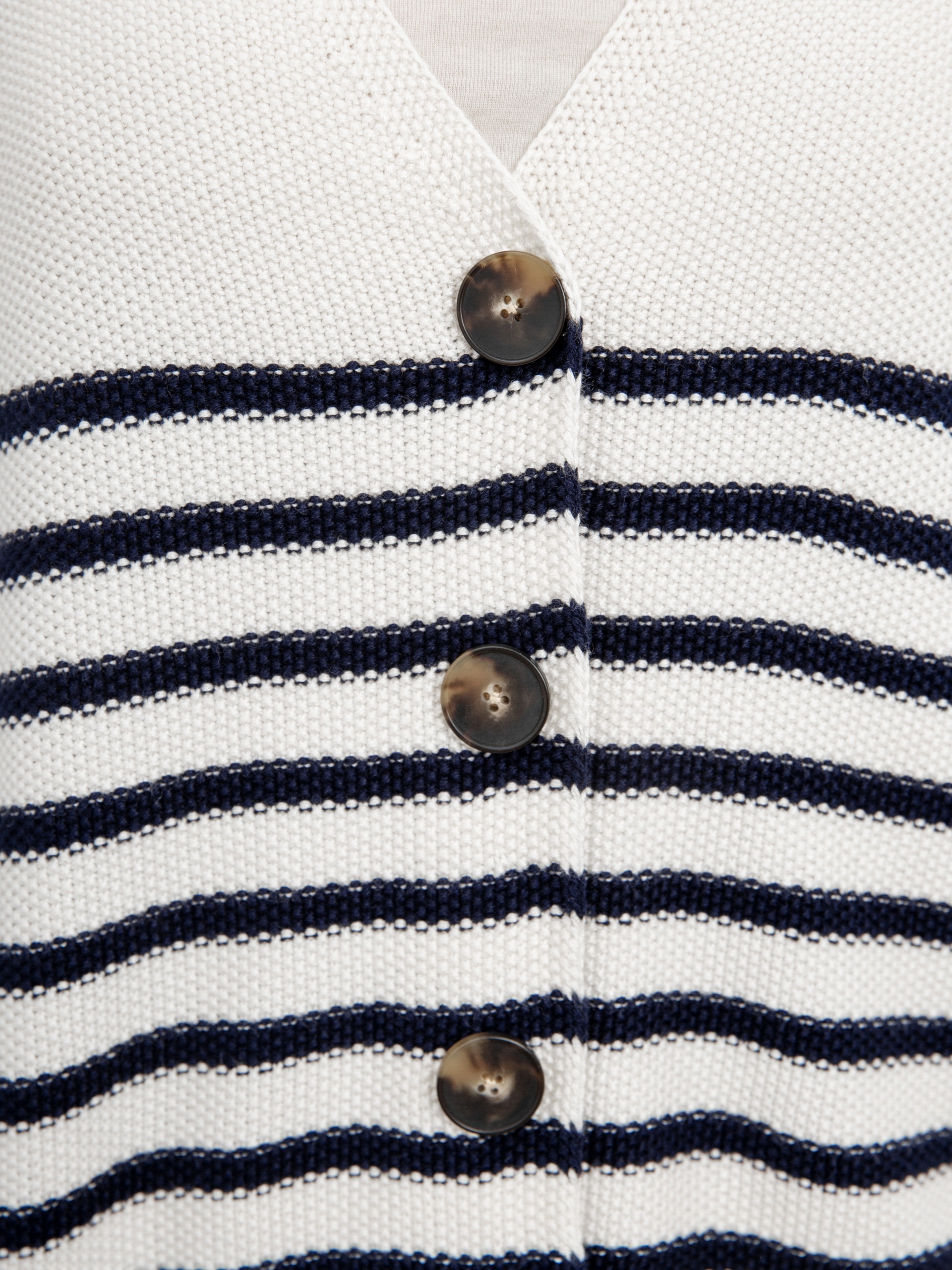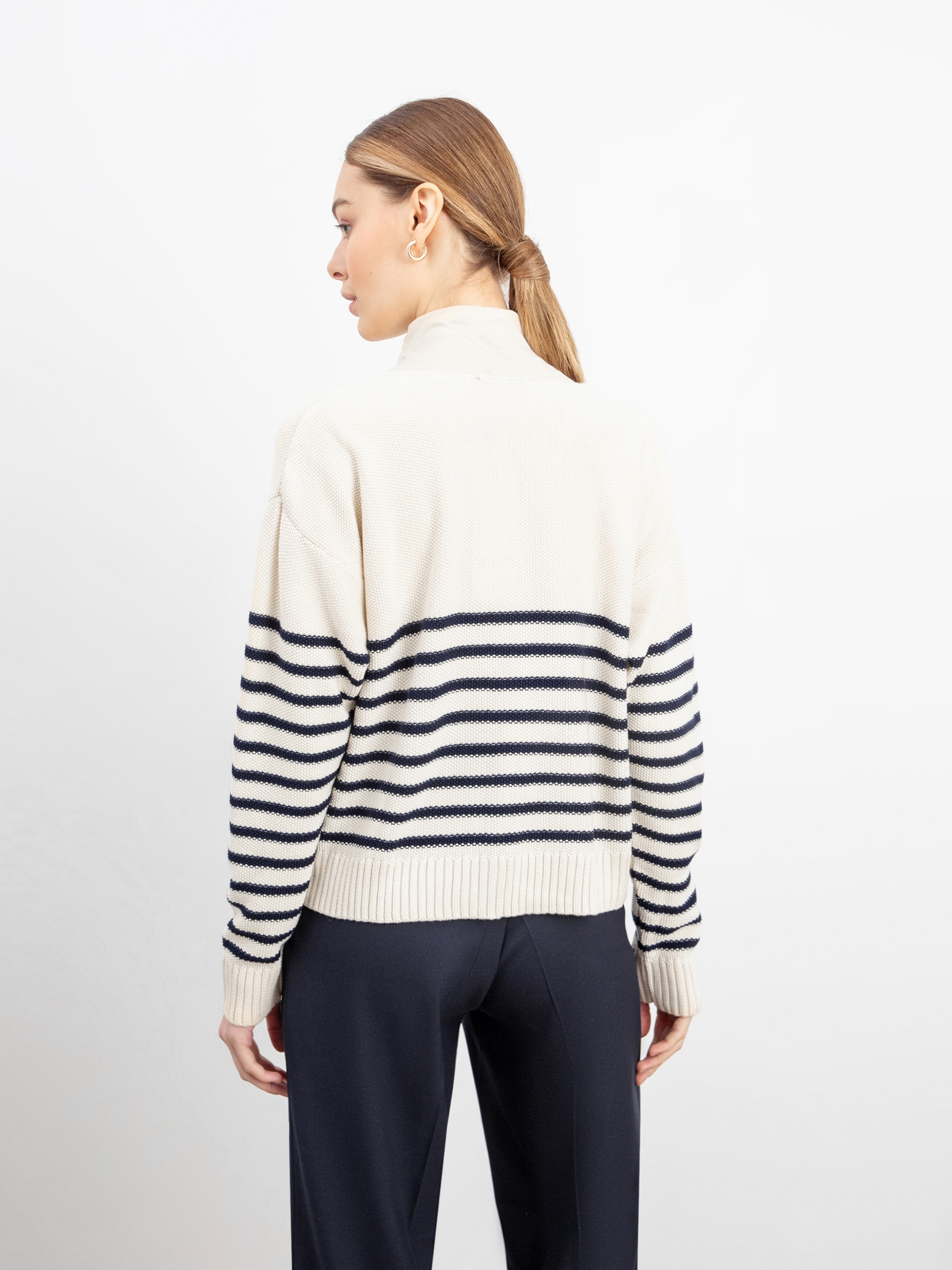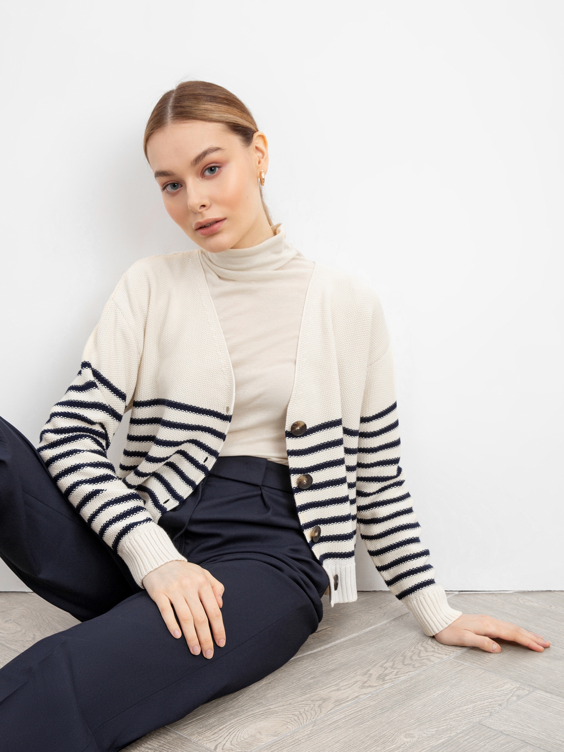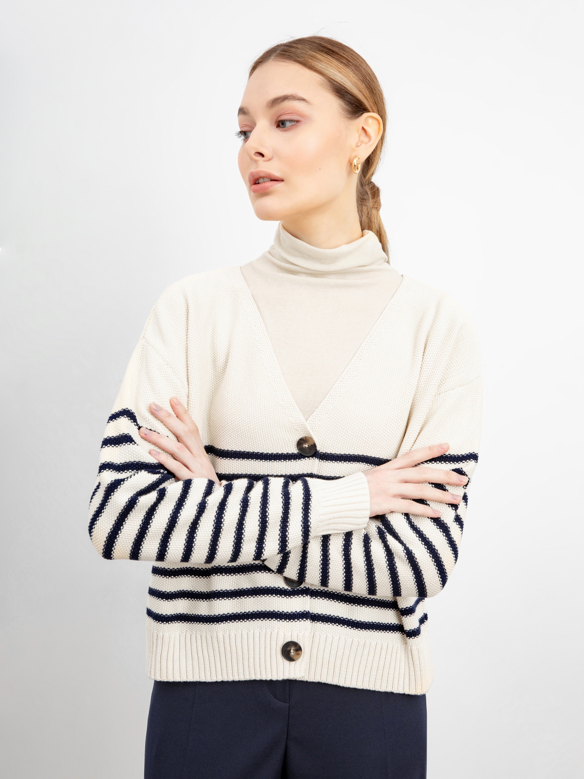 Стильный жакет в полоску из вязаного трикотажа с застежкой спереди на пуговицы. Идеально сочетается с джемпером в полоску из этой же капсулы.