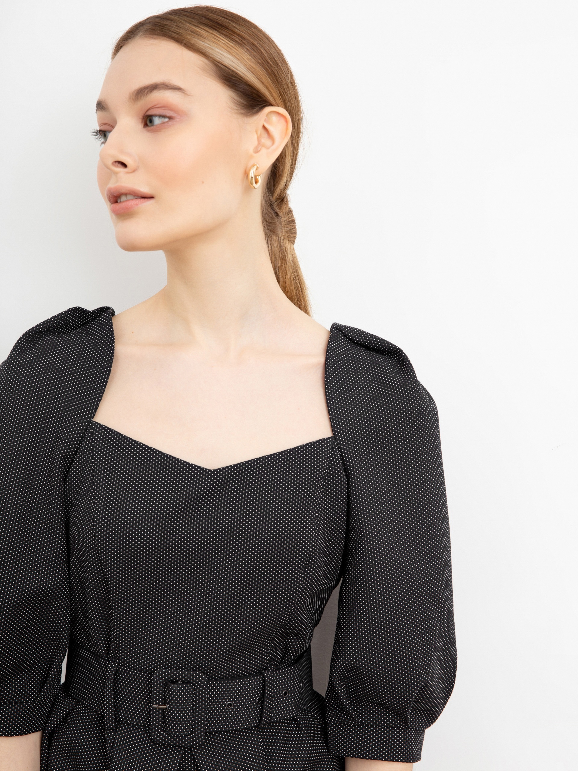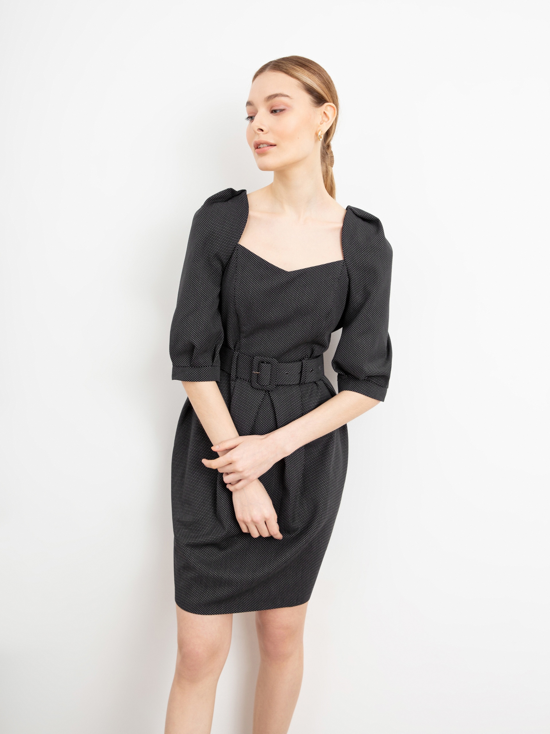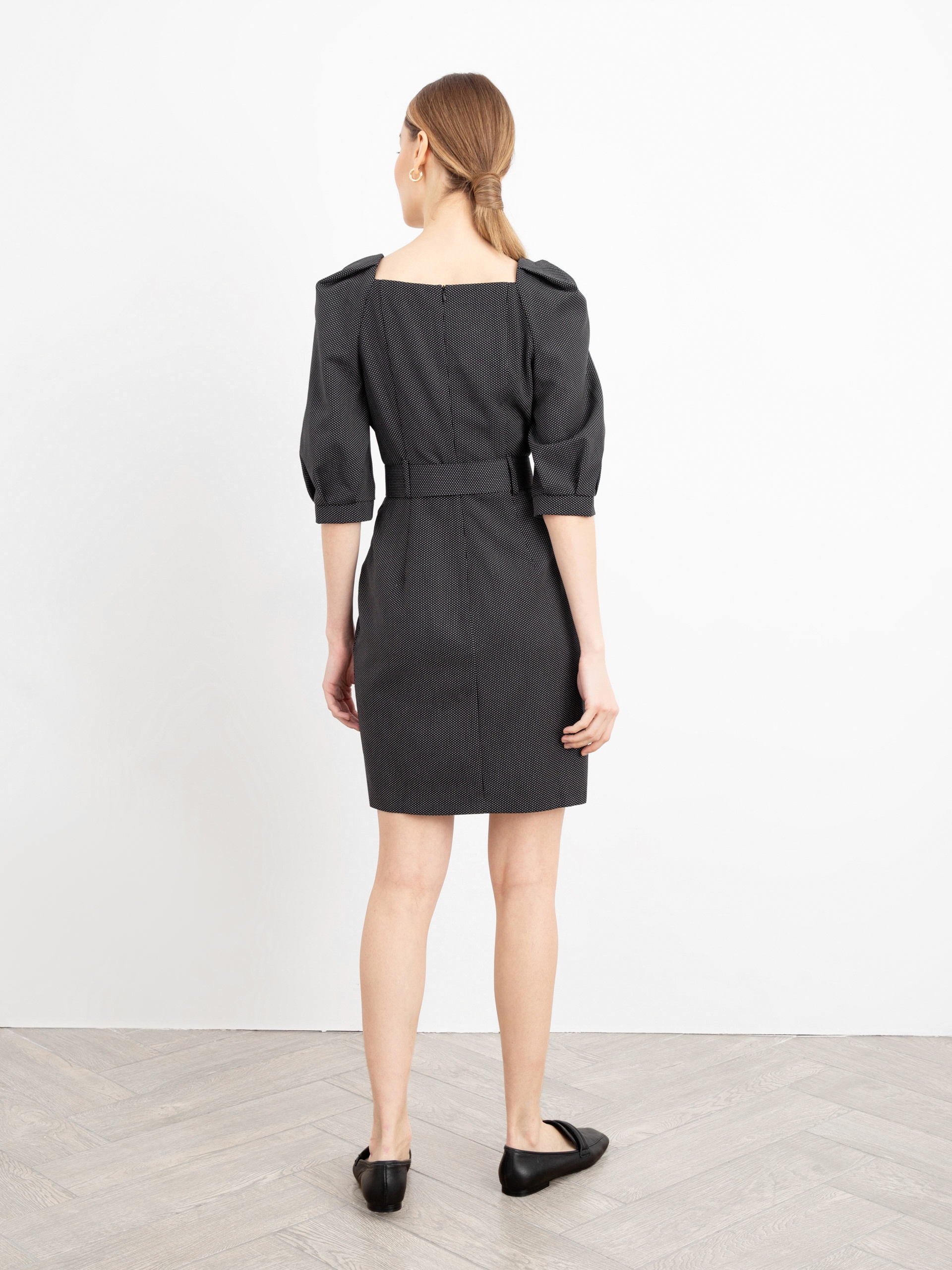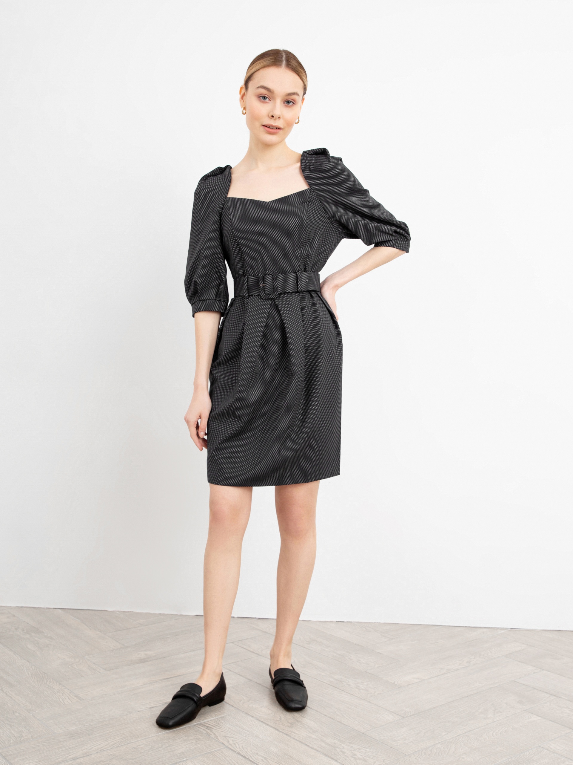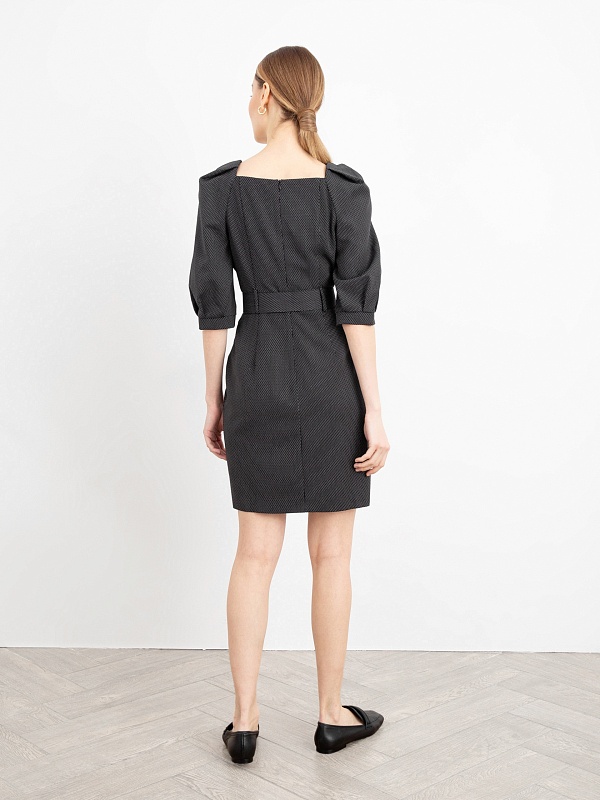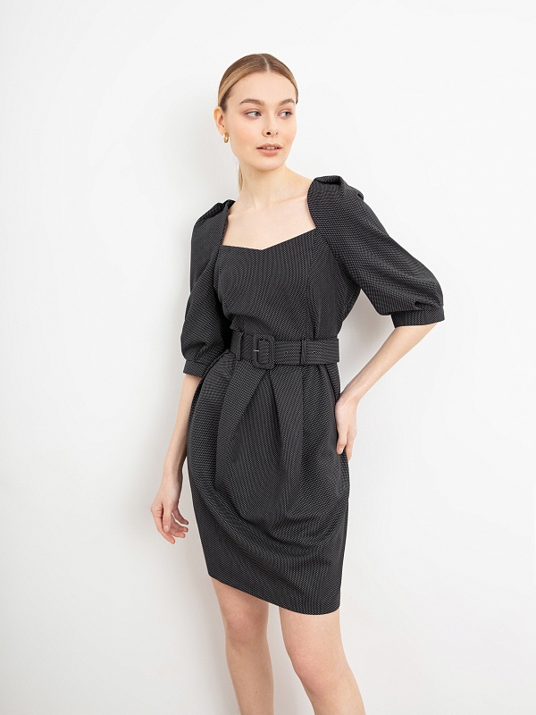 Женственное платье полуприлегающего силуэта с эффектными объемными рукавами и элегантным вырезом каре. На талии пояс из основной ткани с пряжкой. Застежка на потайную молнию.