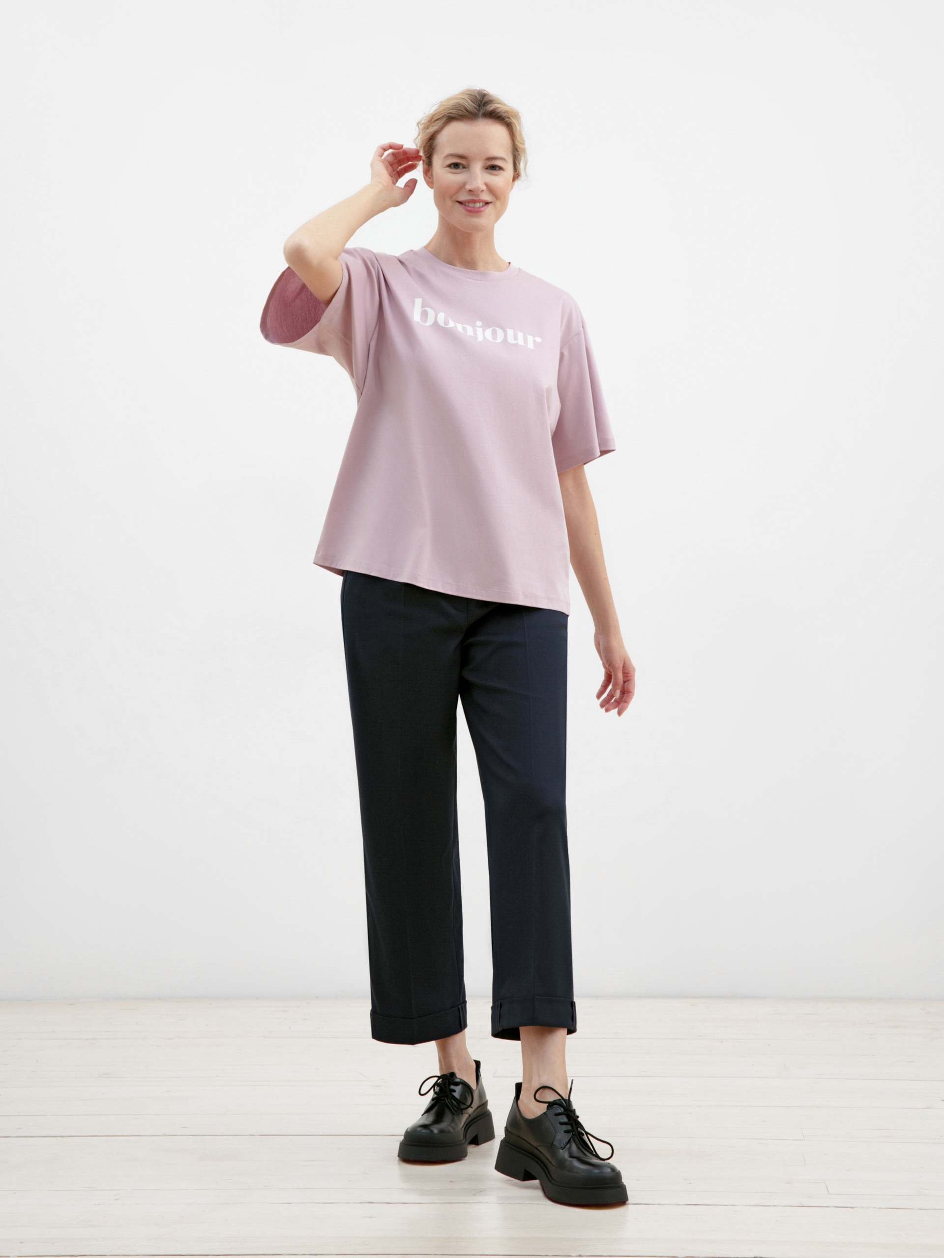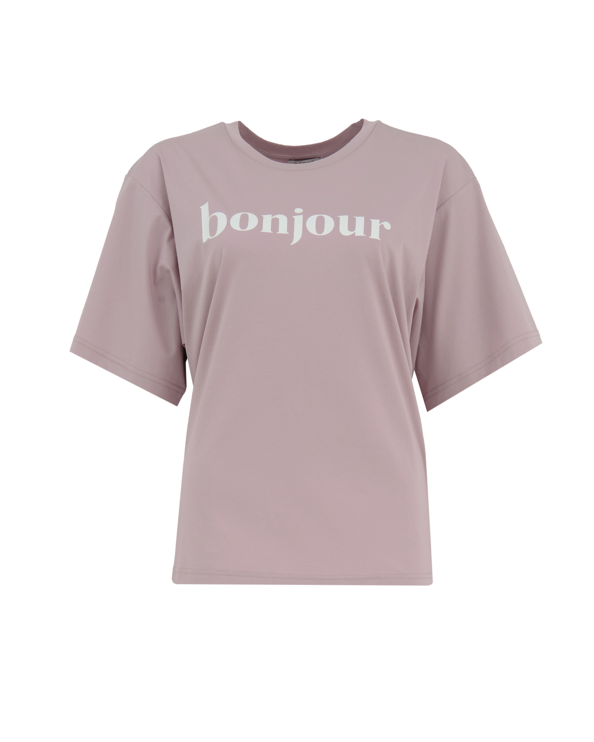 Базовая женская футболка свободного кроя лилового цвета с оригинальным принтом "Bonjour" прямого силуэта, с короткими рукавами и круглой горловиной.