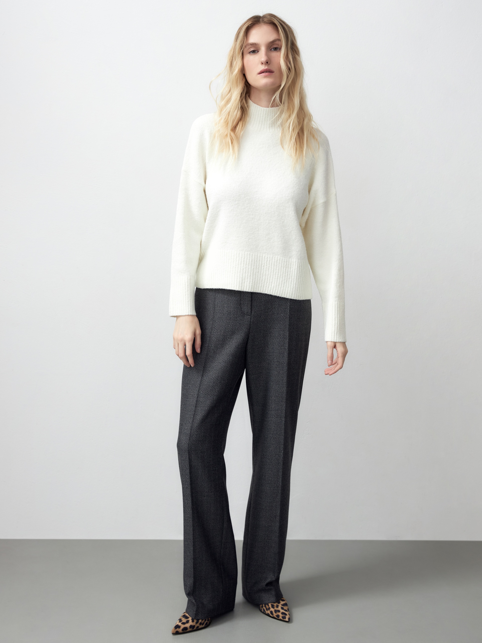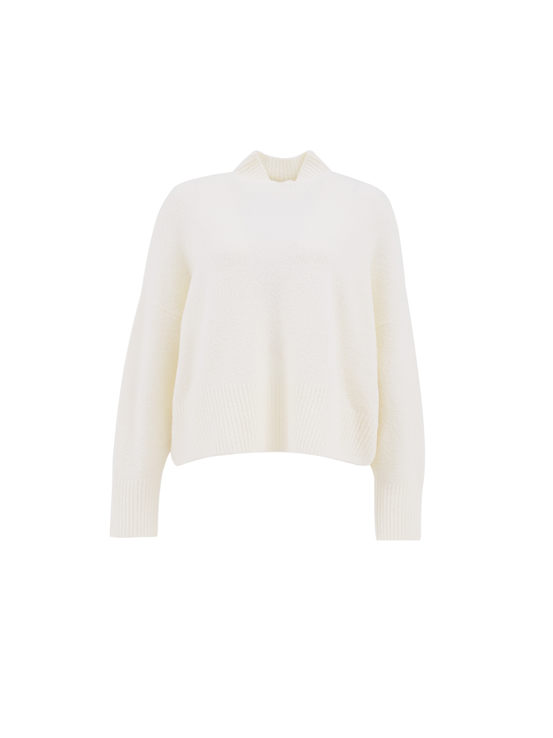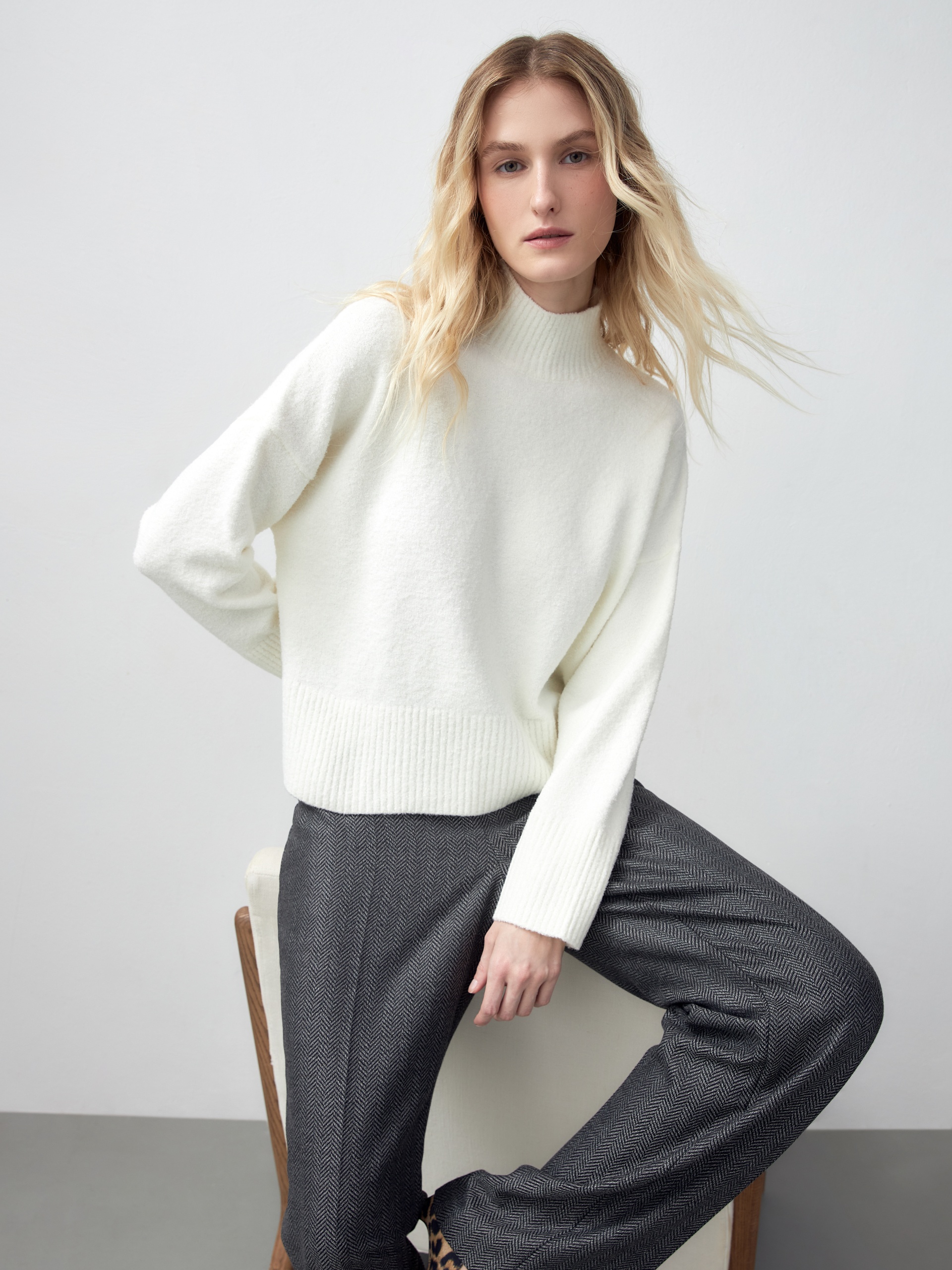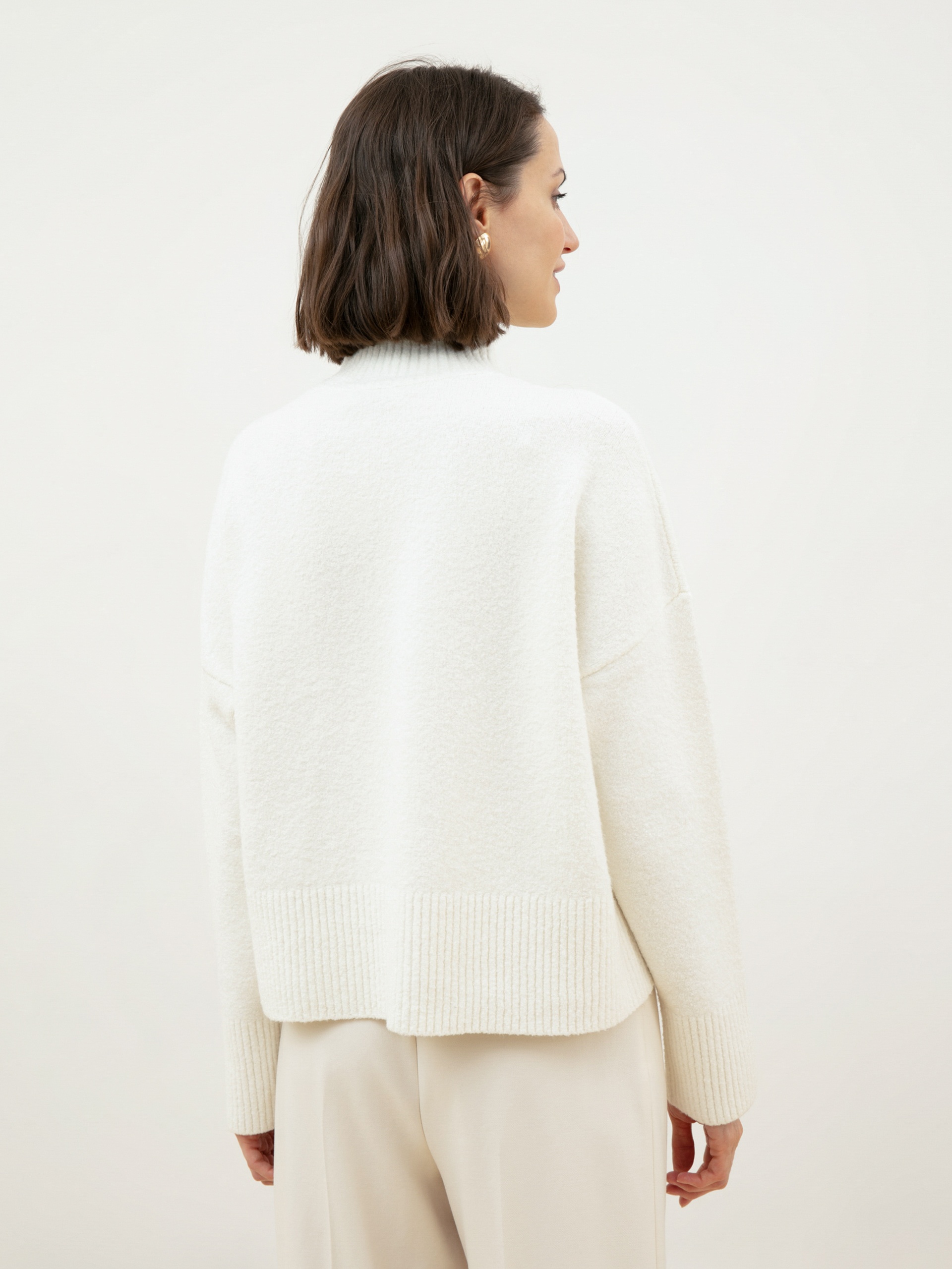 Уютный вязаный свитер из трикотажа прямого свободного силуэта с воротником-стойкой, спущенным плечом и рукавом полной длины.