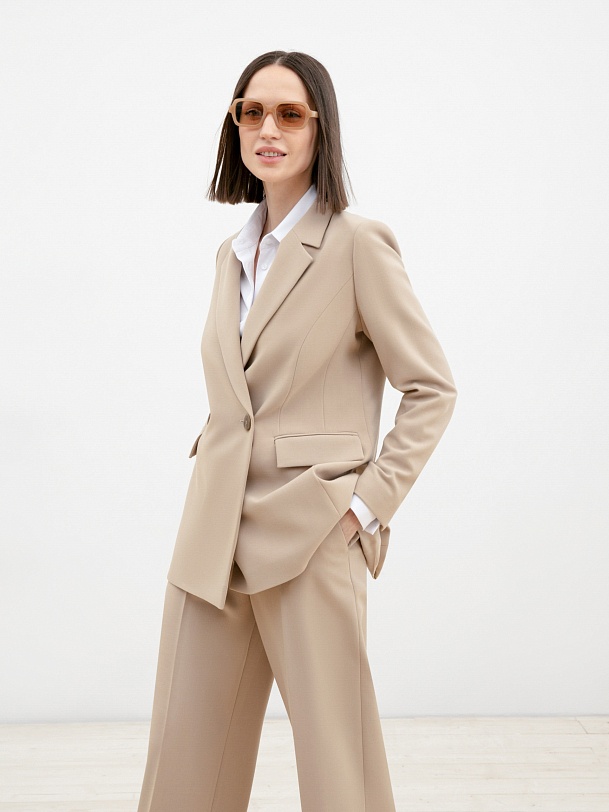 Элегантный жакет удлиненного полуприлегающего силуэта на подкладке, с втачным рукавом полной длины и английским воротником. Застежка спереди на пуговицы. Вертикальные рельефы подчеркивают силуэт.