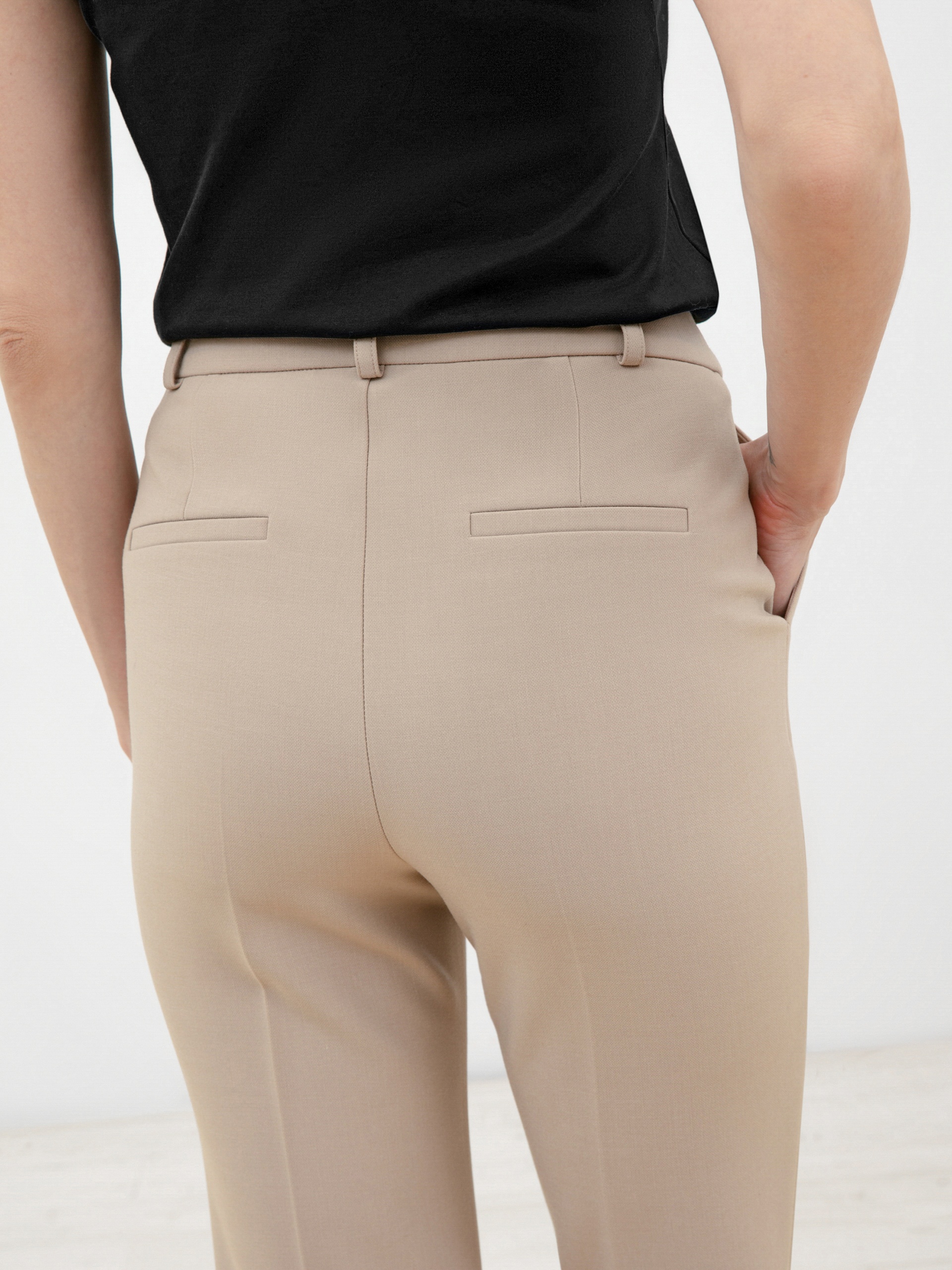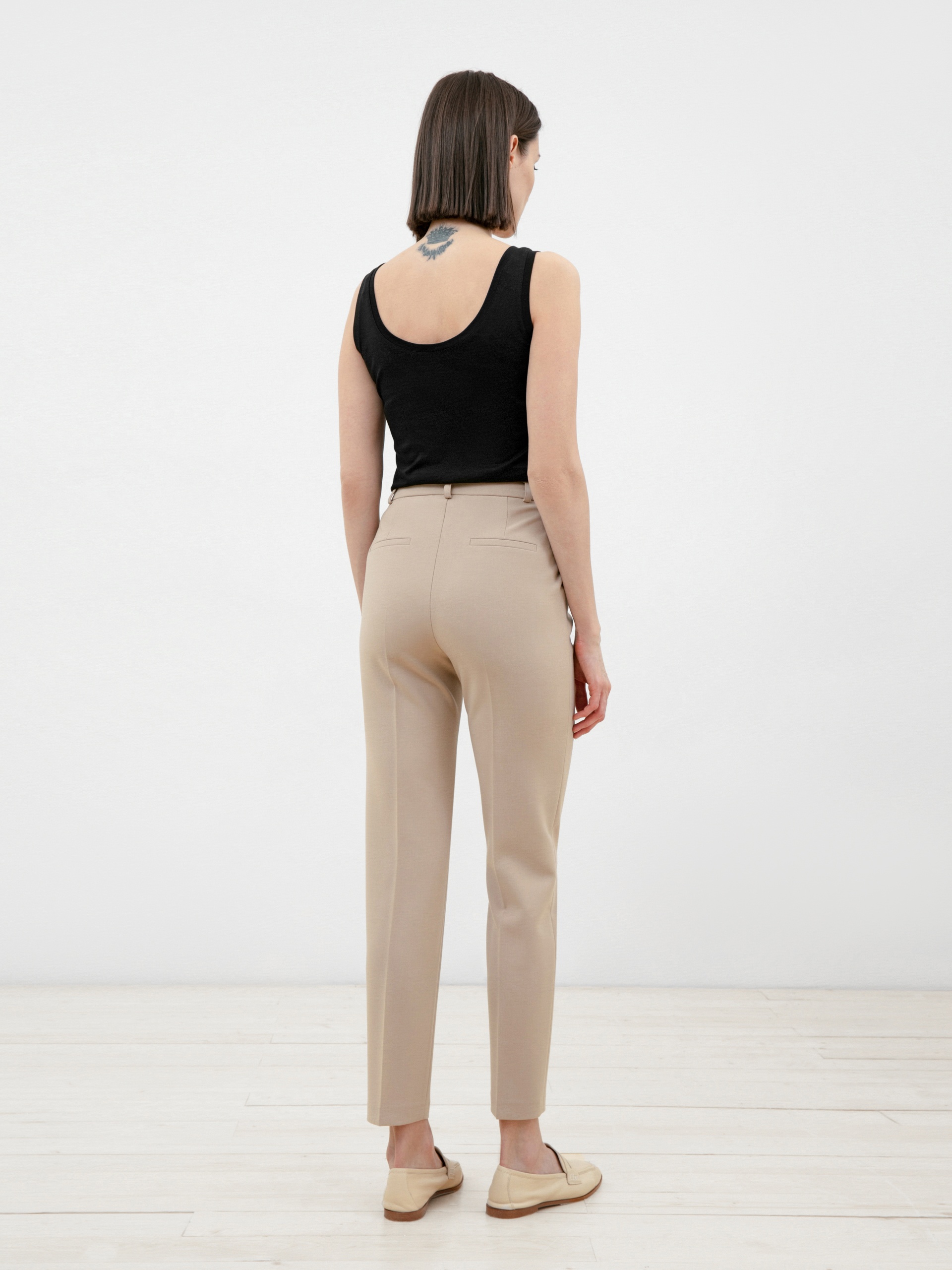 Стильные брюки со стрелками зауженного к низу силуэта на притачном поясе. Застежка спереди на молнию. Карманы рабочие в боковых швах. Сзади карманы листочки.