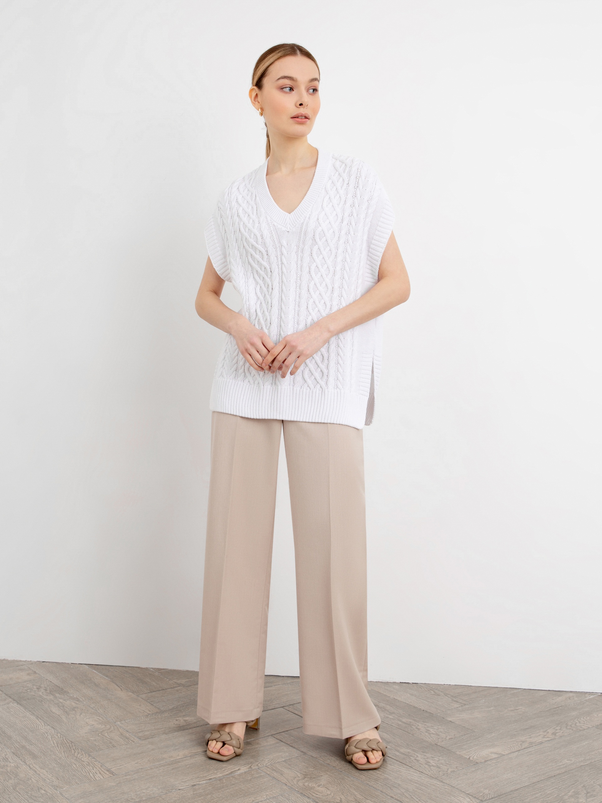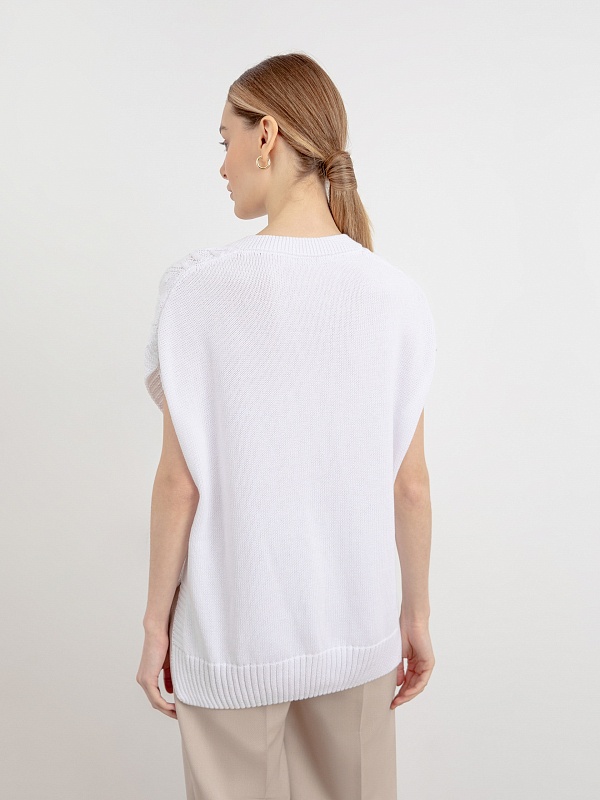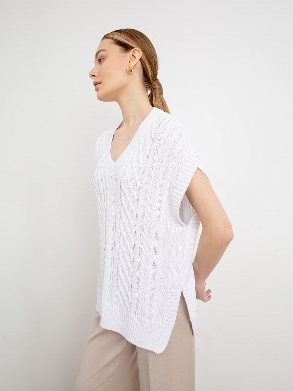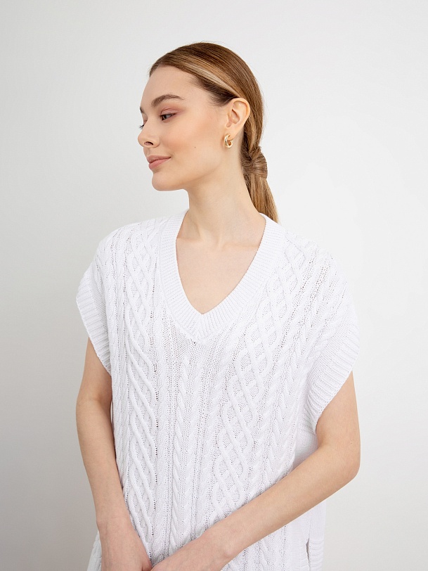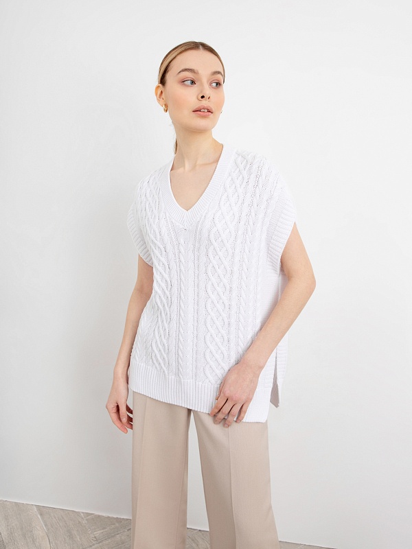 Трендовый жилет из вязаного трикотажа с v-образным вырезом горловины и коротким рукавом кимоно. Актуальные объемные косы добавят фактурности в повседневные городские образы.