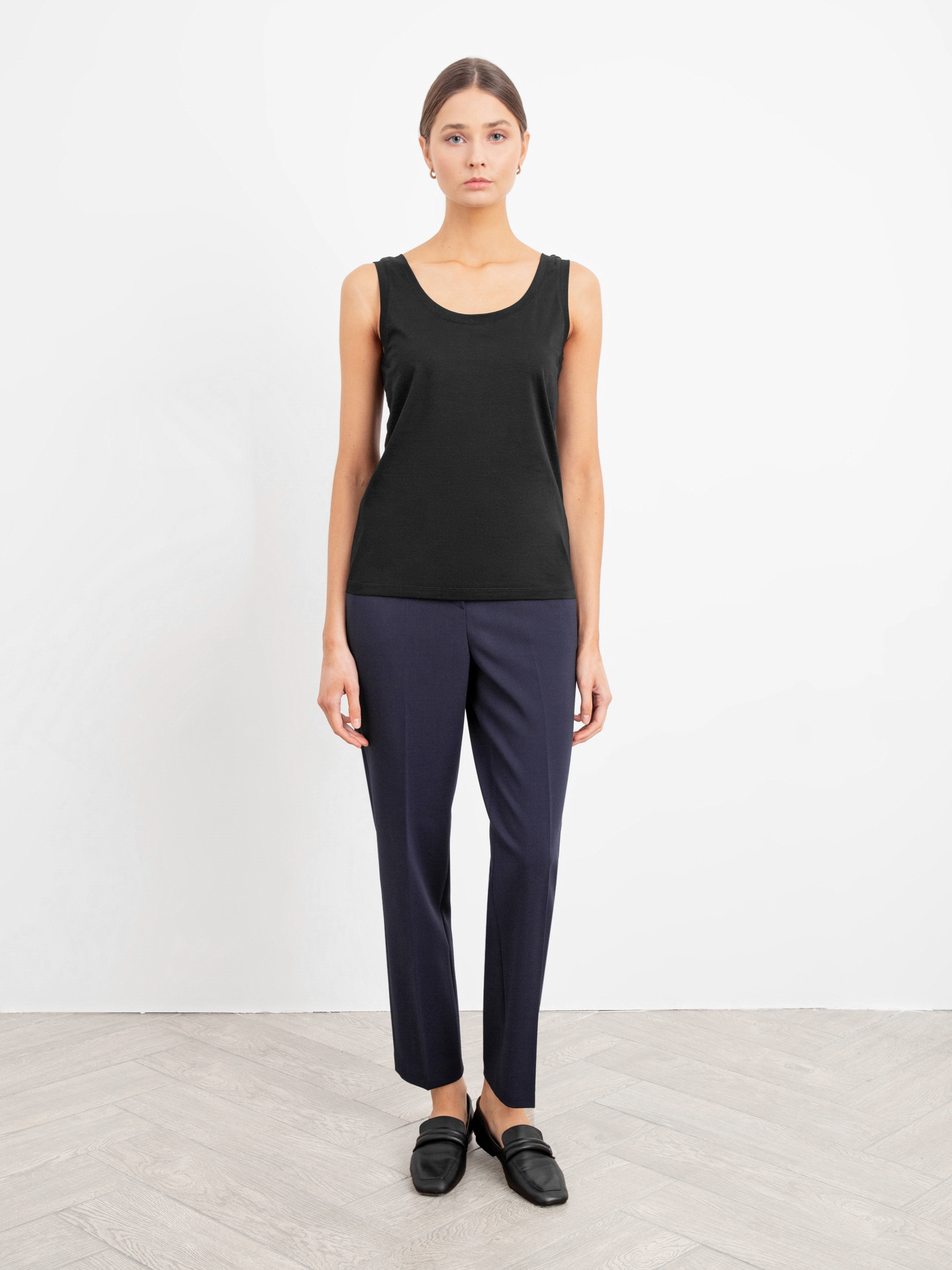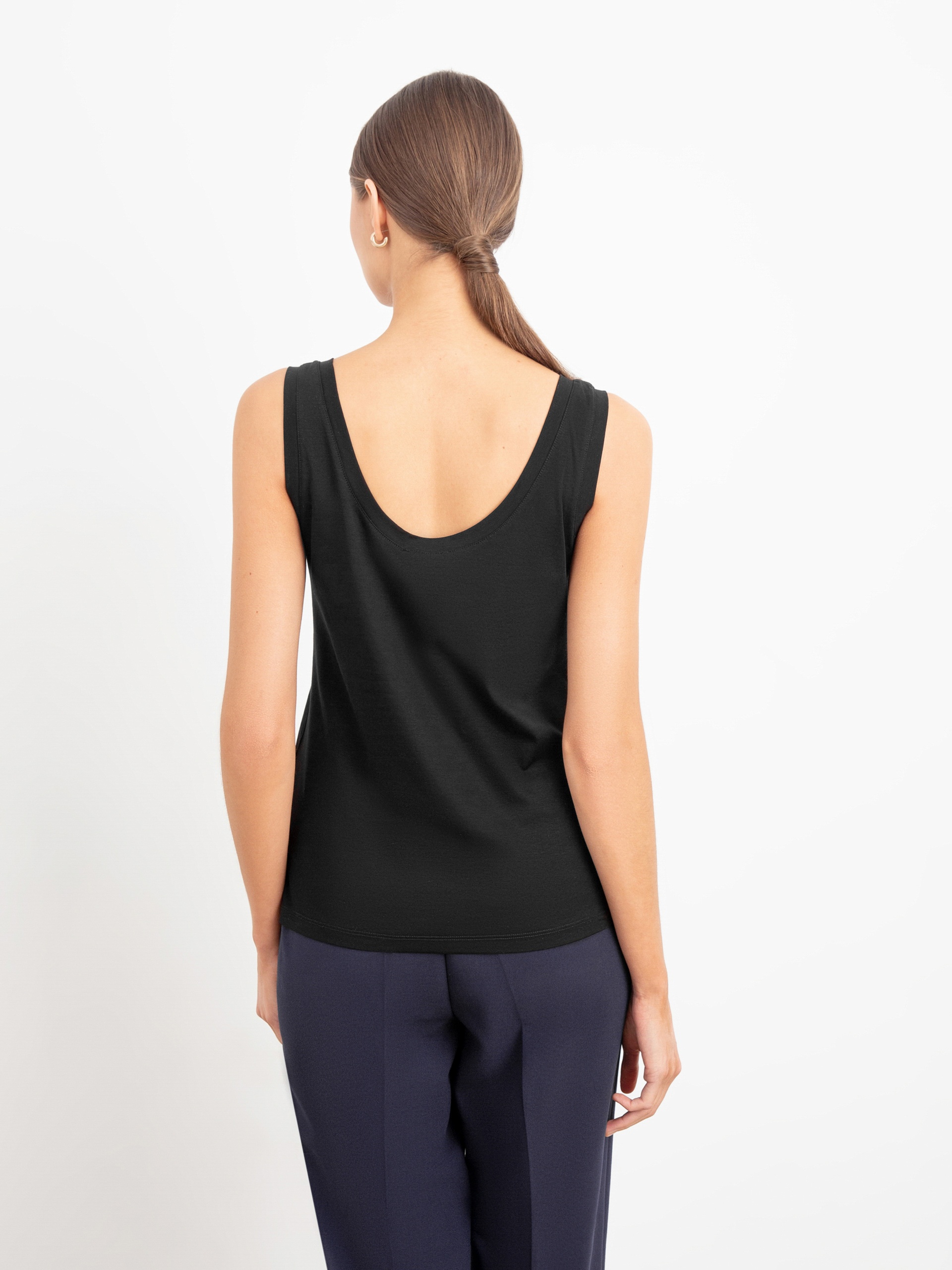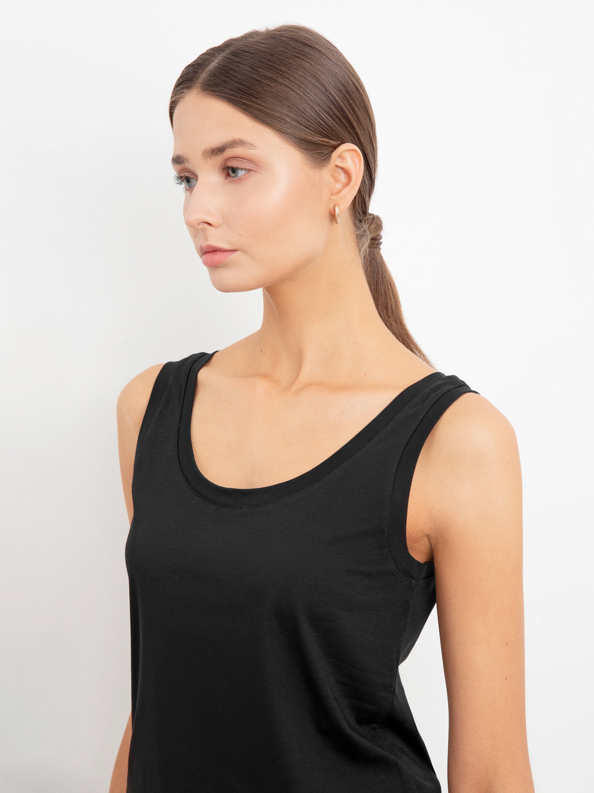 Базовый женский топ черного цвета прилегающего силуэта из фактурного трикотажного полотна без рукавов, с глубоким круглым вырезом горловины. Незаменимая вещь для создания стильных образов на каждый день.