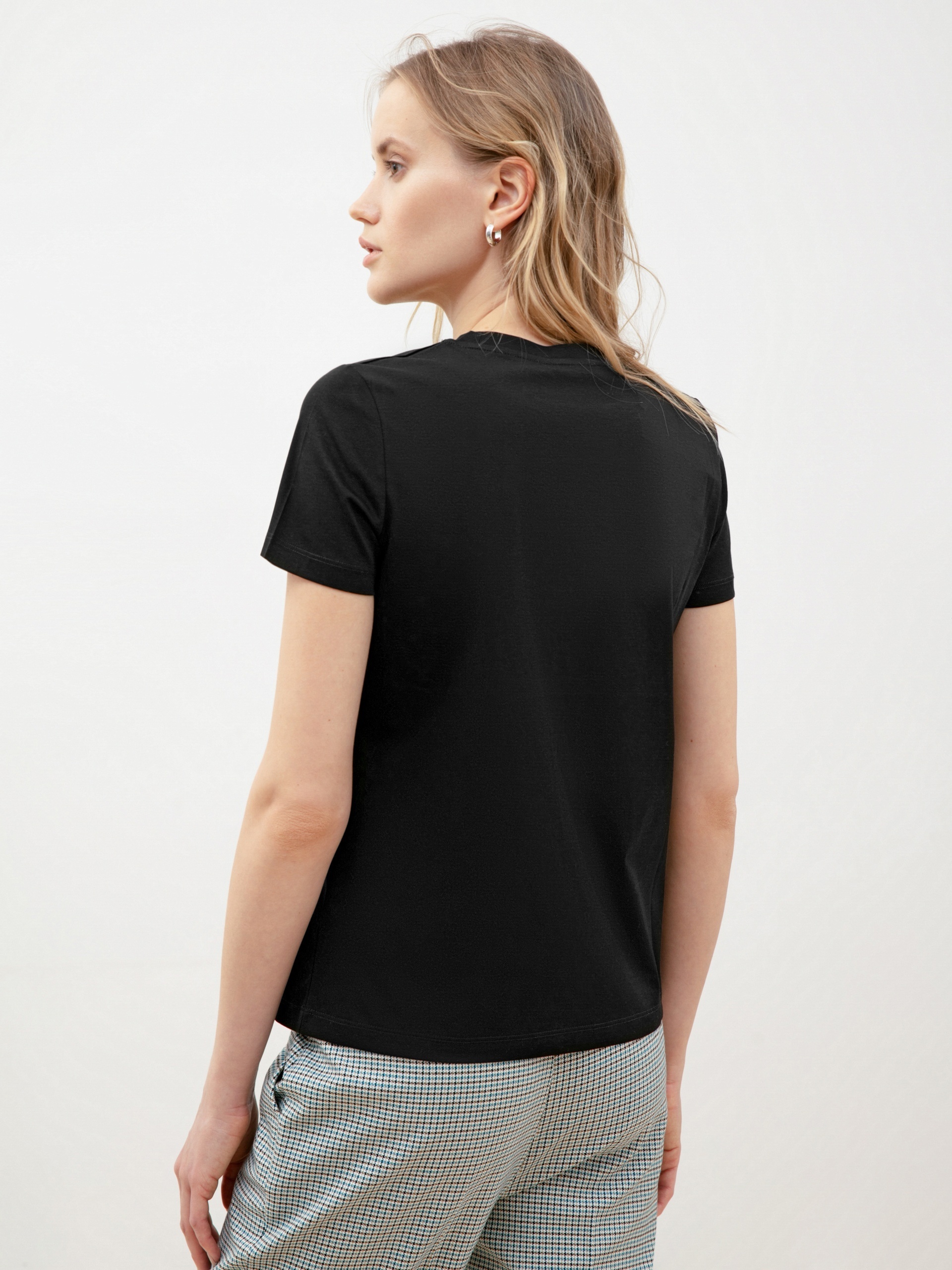 Базовая женская футболка черного цвета полуприлегающего силуэта с круглой горловиной и короткими втачными рукавами. Идеальный вариант для базовых городских образов.
