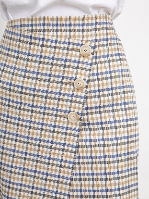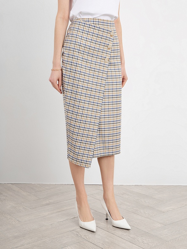 Стильная юбка-карандаш длины миди с декоративным запахом и акцентными пуговицами. Застежка сбоку на потайную молнию. Незаменимая вещь для ярких городских образов.