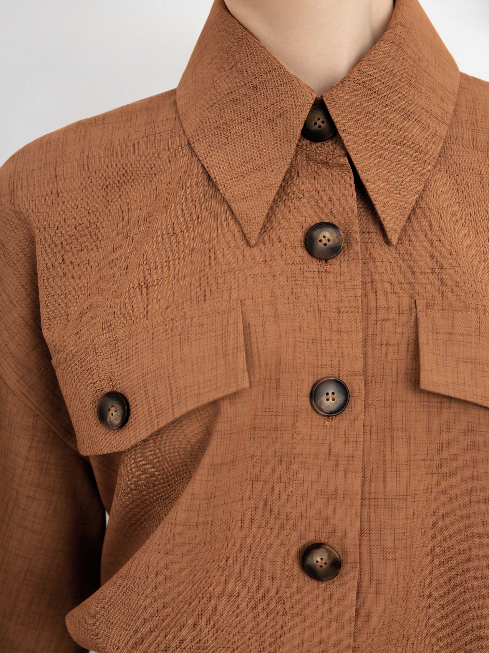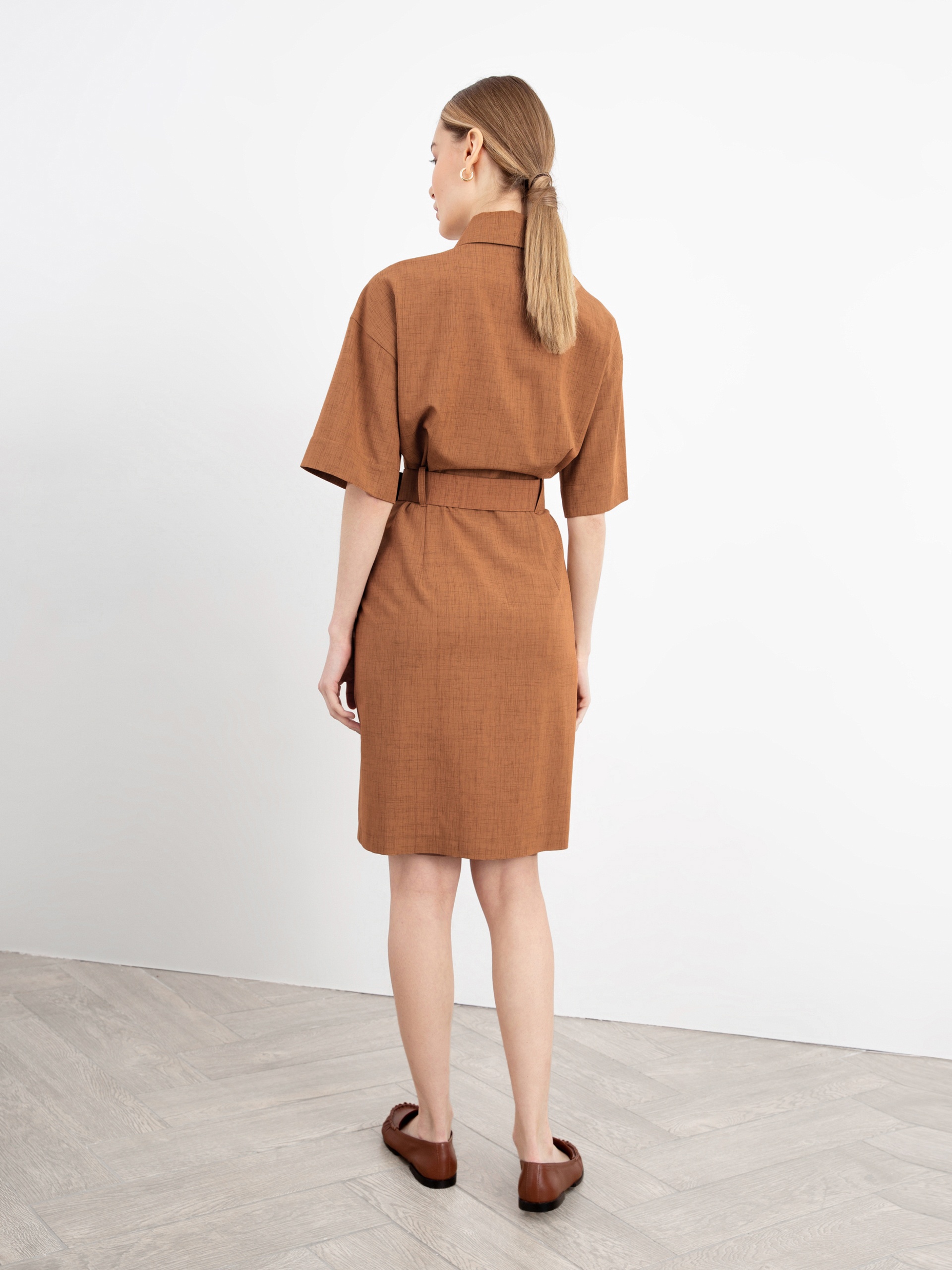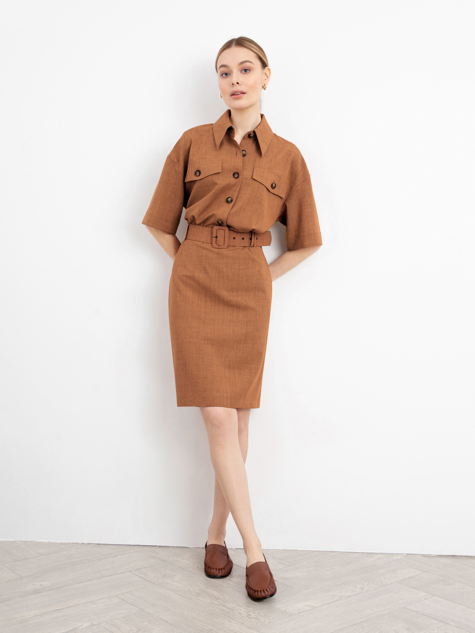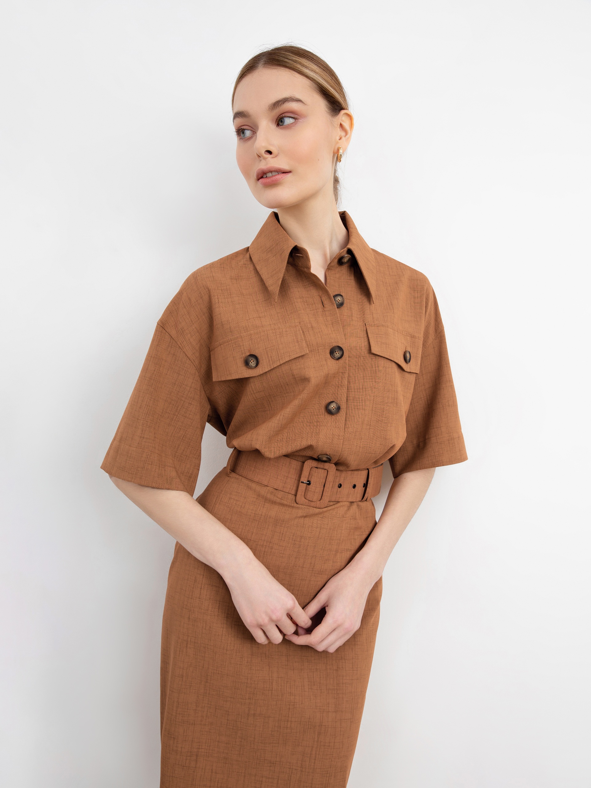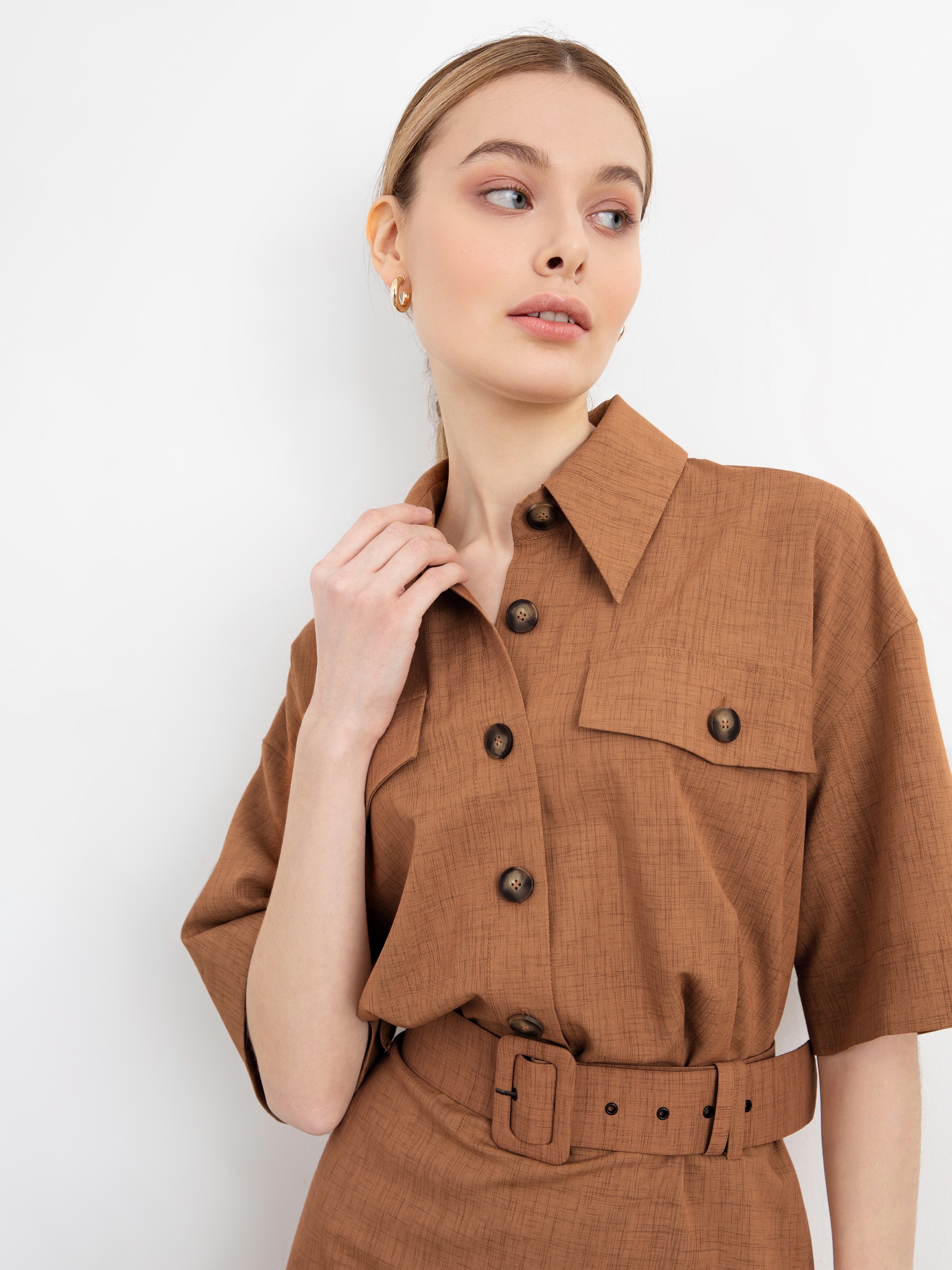 Трендовое платье полуприлегающего силуэта с широким рукавом кимоно, модным удлиненным воротником и крупными накладными карманами с патами. Рабочие карманы в боковых швах. Застежка спереди на пуговицы. На талии съемный пояс с пряжкой.