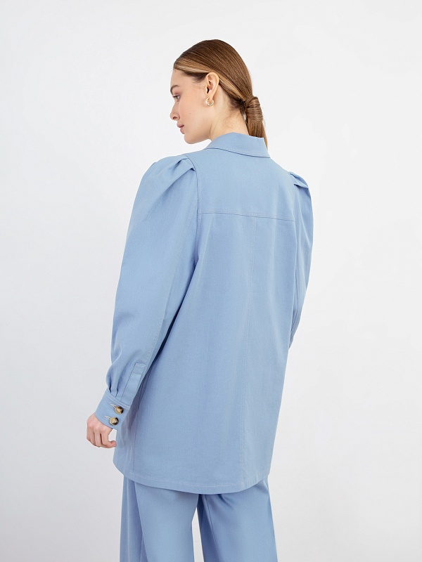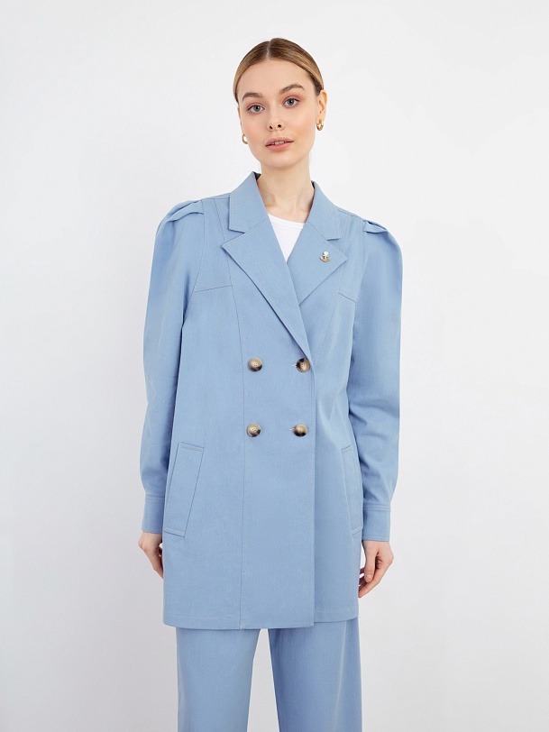 Трендовый двубортный жакет из джинсовой ткани в стиле оверсайз с крупным английским воротником, большими накладными карманами и втачным рукавом со складками и манжетами. Застежка спереди на пуговицы. Модель идеально сочетается с брюками из этой же ткани.