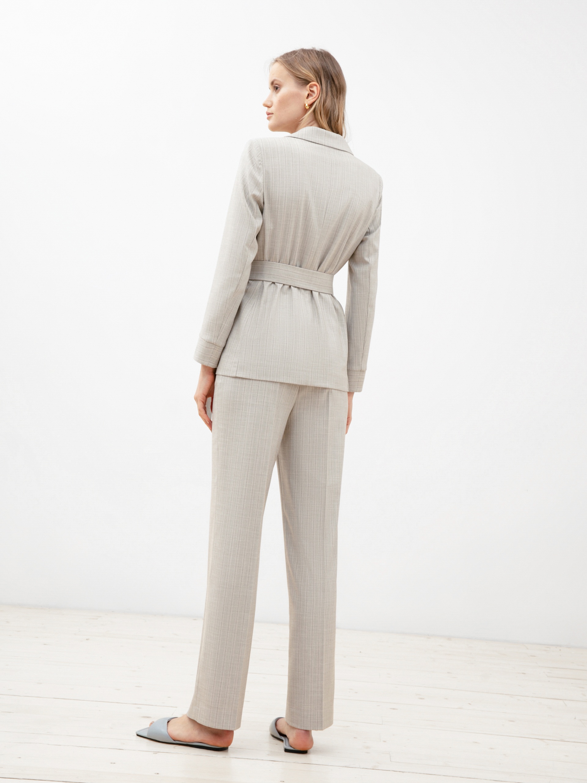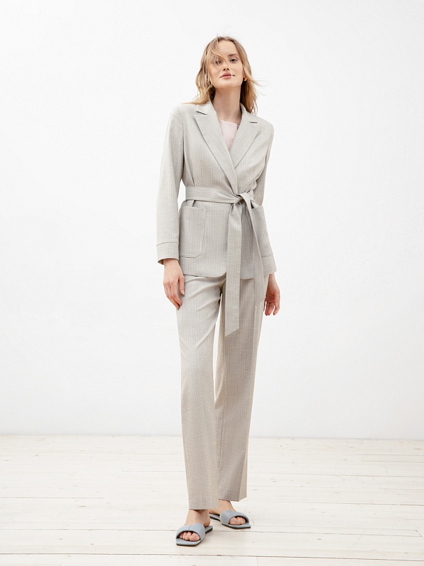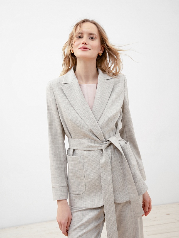 Жакет из мягкой костюмной ткани с вискозой в составе полуприлегающего силуэта с английским воротником, втачным рукавом и крупными накладными карманами. Застежка спереди на пуговицу. В комплекте съемный пояс из ткани для создания более приталенного силуэта. Модел идеально сочетается с брюками из такой же ткани.