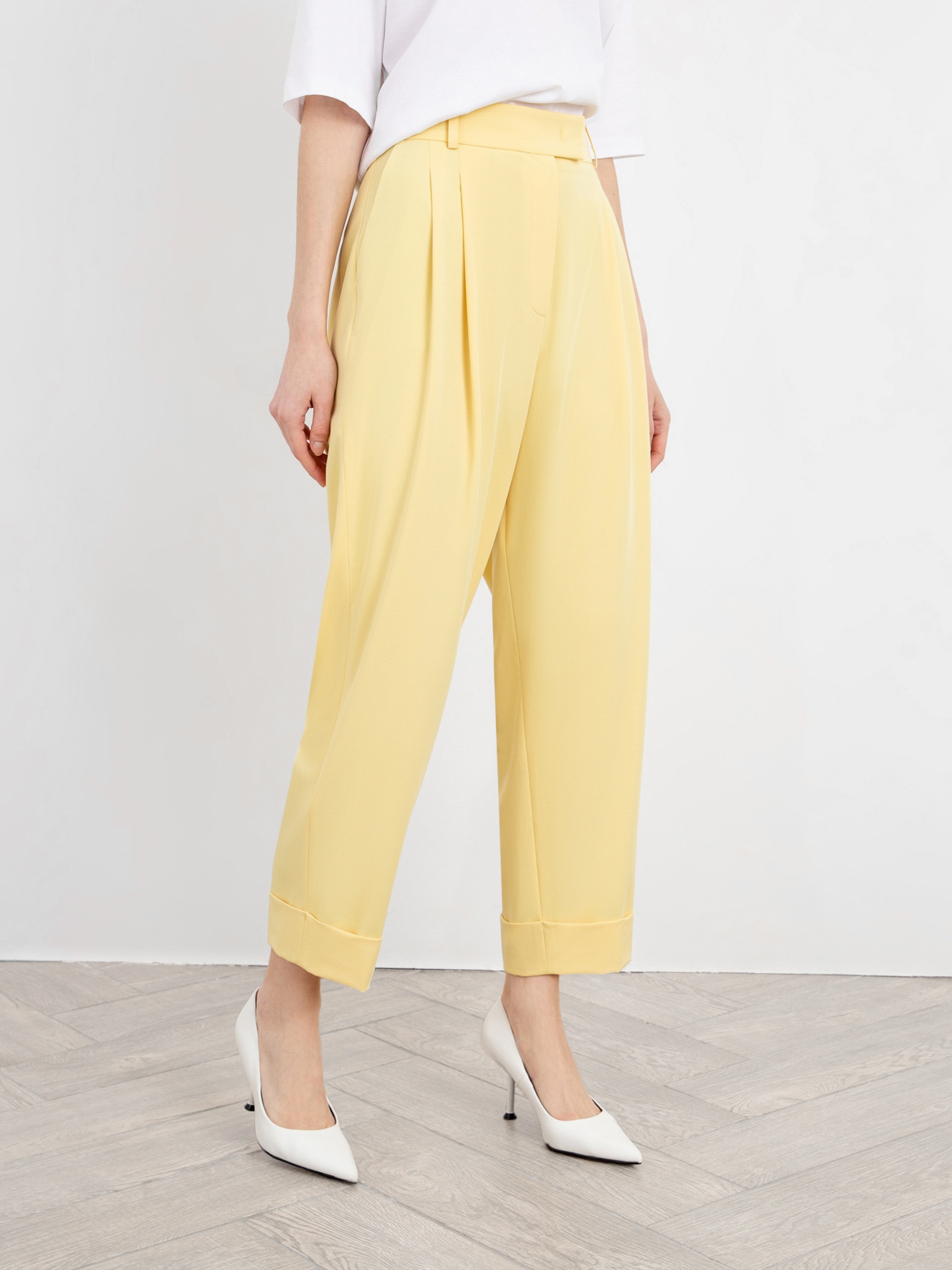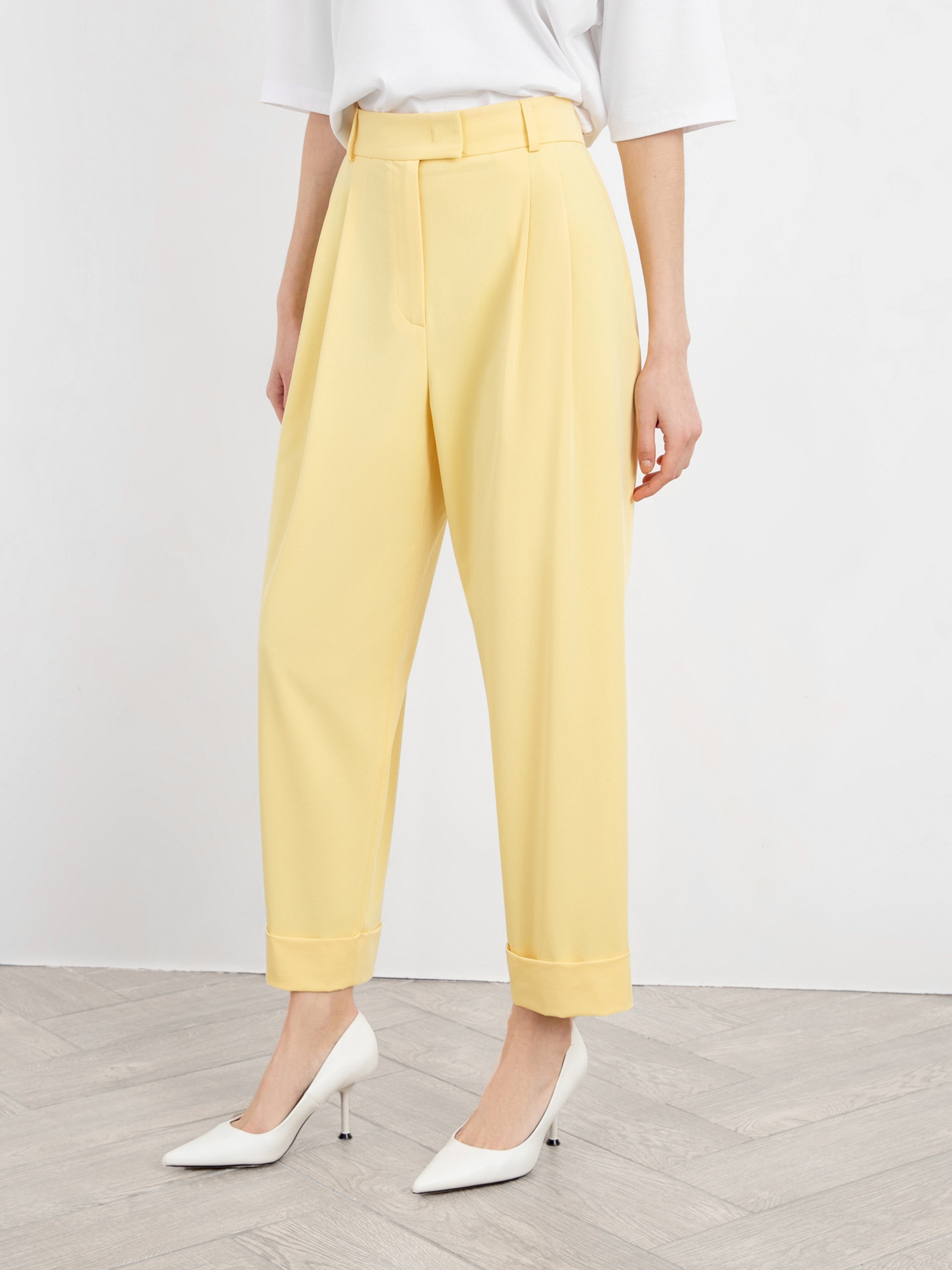 Яркие брюки со складками из мягкой костюмной ткани слегка зауженного к низу силуэта на широком притачном поясе со шлевками. Застежка спереди на молнию и крючки. Рабочие карманы в боковых швах. По низу широкие декоративные манжеты с отворотами. Модель идеально сочетается с жакетом из этой же ткани.