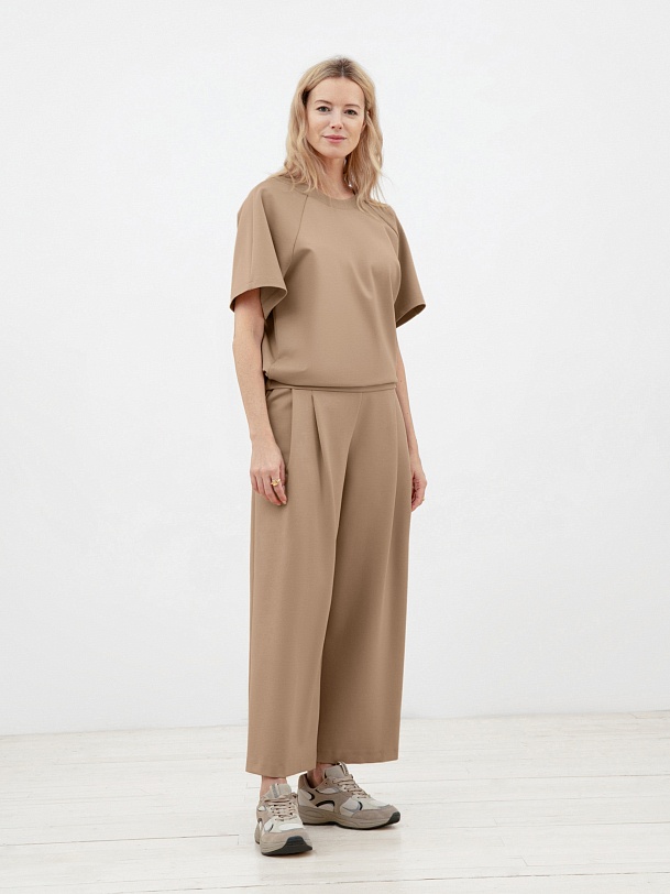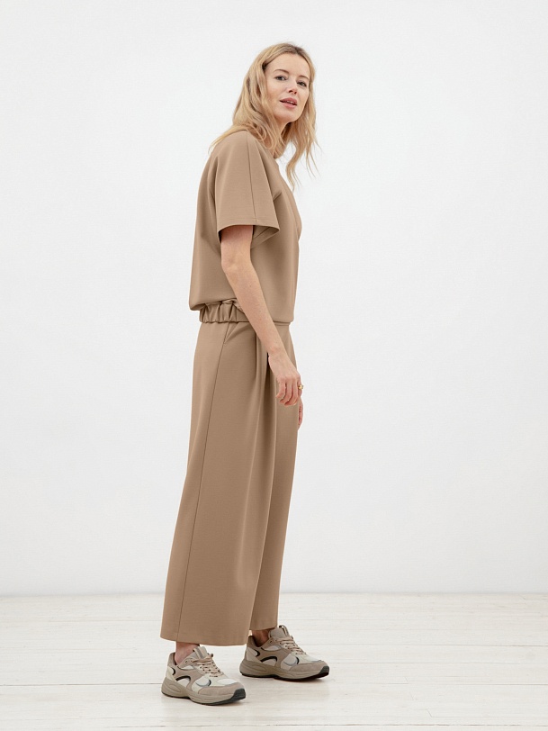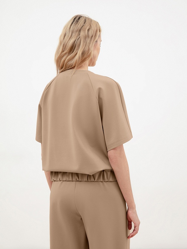Свитшот из приятного трикотажного футера с мягким плечом идеально впишется в комплект к брюкам из этого же материала. А резинка на спинке придаст завершенности образу.