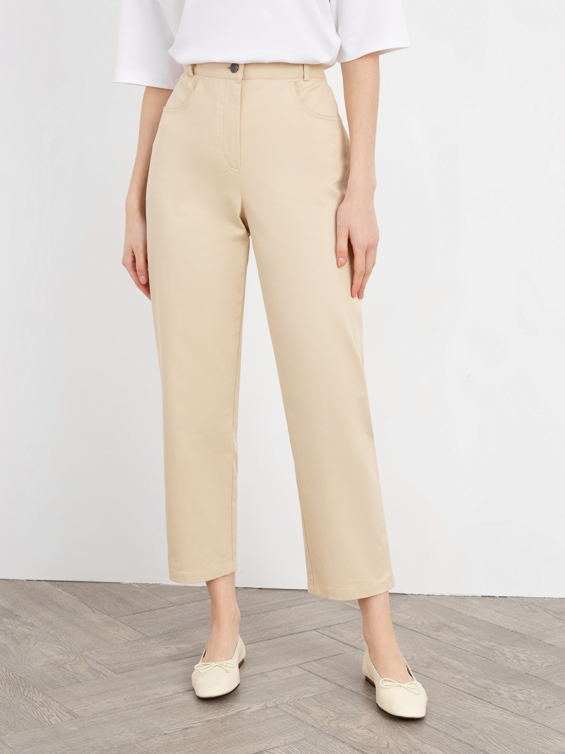 Стильные брюки из джинсовой ткани в трендовом бежевом цвете прямого силуэта. На притачном поясе со шлевками и рабочими карманами. Застежка спереди на молнию. Сзади крупные накладные карманы и кокетка. Добавив белую майку и жакет-куртку из этой же ткани, у вас получится идеальный городской образ для лета.