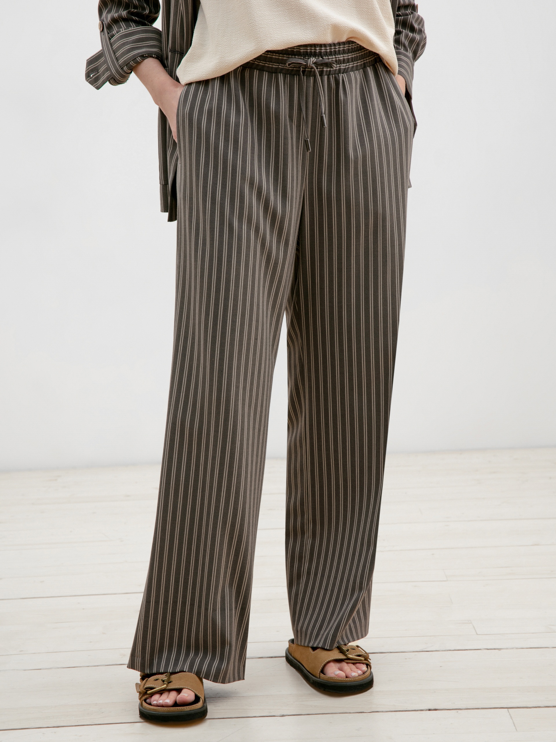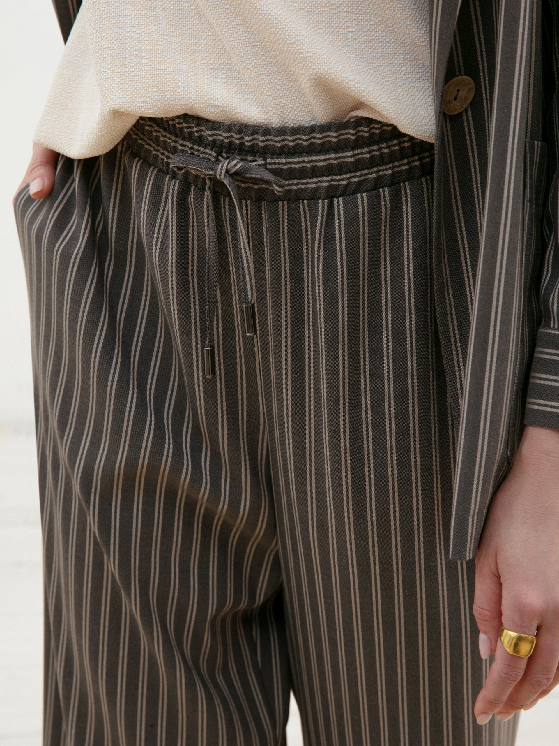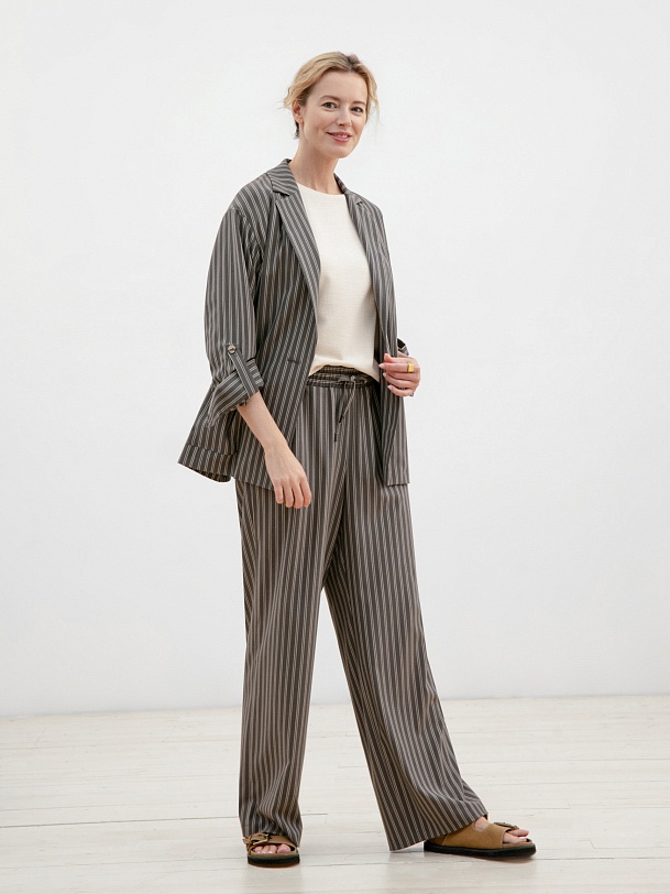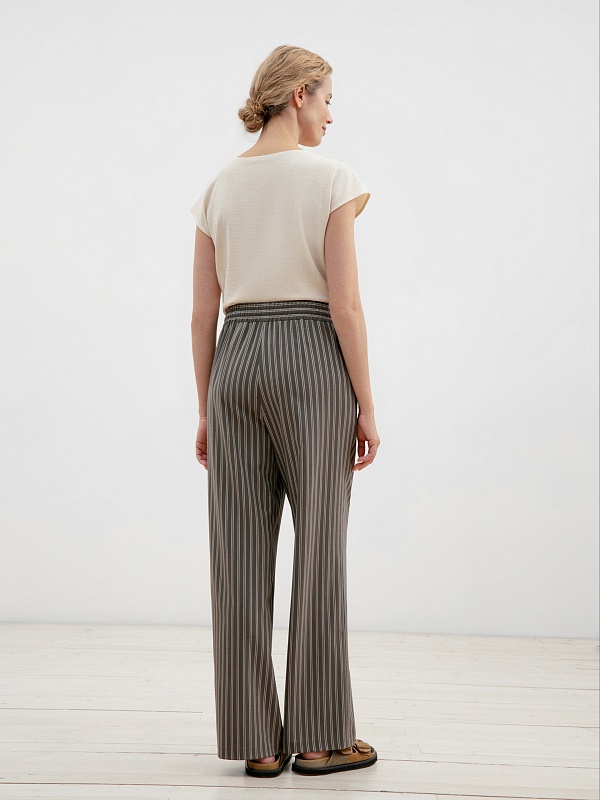 Брюки полной длины, из плательной ткани в полоску, свободной формы, на поясе. В пояс вставлена резинка и кулиcка для лучшей фиксации.