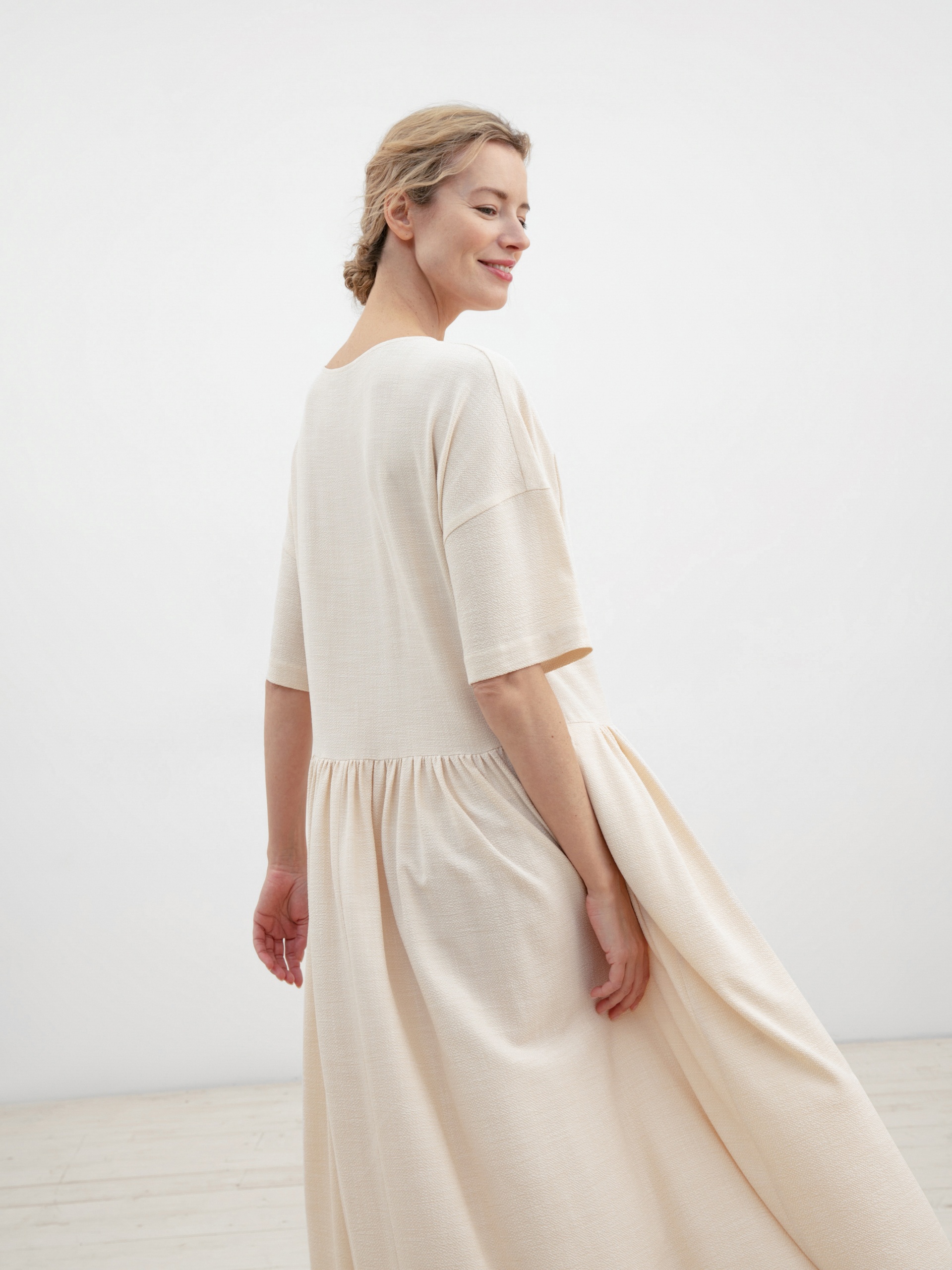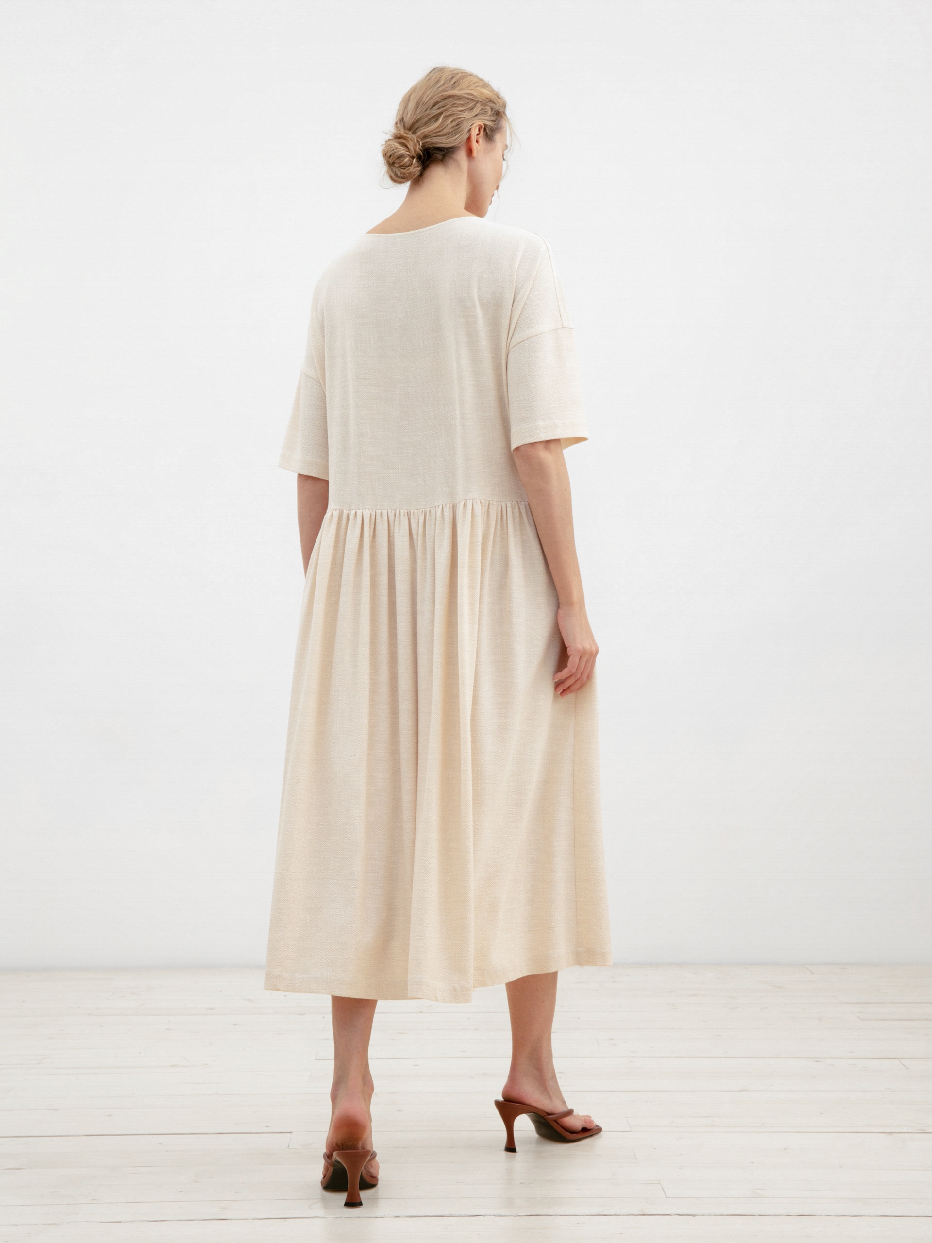 Свободное летнее светлое платье из фактурной ткани в стиле smart casual. Полуприлегающий силуэт, отрезное по линии талии с юбкой-колоколом. Вырез горловины круглый, рукав рубашечного кроя. Потайные карманы в швах на юбке.