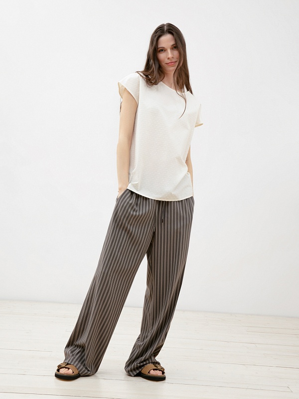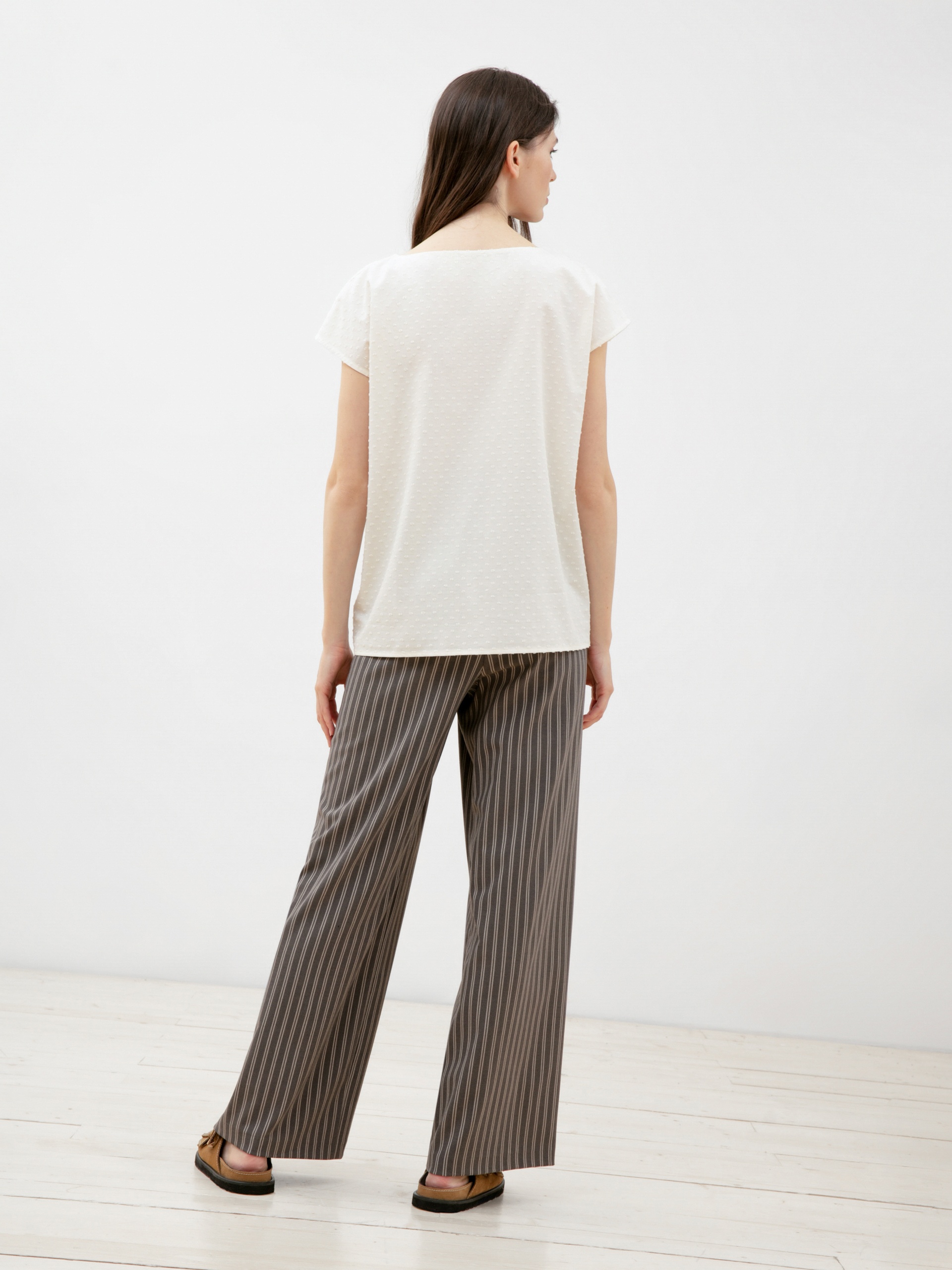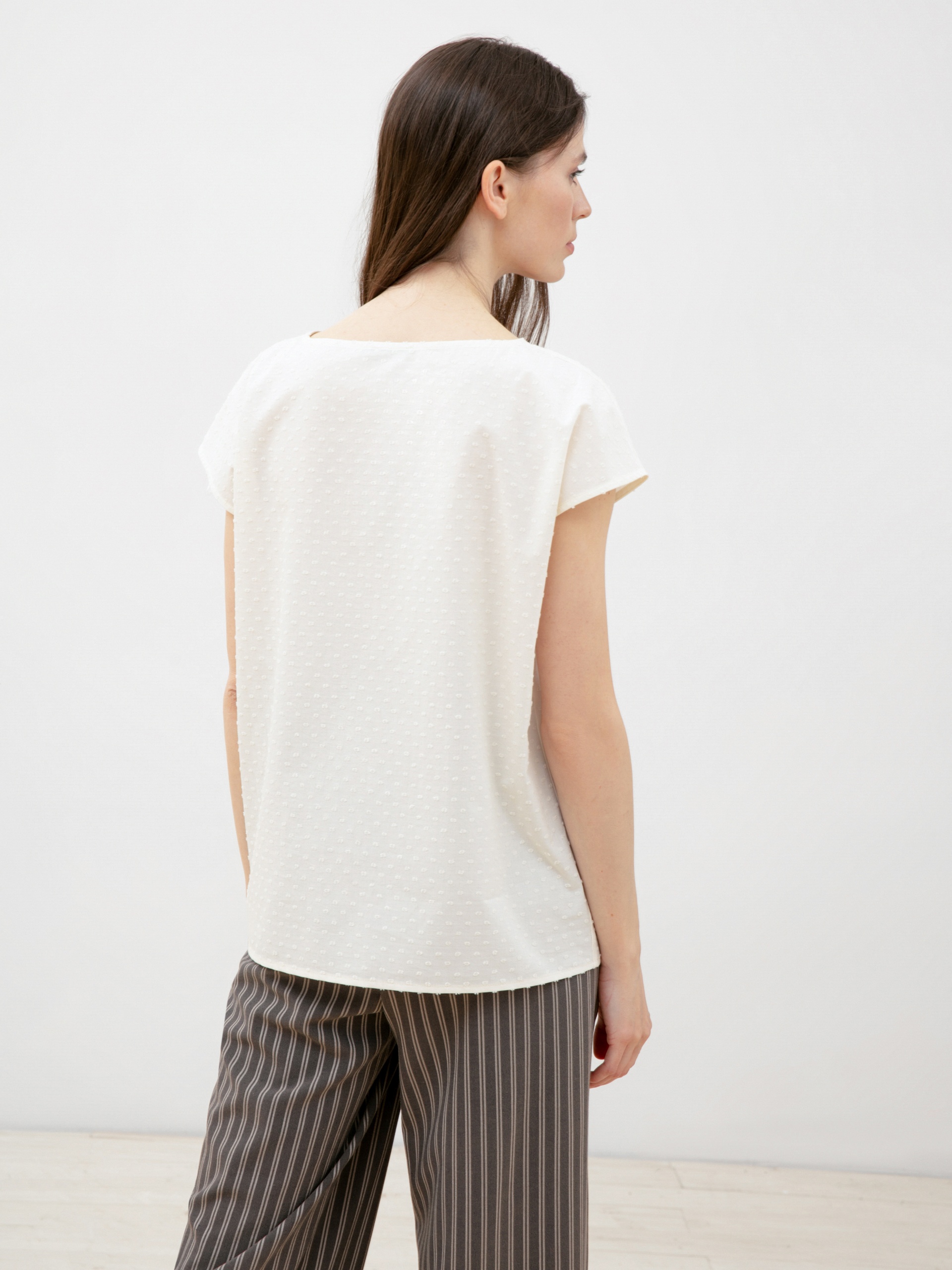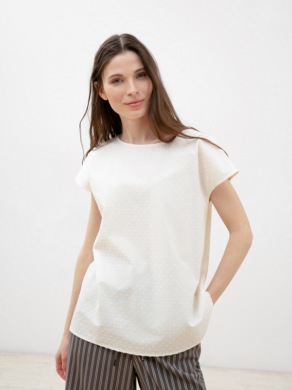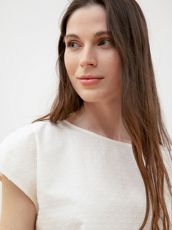 Блуза из легкой хлопковой ткани в горошек свободного кроя, с вырезом лодочка и разрезами по боковым швам с низу изделия. Универсальная модель для создания комфортных повседневных образов.