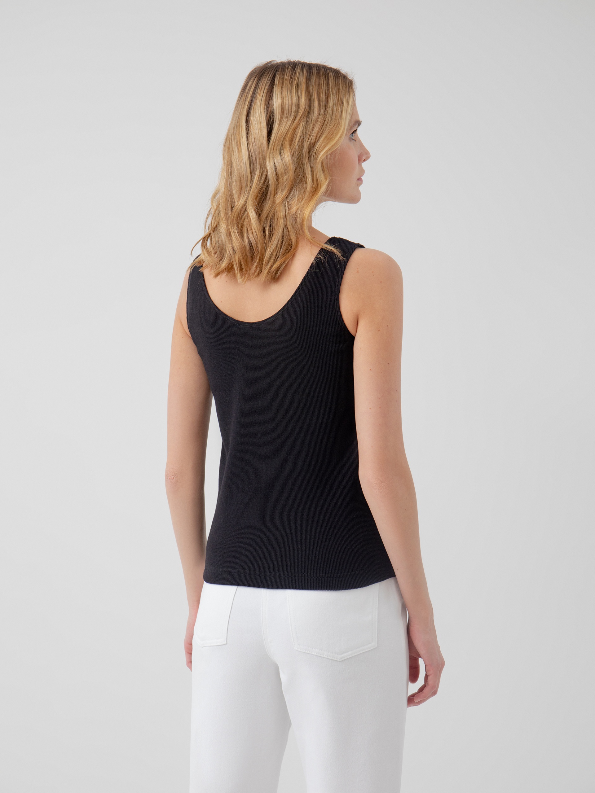 Базовый топ прилегающего силуэта из трикотажного полотна с глубоким круглым вырезом. Незаменимая вещь для создания стильных образов на каждый день.