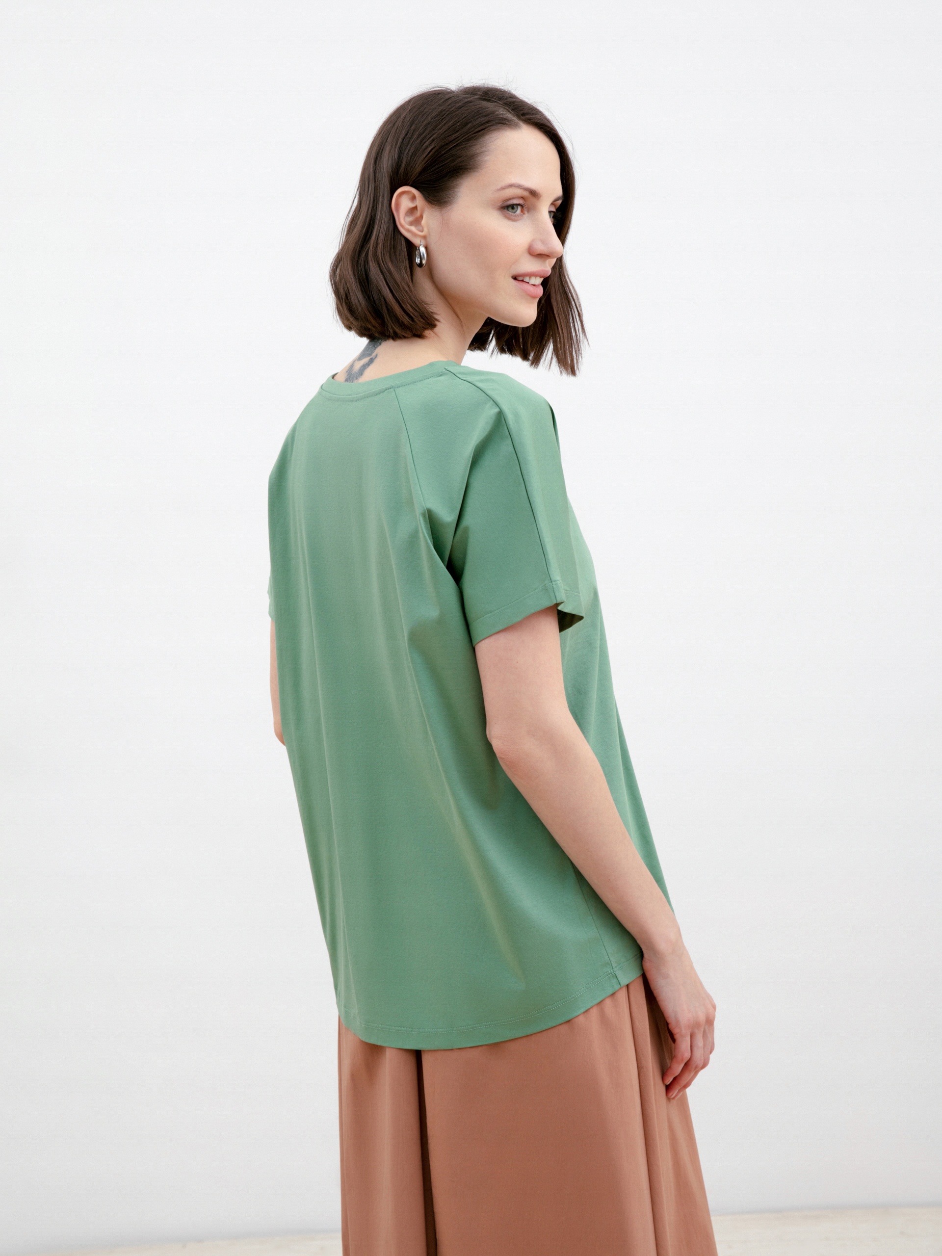Базовая трикотажная футболка зеленого цвета в стиле оверсайз с круглой горловиной и коротким рукавом реглан. Идеальный топ для составления стильных повседневных образов.