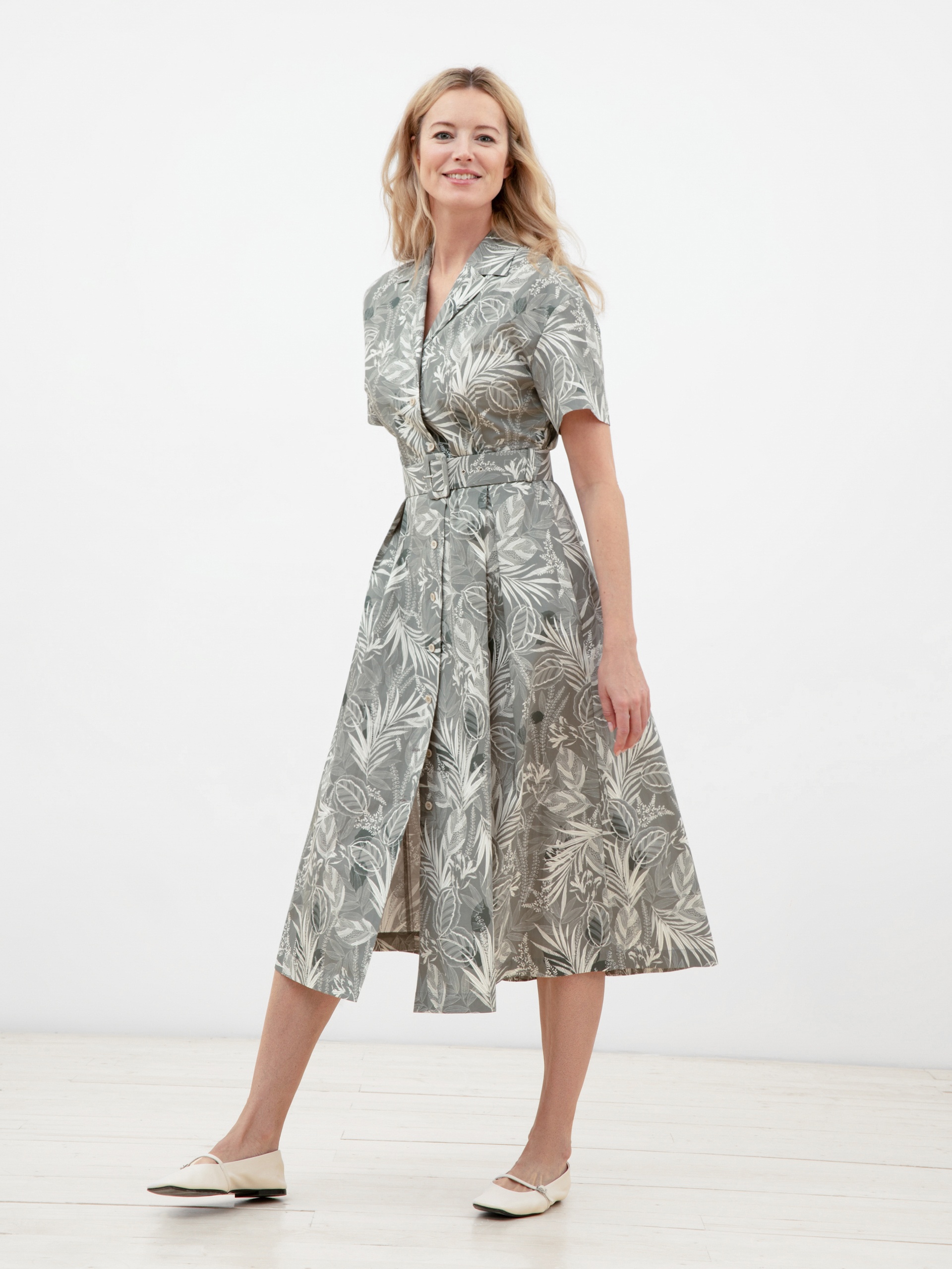 Женственное летнее платье из хлопковой ткани.Модный растительный принт. Приталенный силуэт с пышной юбкой со складками, расширенной к низу. Воротник классический отложной, рукав втачной, застежка спереди на пуговицы. В боковых швах рабочие карманы. Данная модель прекрасно подойдет как для отдыха у моря, так и прогулок по городским улицам.