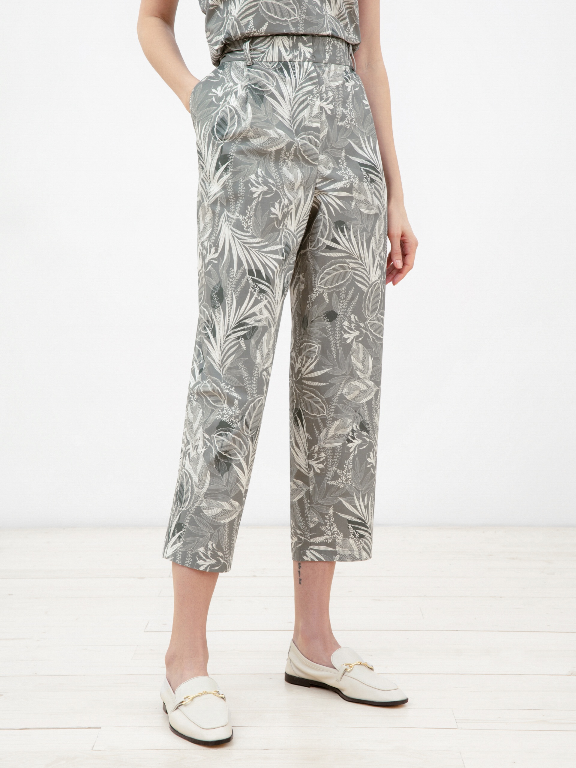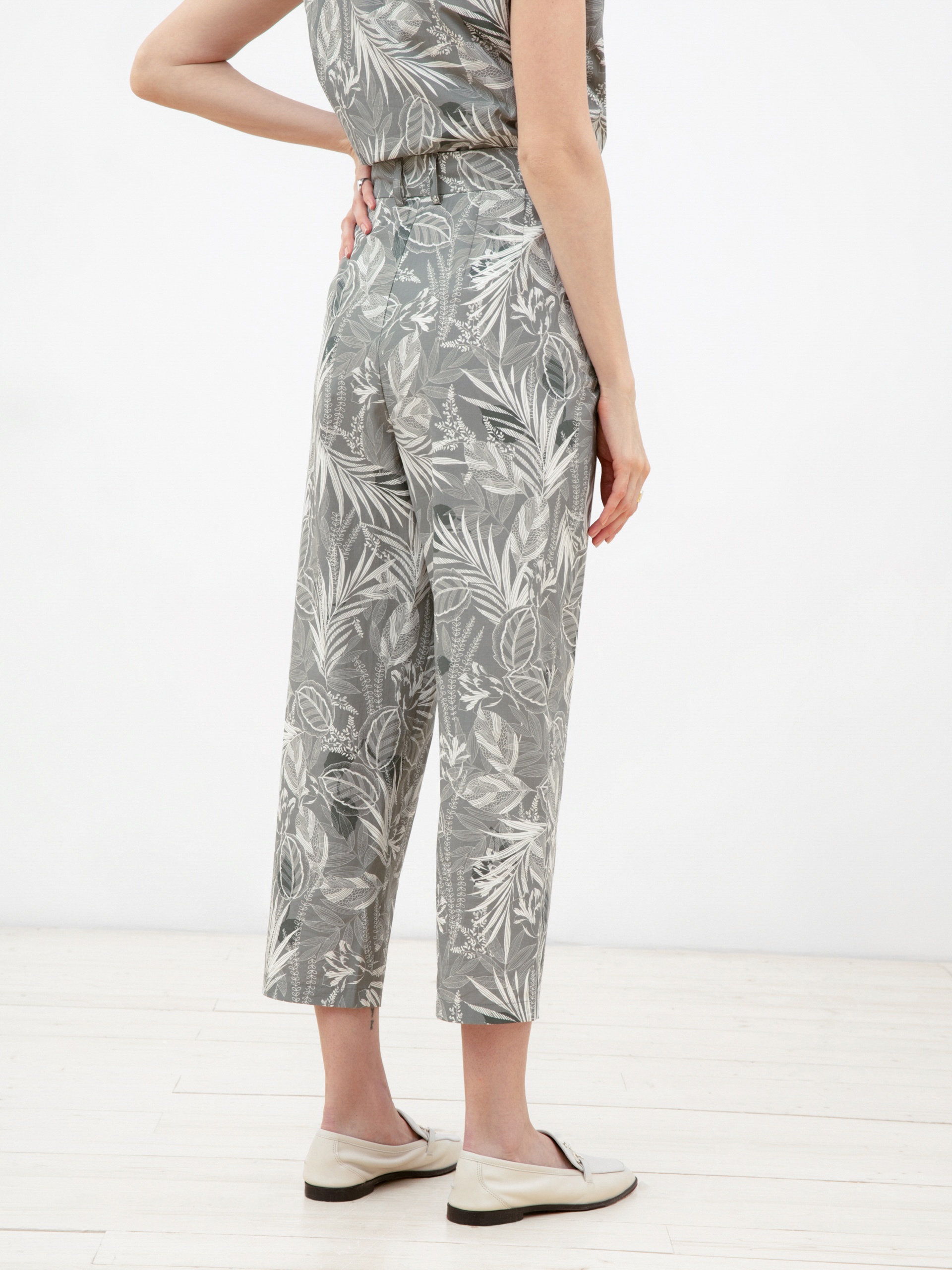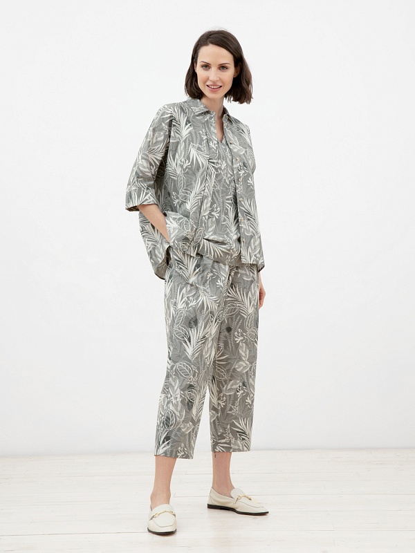 Брюки из хлопковой ткани силуэта "бананы", длиной 7/8, на притачном поясе из основной ткани. С защипами по линии пояса для наилучшей посадки. Имеют два комфортных боковых кармана.