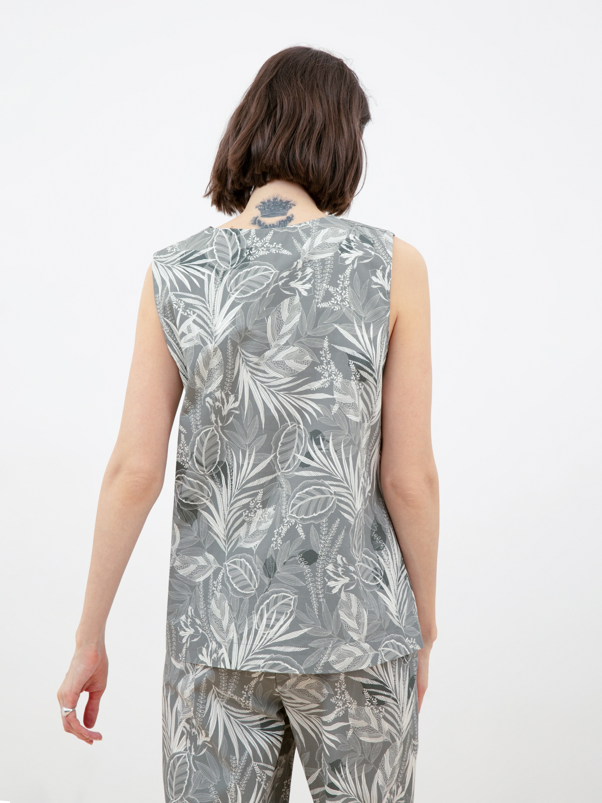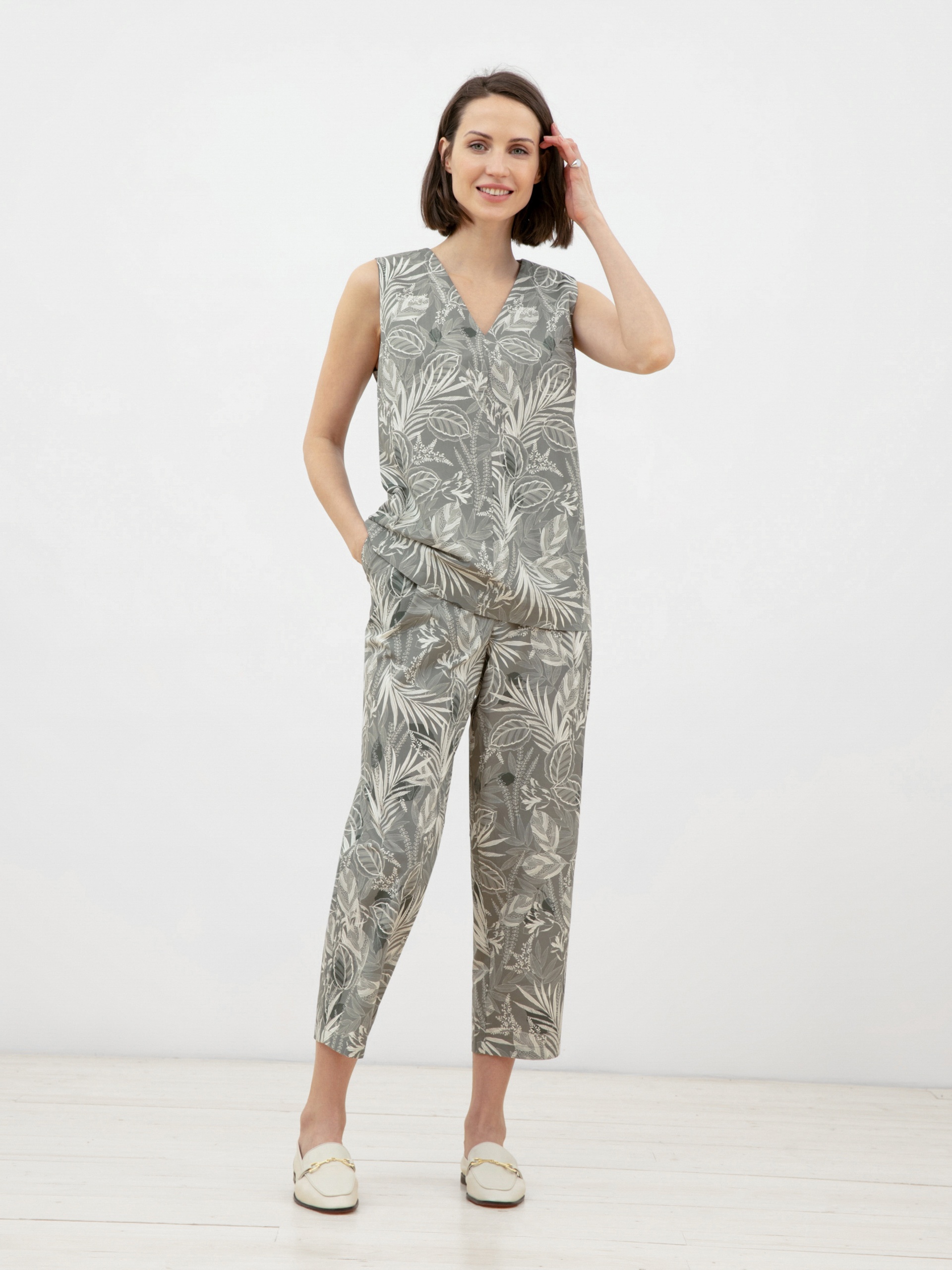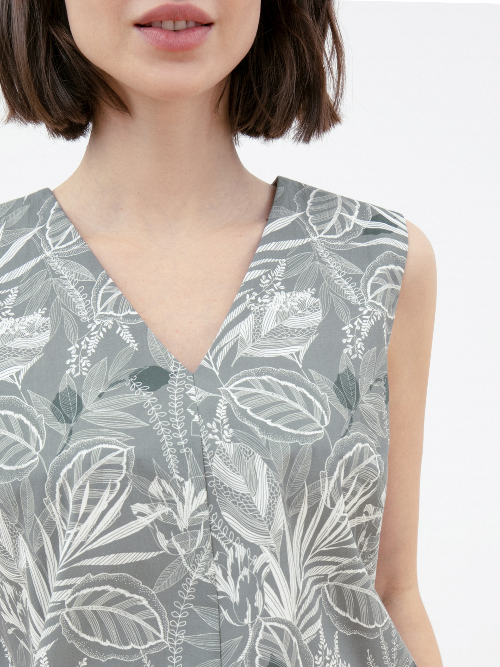 Блуза прямого ситуэта из хлопковой ткани в растительный принт. Воротник отложной, рукав-кимоно, низ рукава обработан притачной манжетой. Застежка потайная на пуговицы.