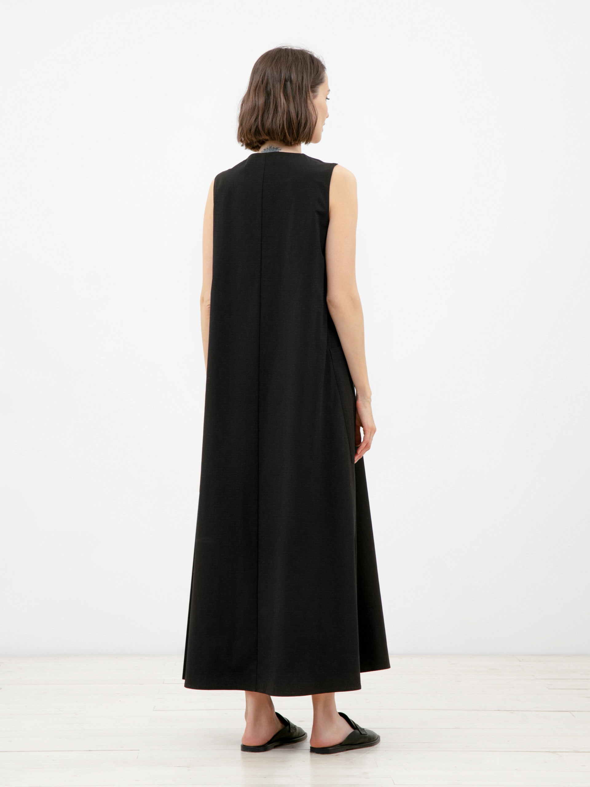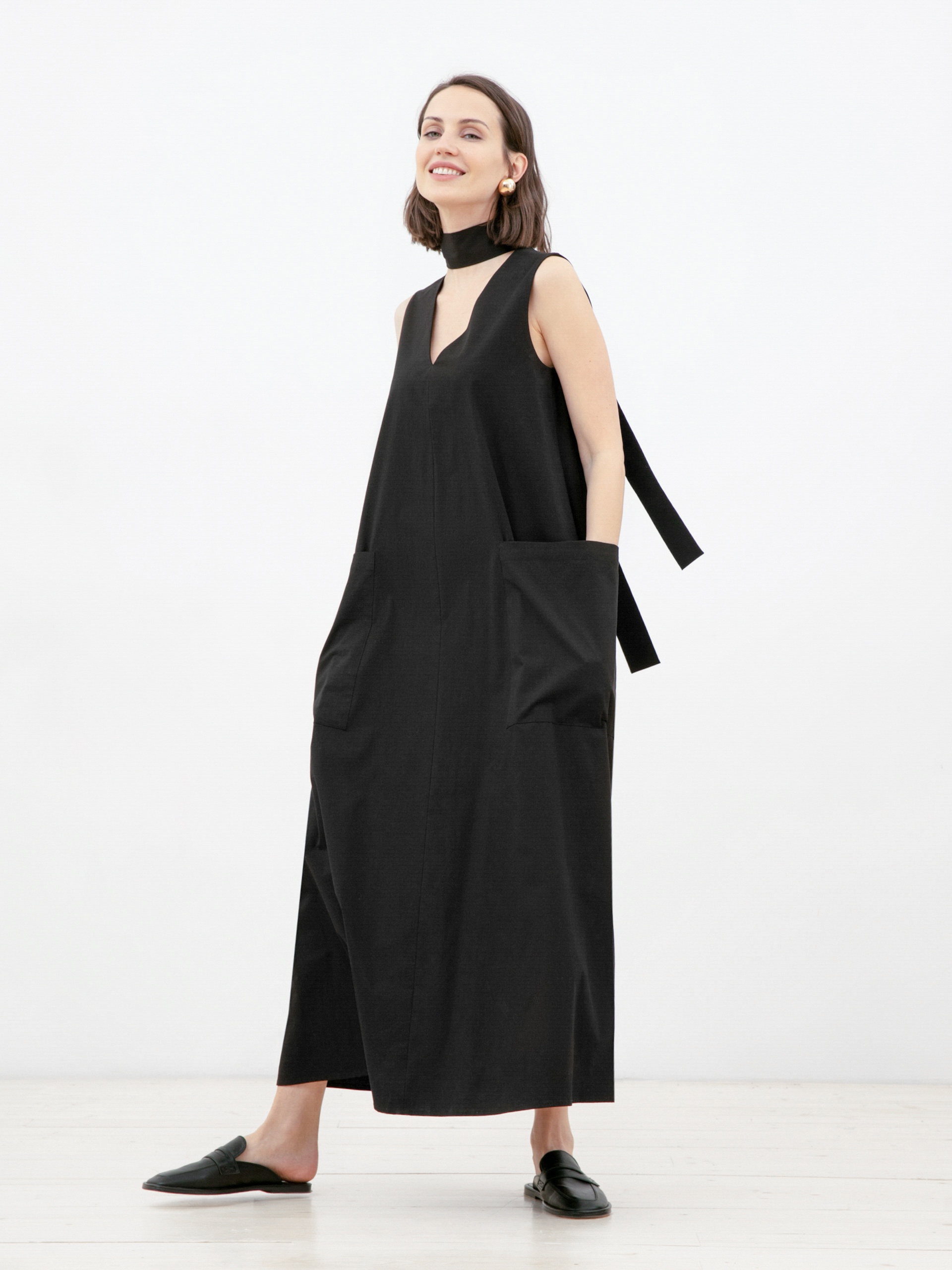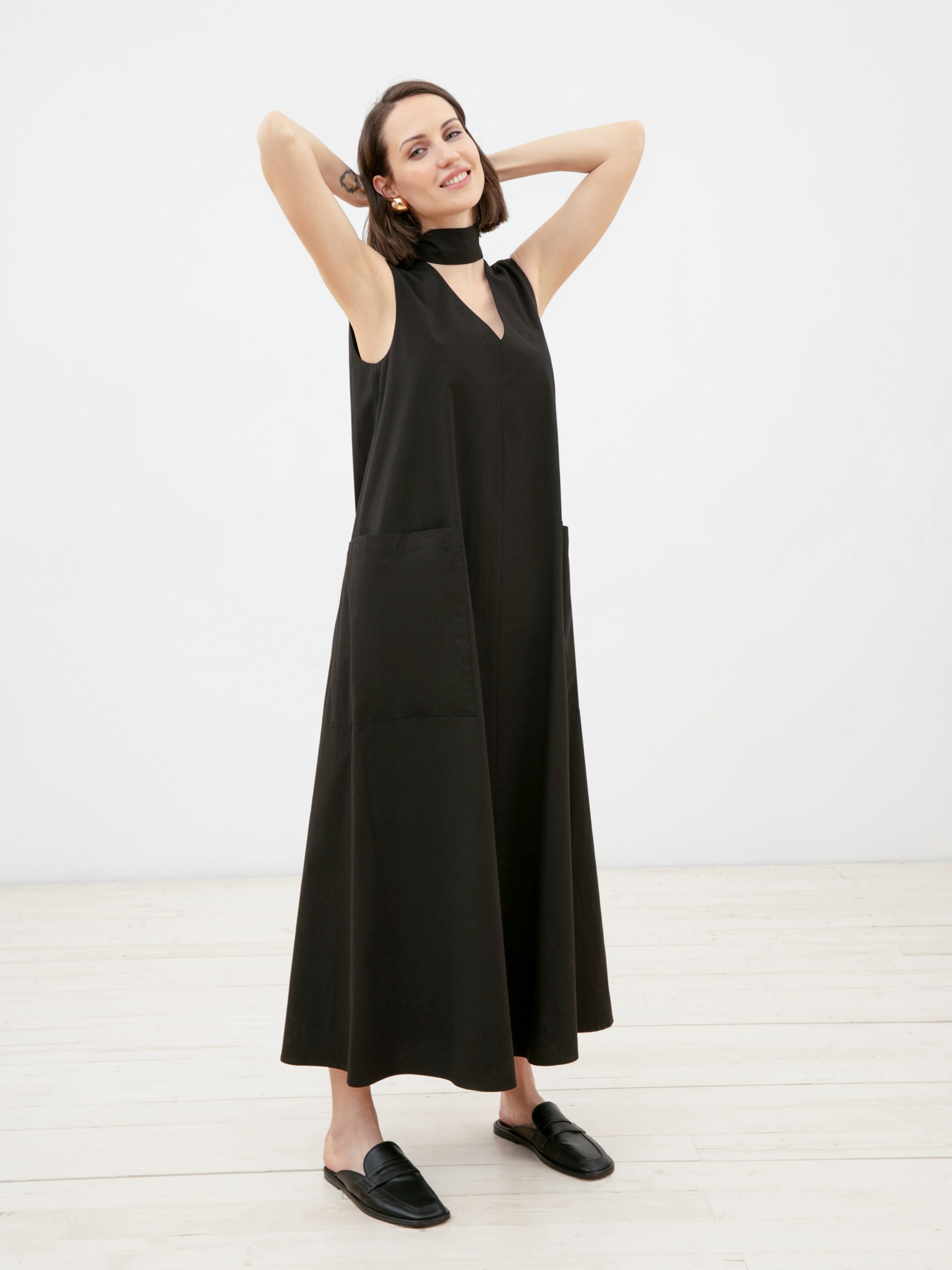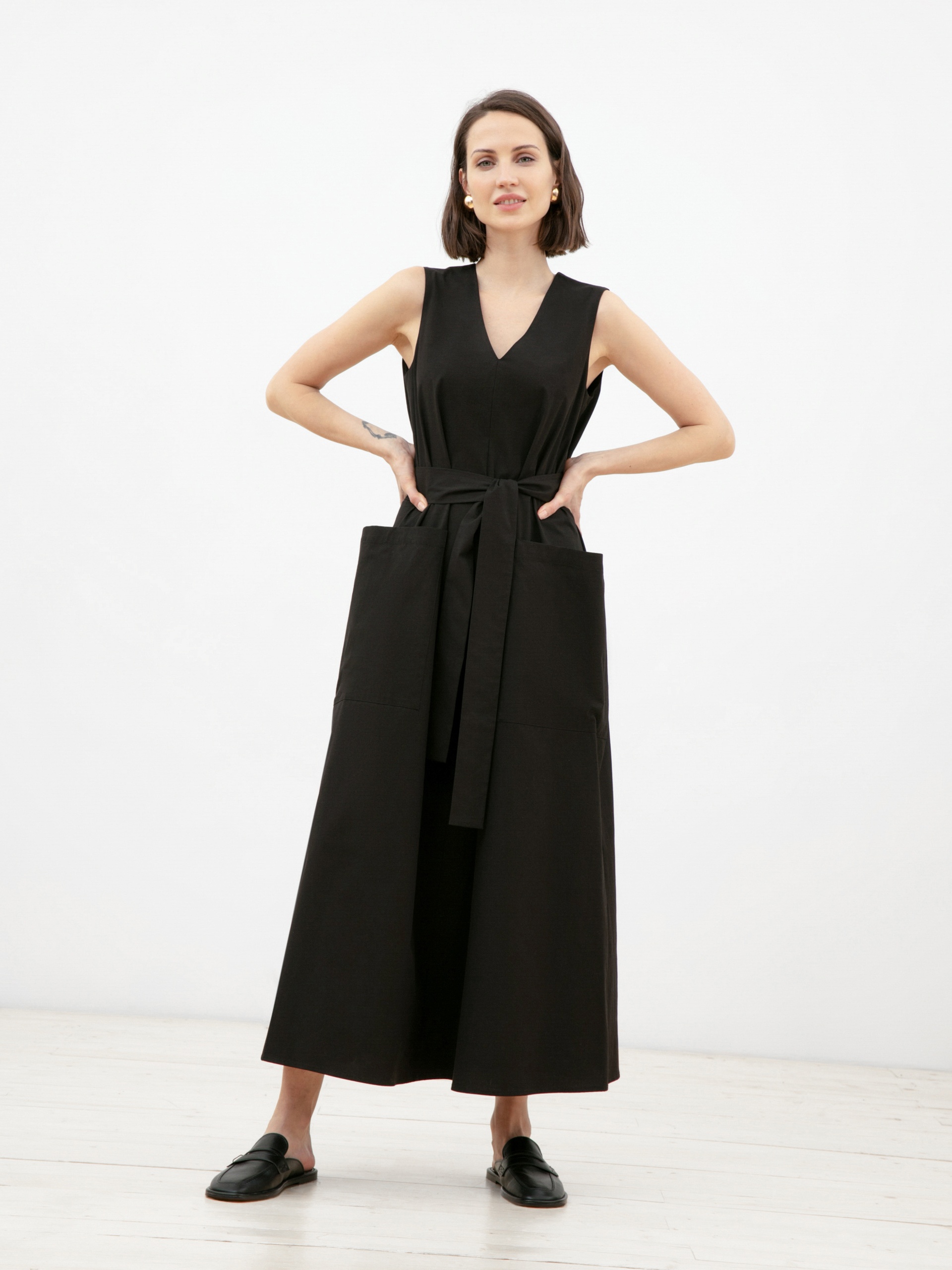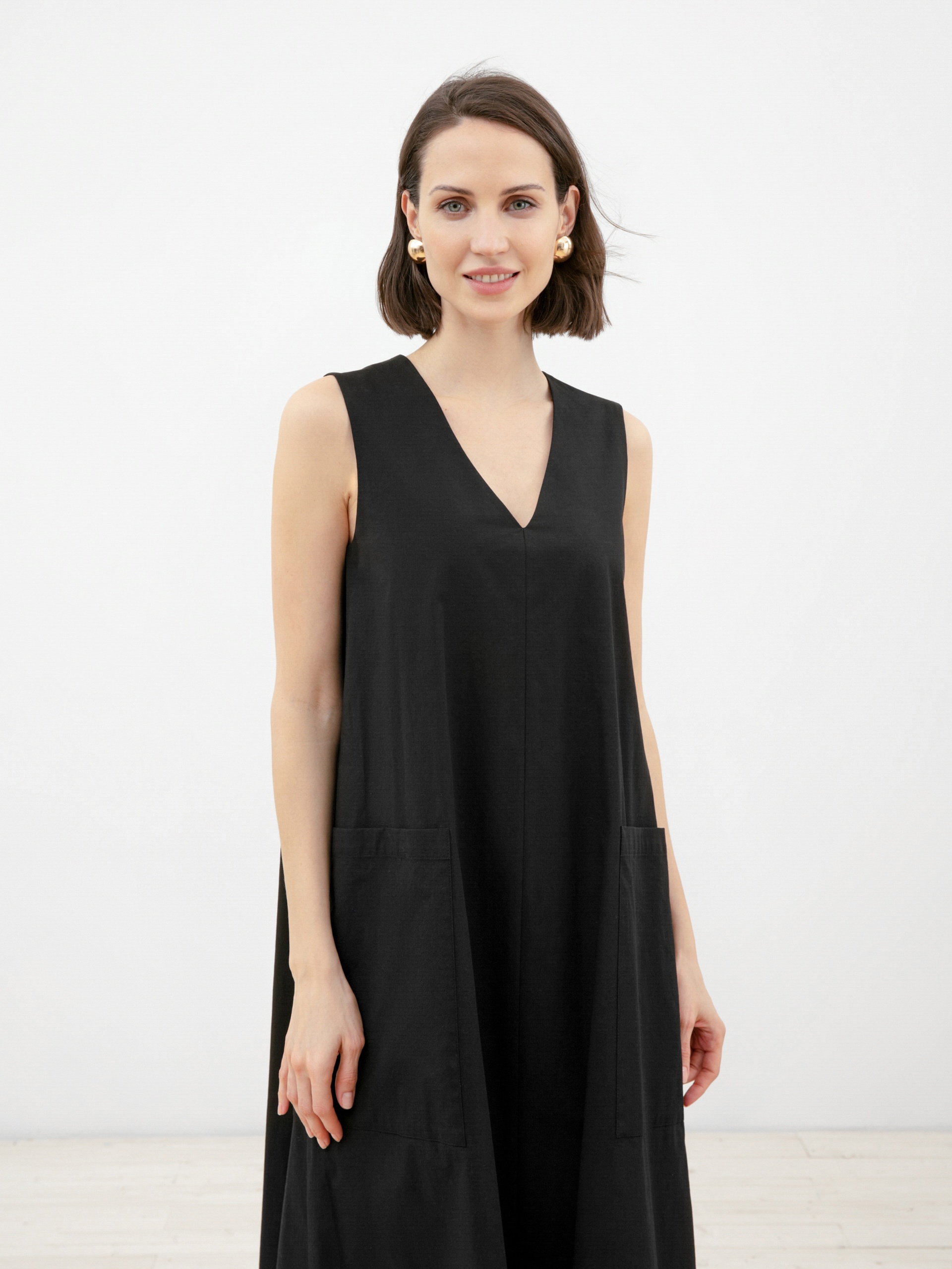 Стильное платье без рукавов из натуральной хлопковой ткани свободного А-силуэта длины миди с v-образным вырезом горловины и крупными накладными карманами. В комплект входит сьемный пояс из ткани для создания более приталенного силуэта.
