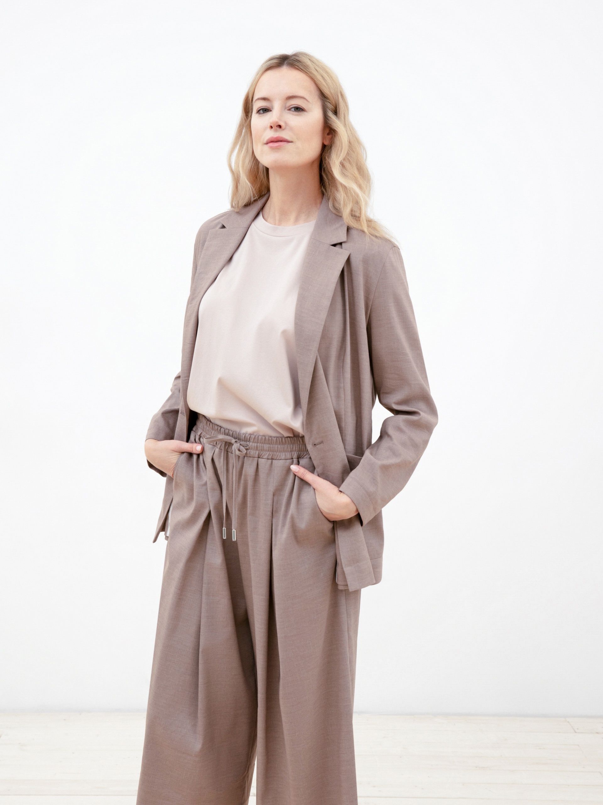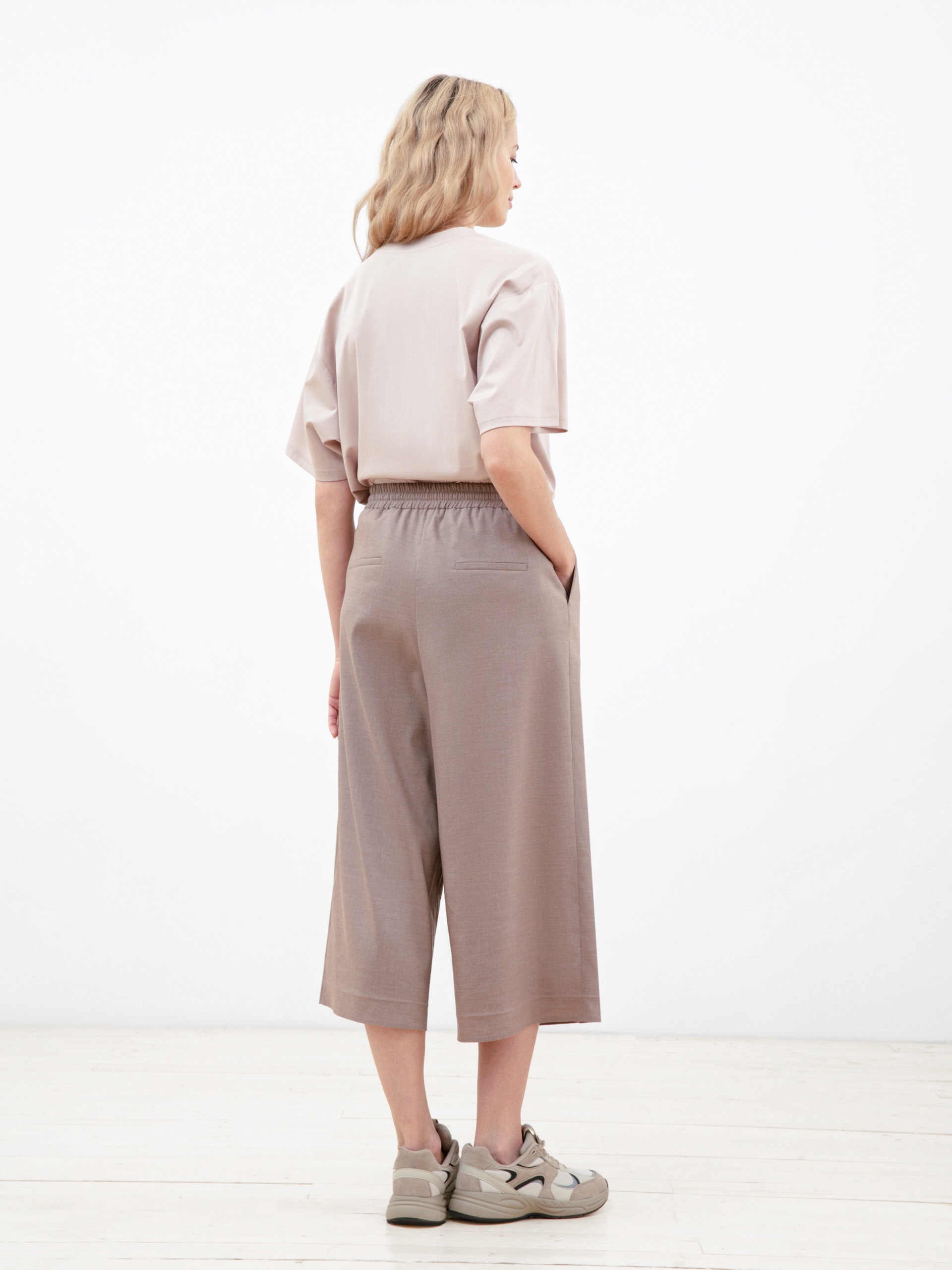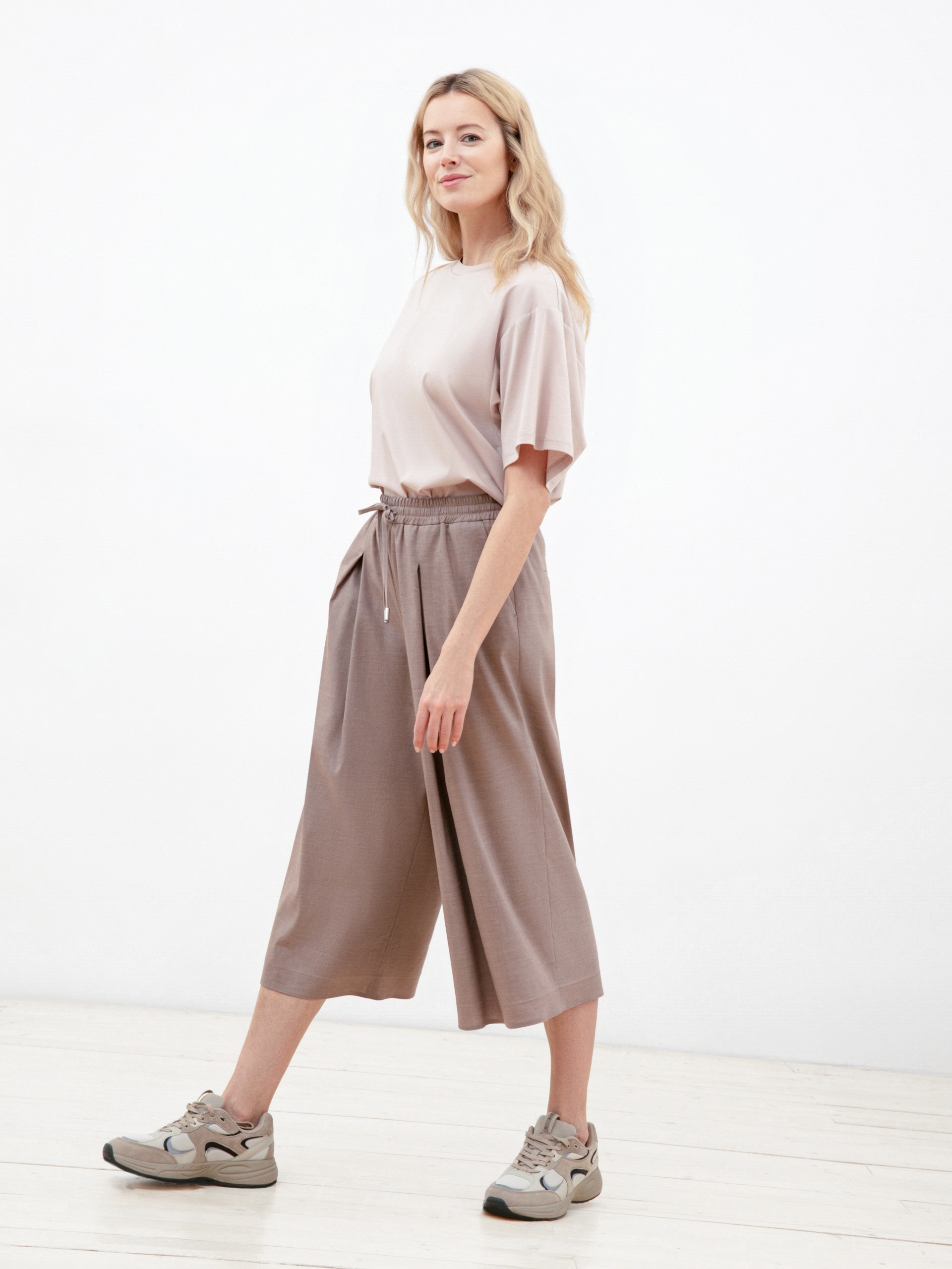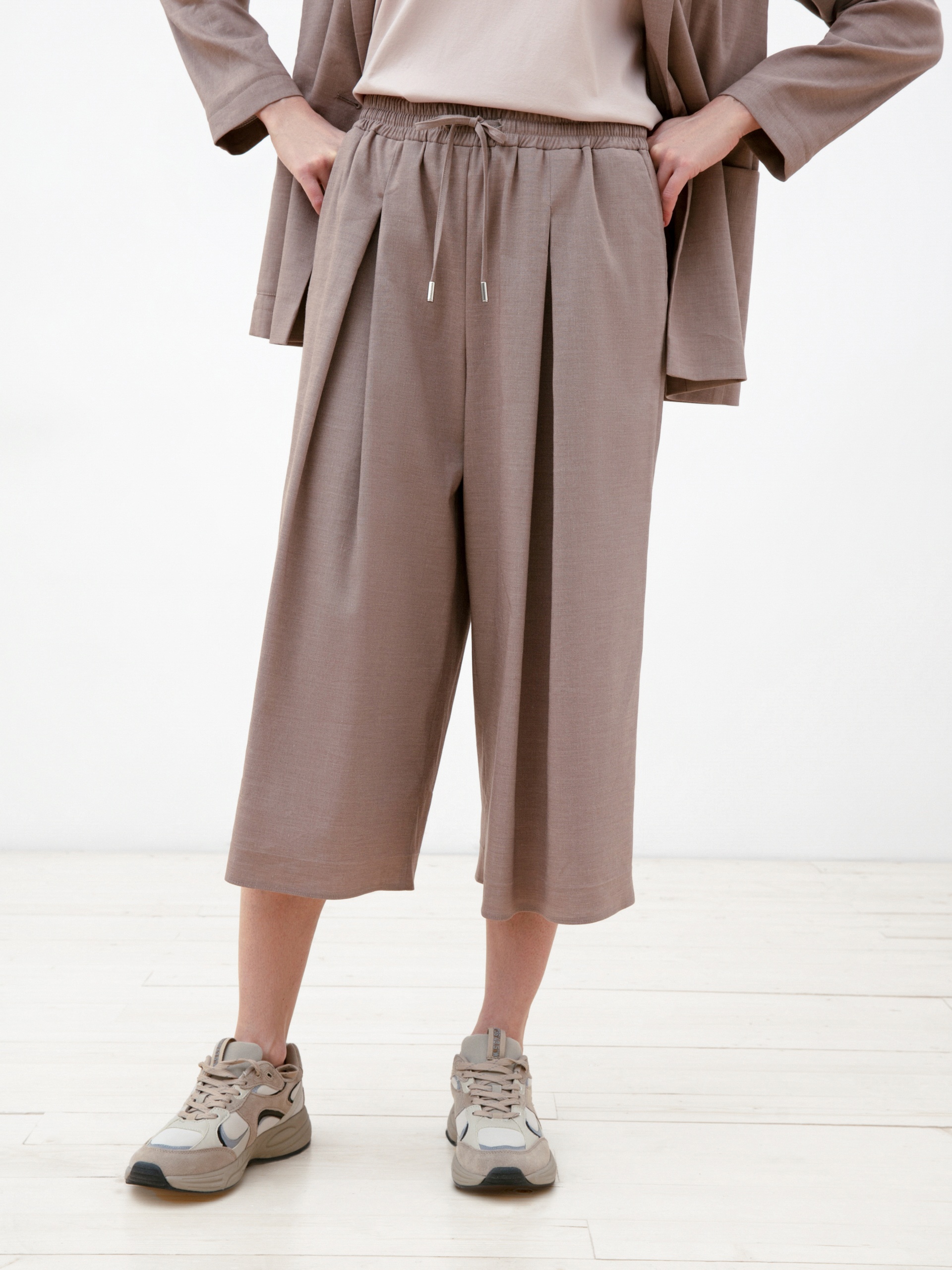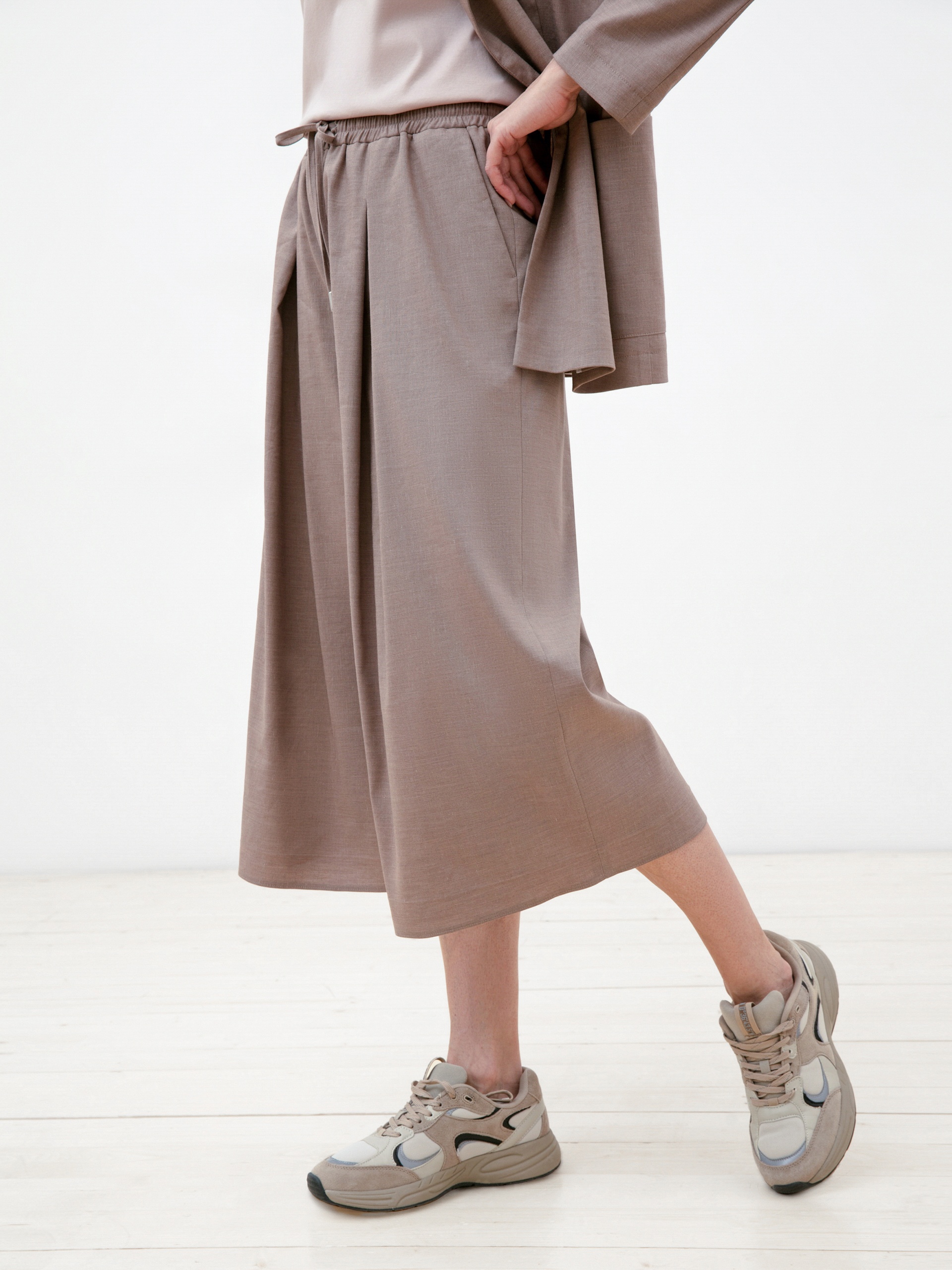 Брюки-кюлоты из льняной ткани кофейного цвета. Пояс выполнен из основной ткани и собран на декоративный шнурок из основной ткани. Кюлоты имеют два функциональных боковых кармана. Создают идеальный образ в сочетании с двубортным жакетом, выполненным из этой же ткани.