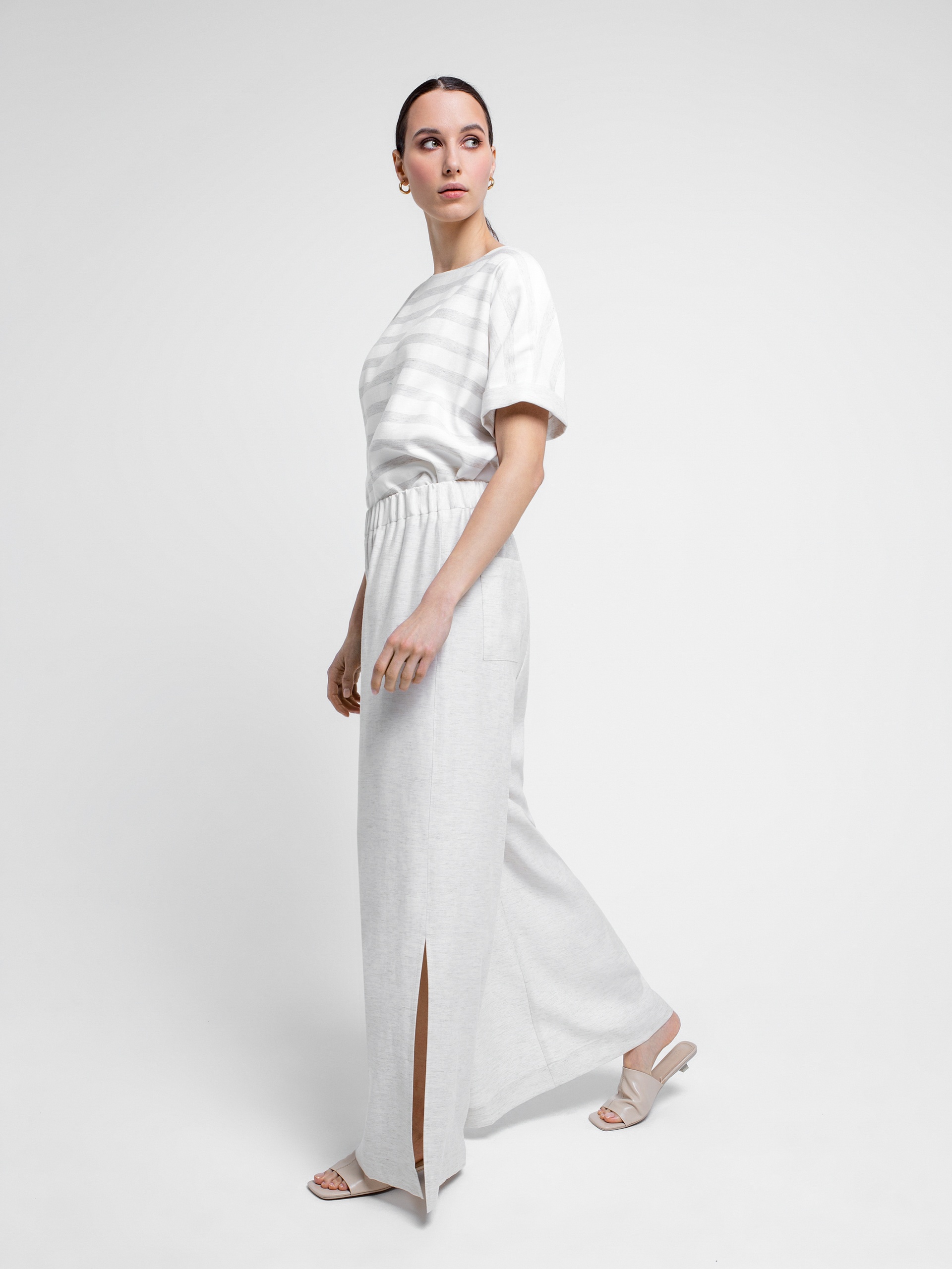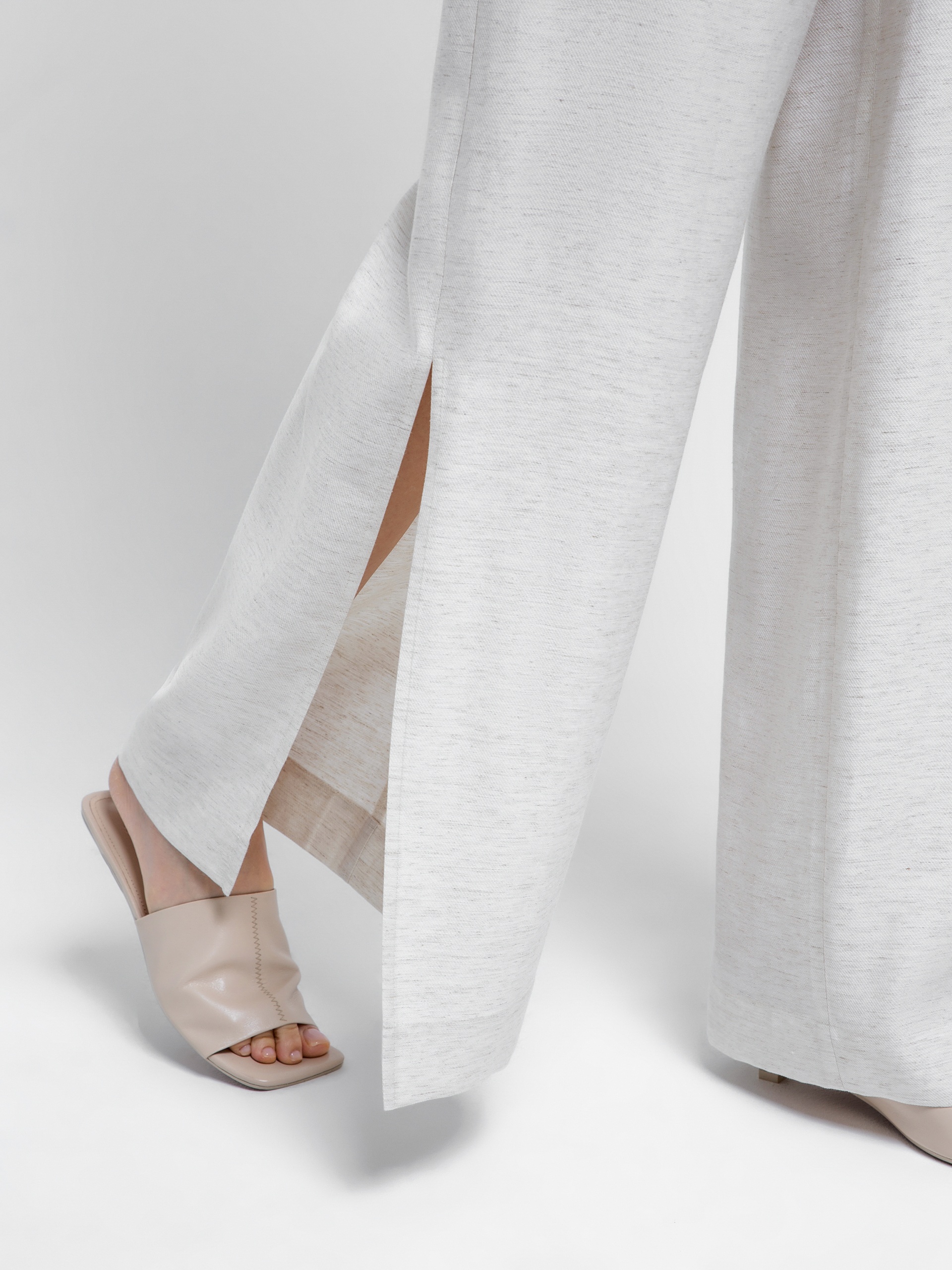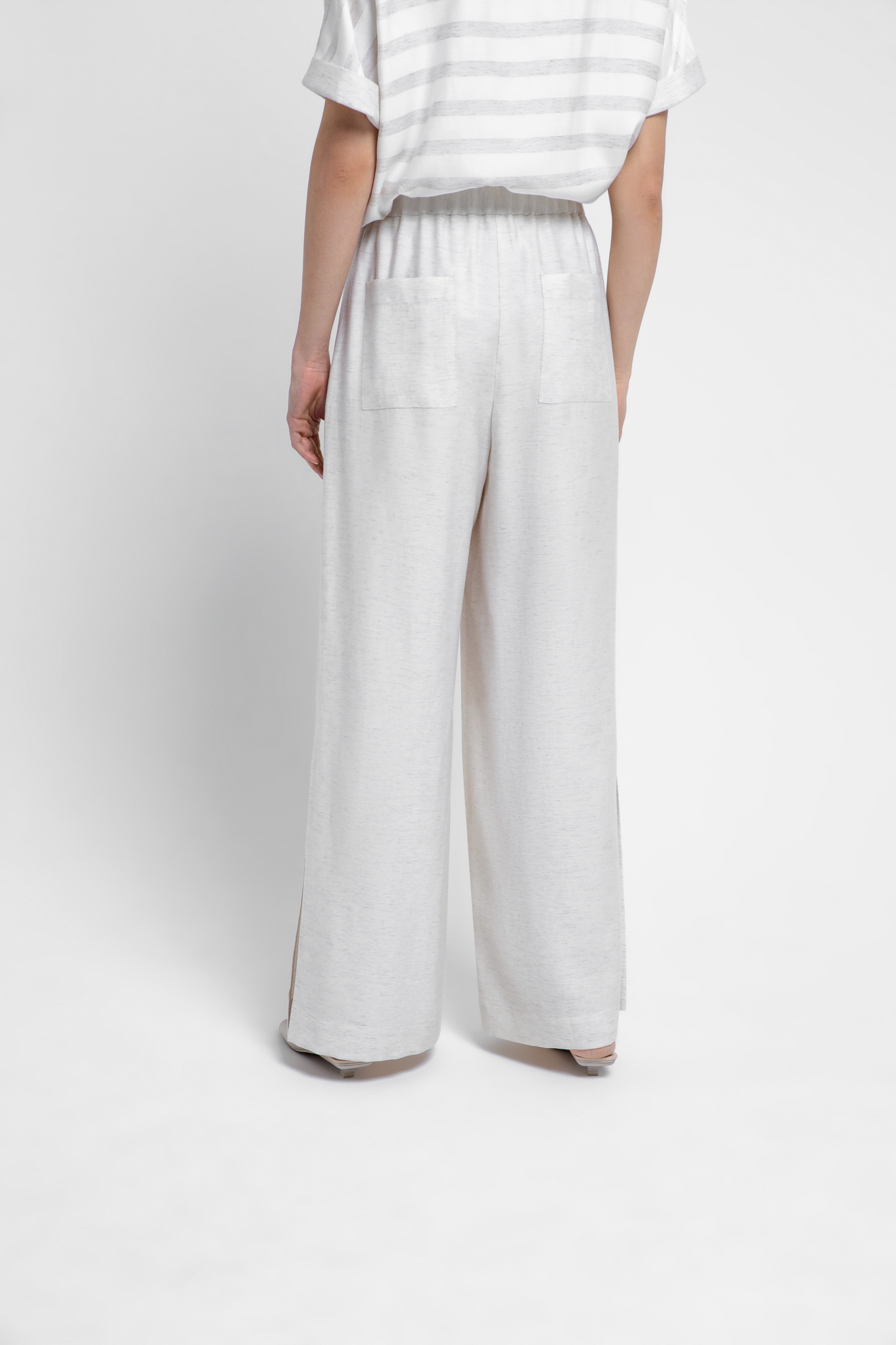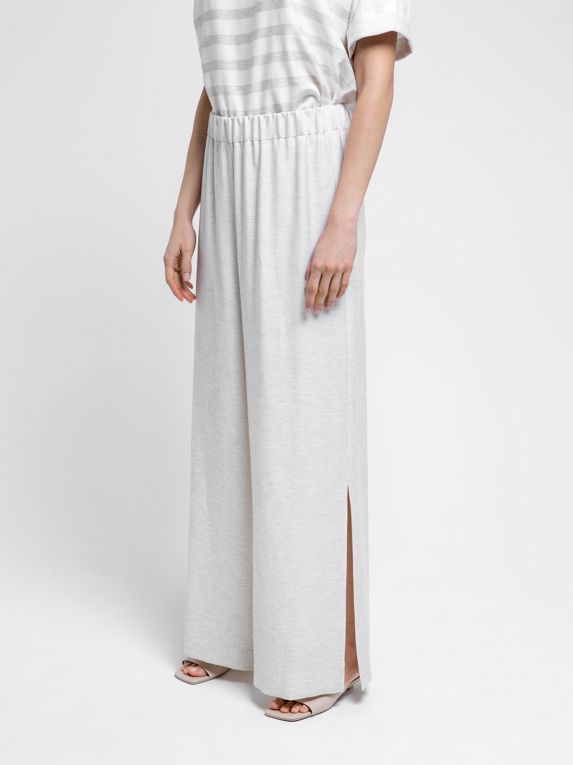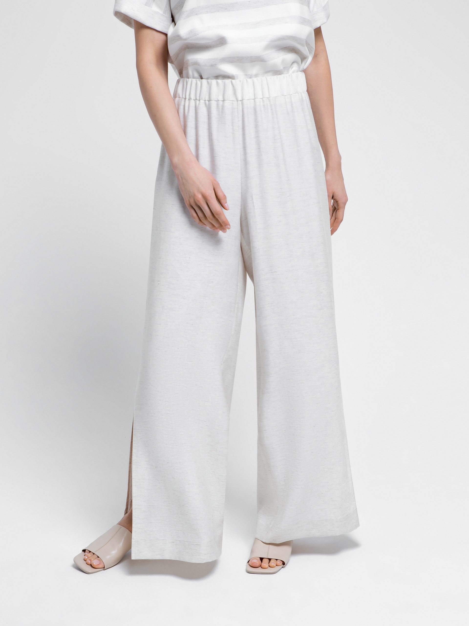 Брюки-палаццо из модала и льна. Пояс брюк собран на резинку. По низу боковых швов два элегантных разреза, которые сделают образ более расслабленным и придадут ему пикантности.