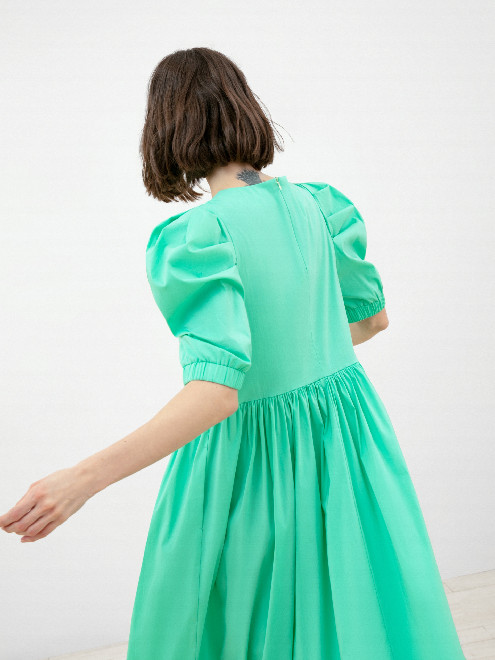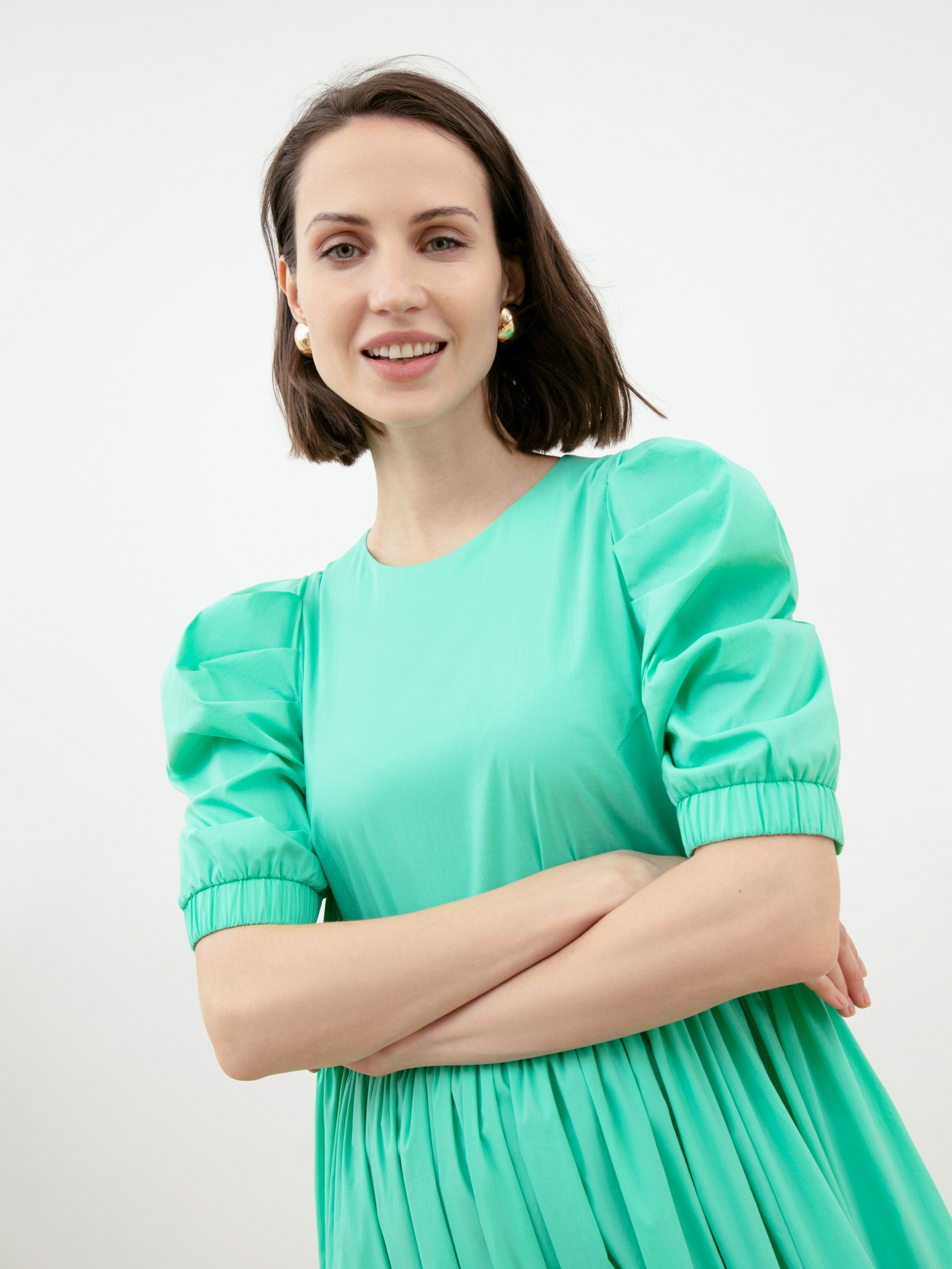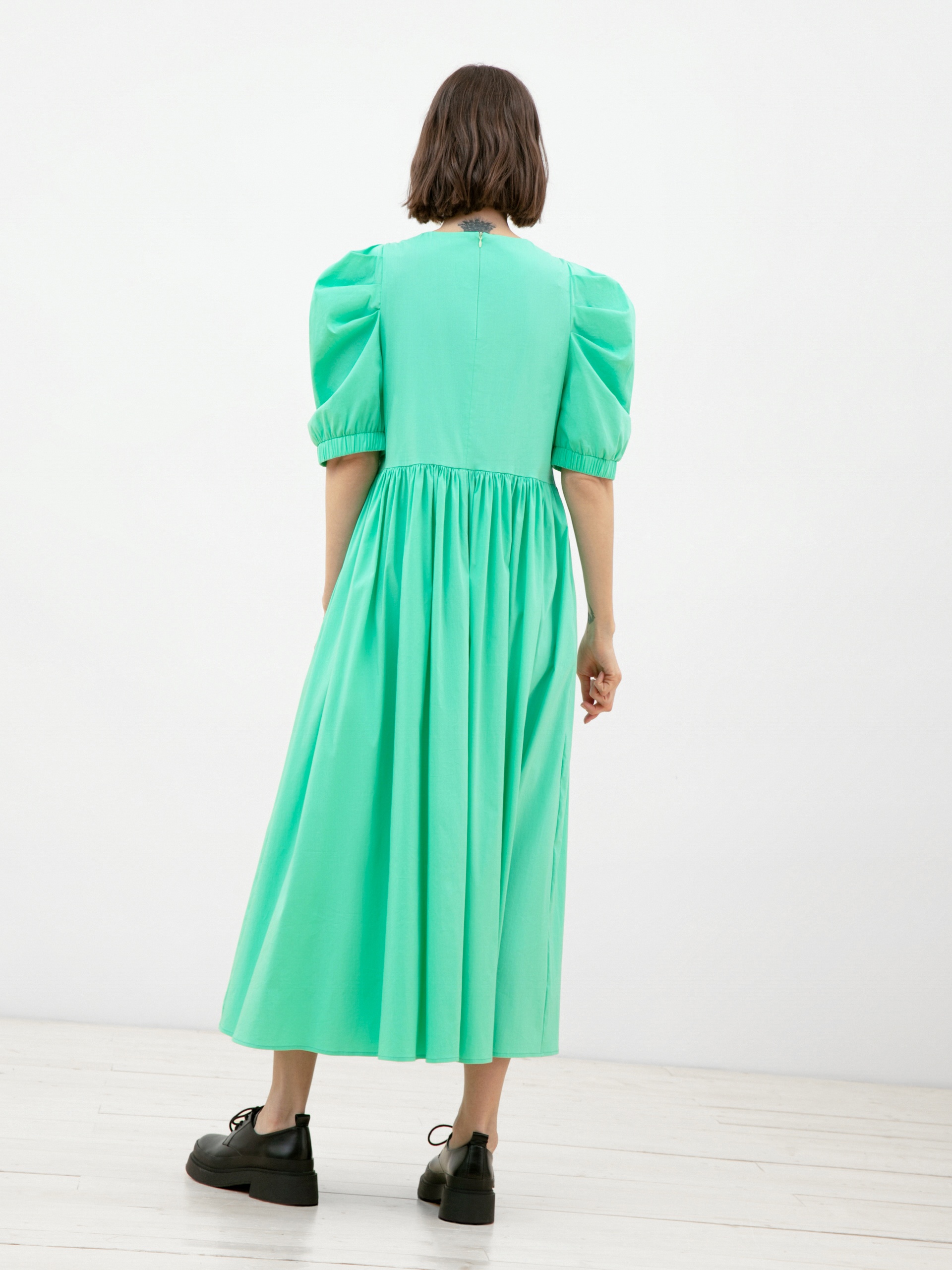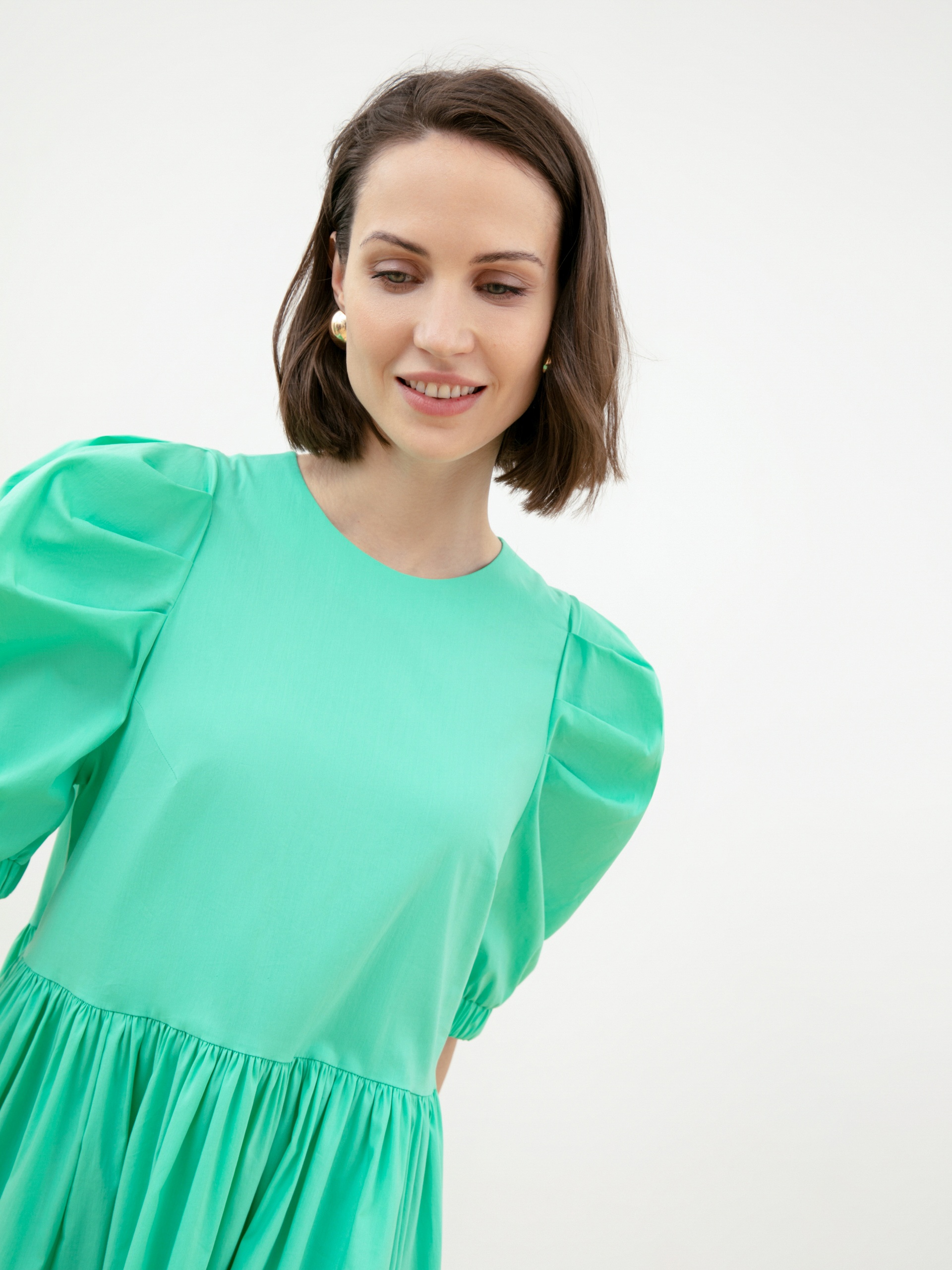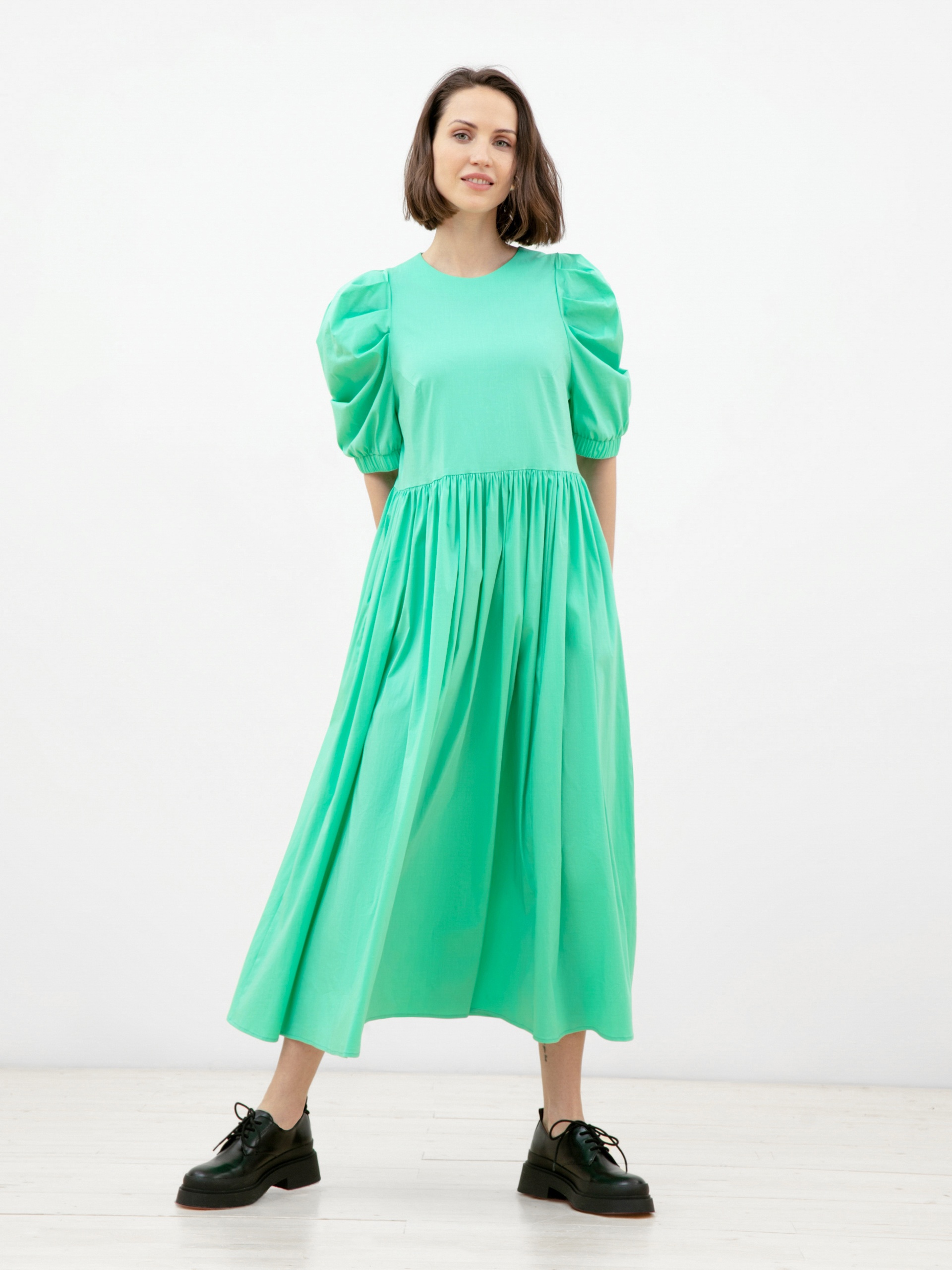 Хлопковое платье прямого ситуэта, отрезное по линии талии. Юбка собрана на сборку для придания образу нежности и романтизма. Выполнено из ткани нежного мятно-зеленого оттенка.