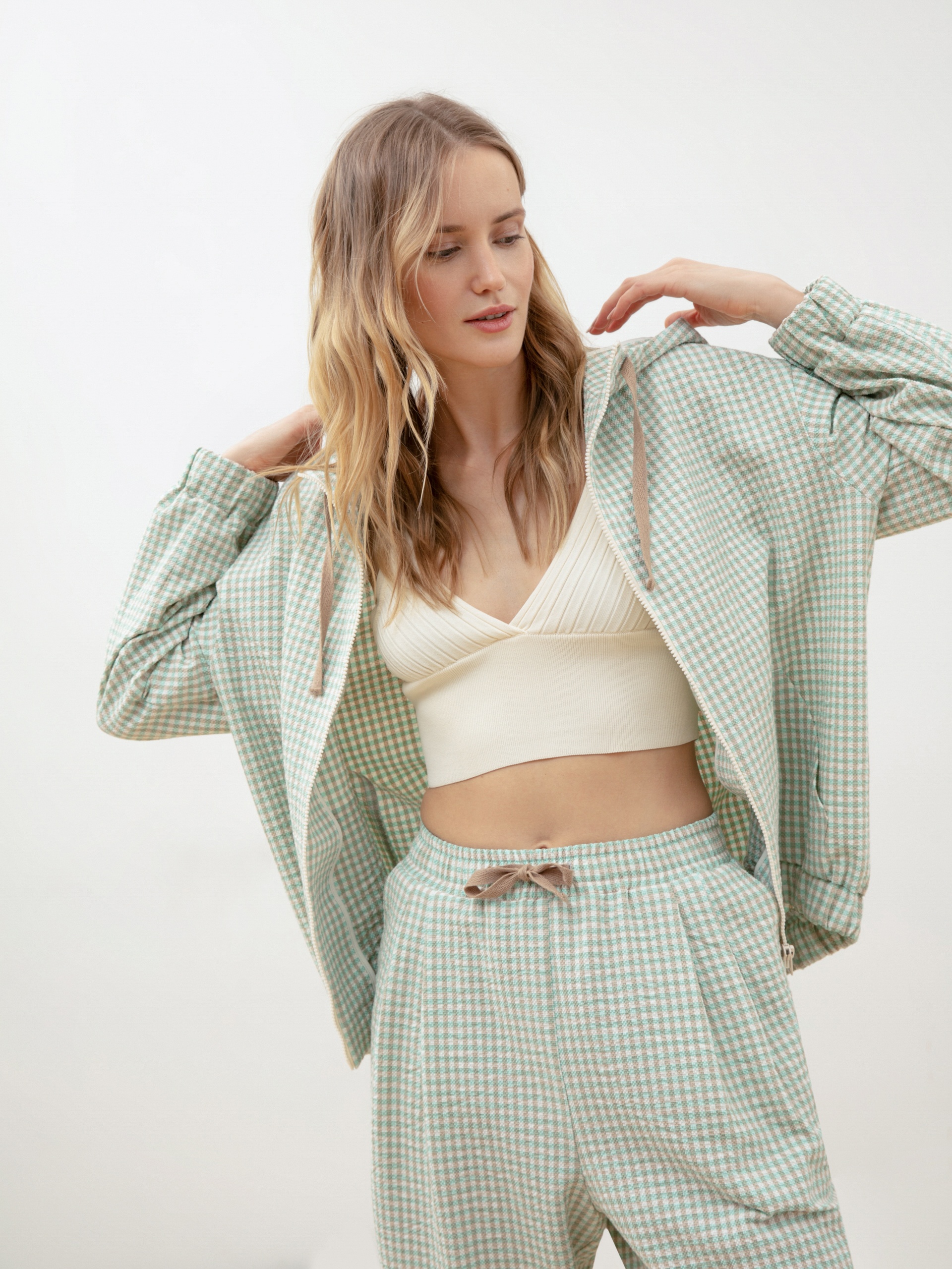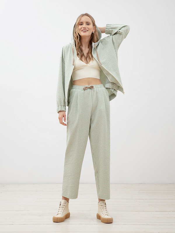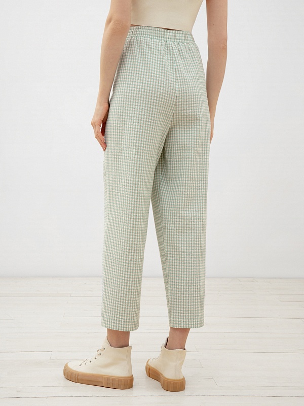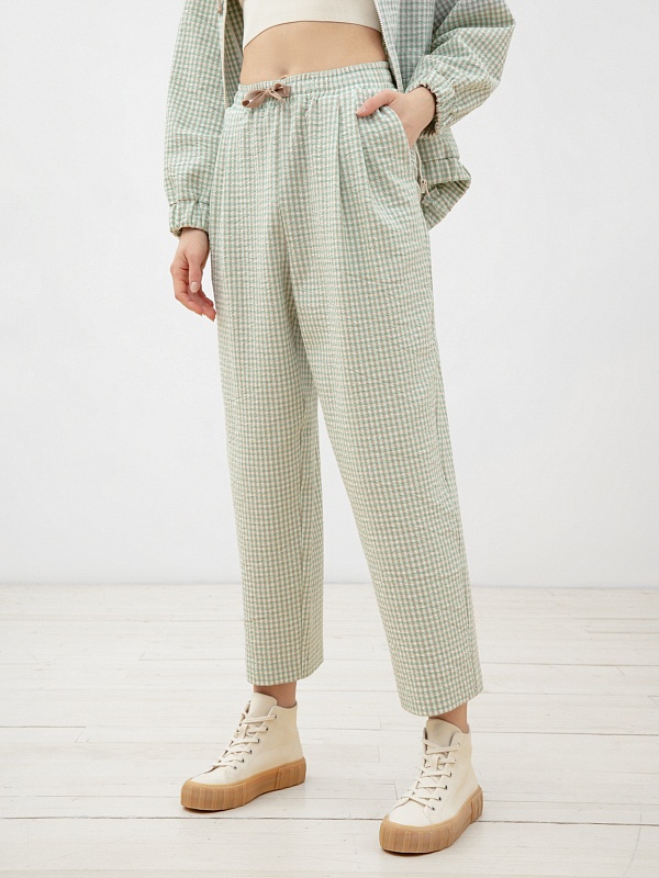 Укороченные брюки-бананы из хлопковой ткани в нежную мятную клетку. Пояс брюк собран на резинку для наилучшей посадки и комфорта в носке. Низ брюк обработан декоративной манжетой.
