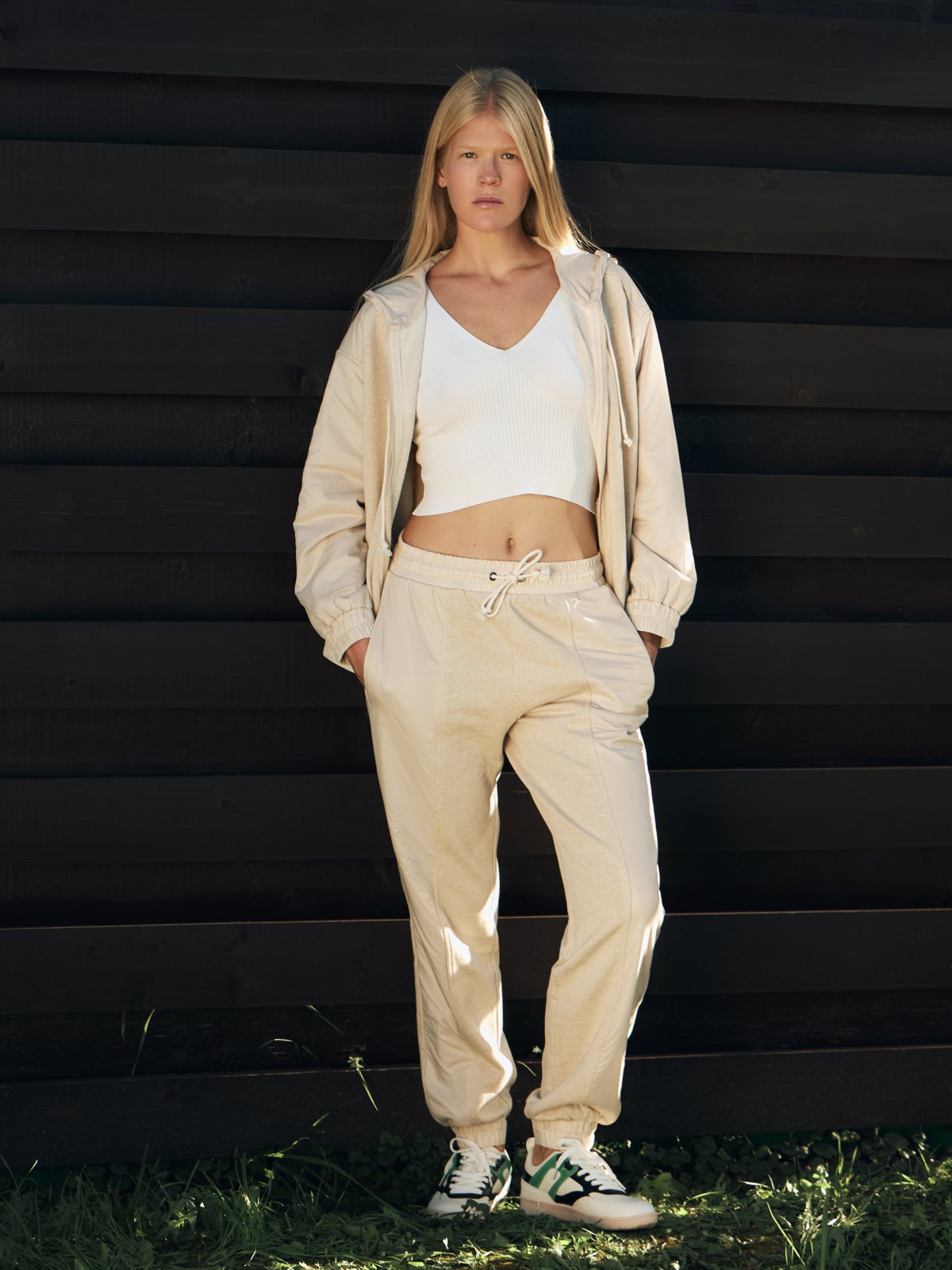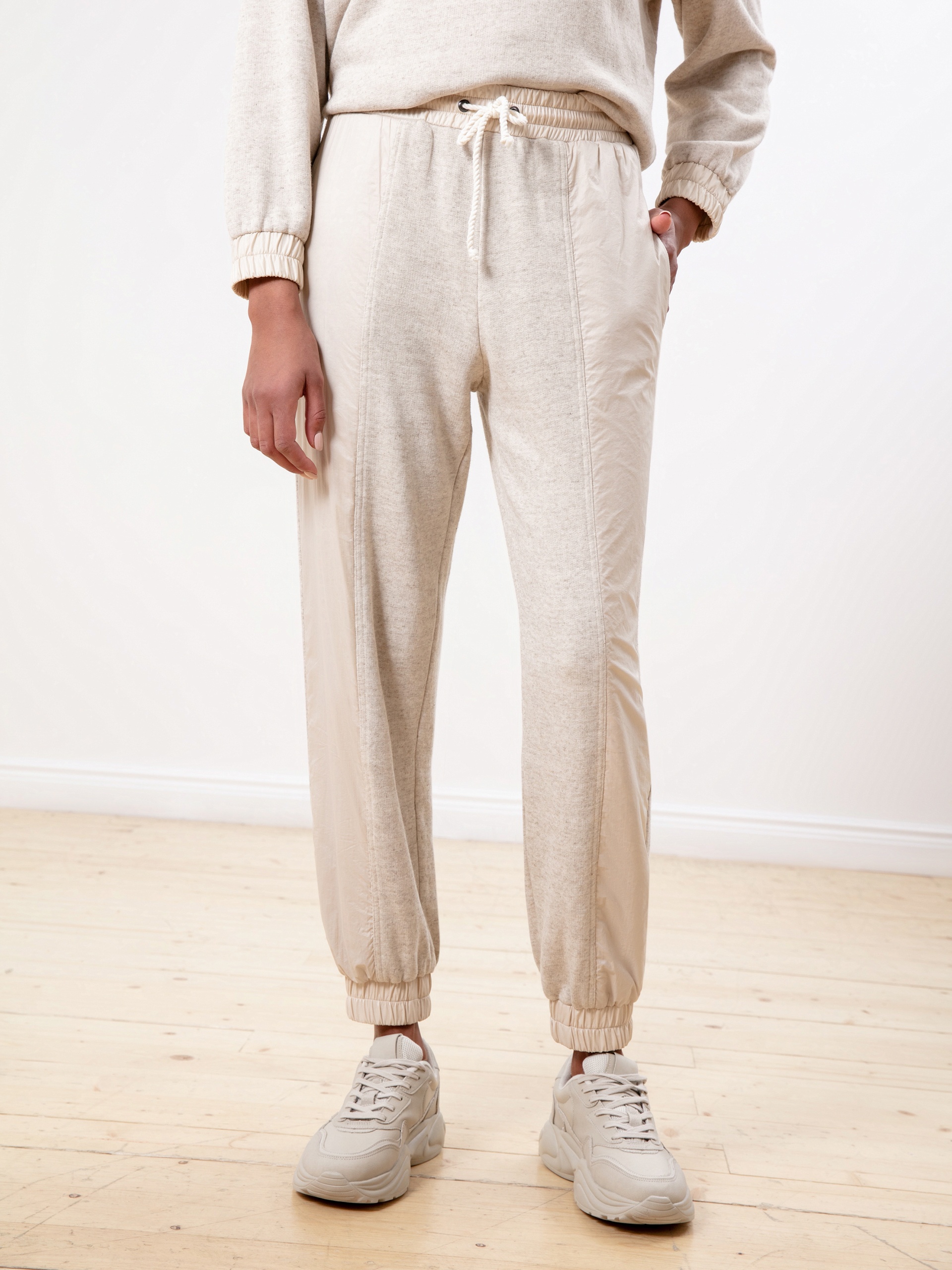 Спортивные трикотажные женские брюки-джоггеры со вставками из плащевой ткани, выполненные в стиле спорт-шик.