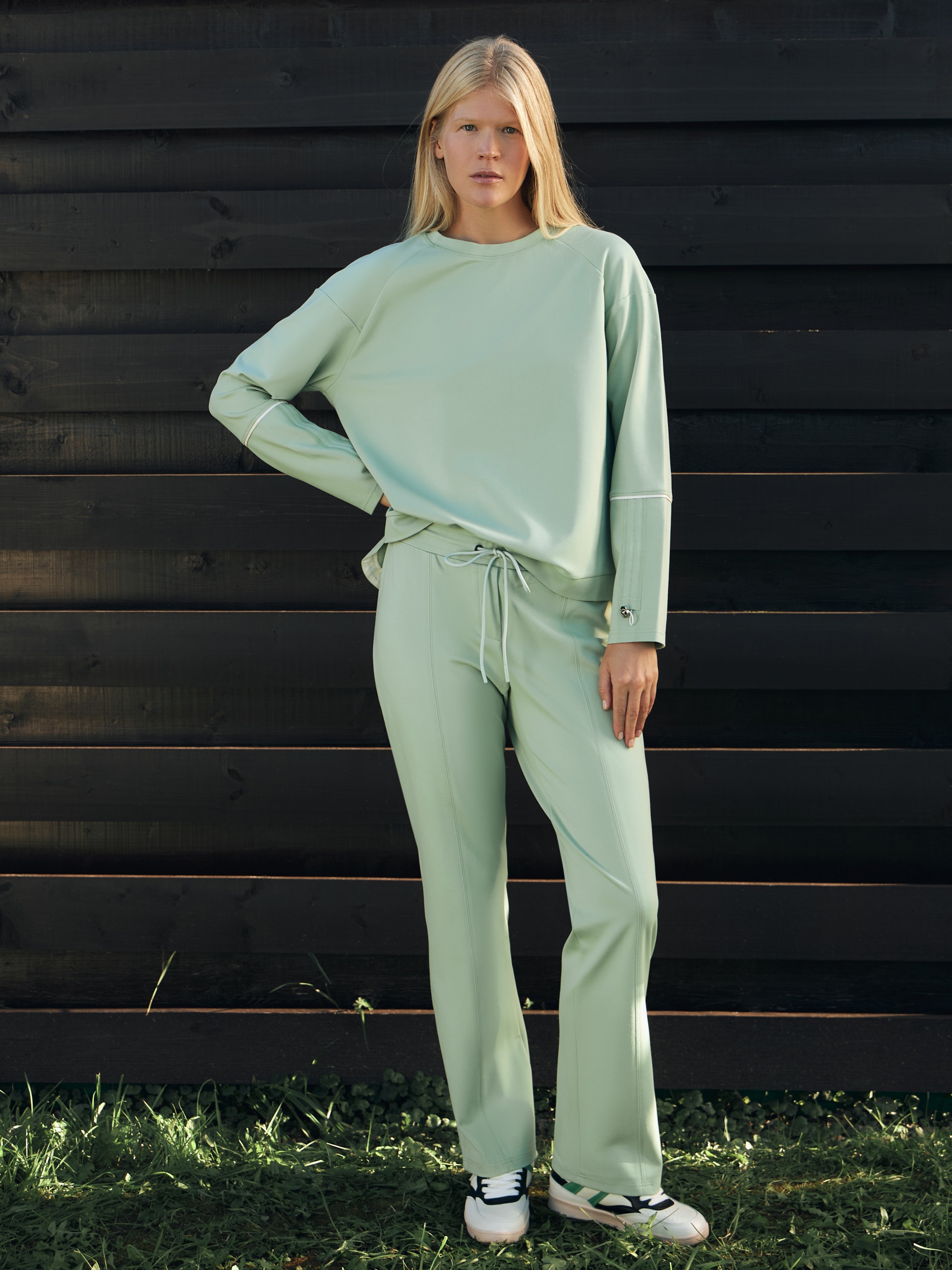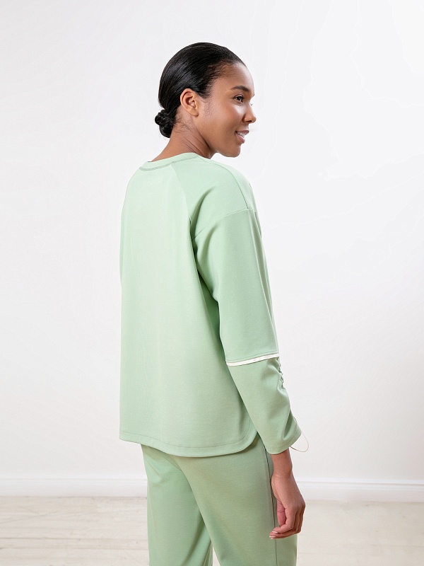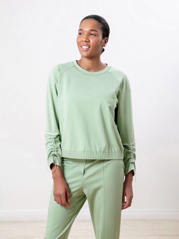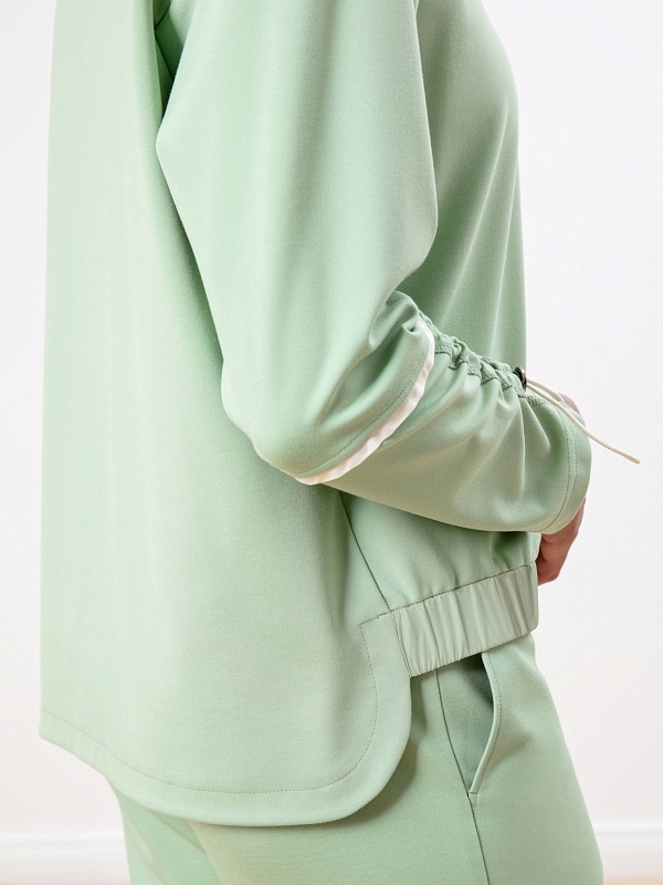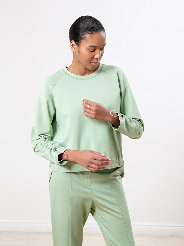 Женский свитшот из мягкого трикотажа в ментоловом цвете. Втачной рукав со спущенным плечом, круглая горловина и кулиски на рукавах. Идеально впишется в комплект к брюкам из этого же материала.