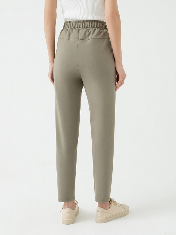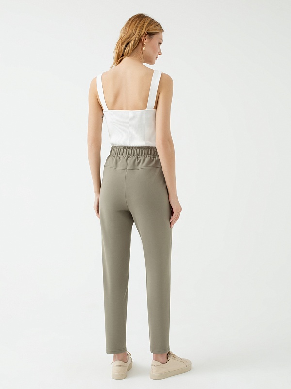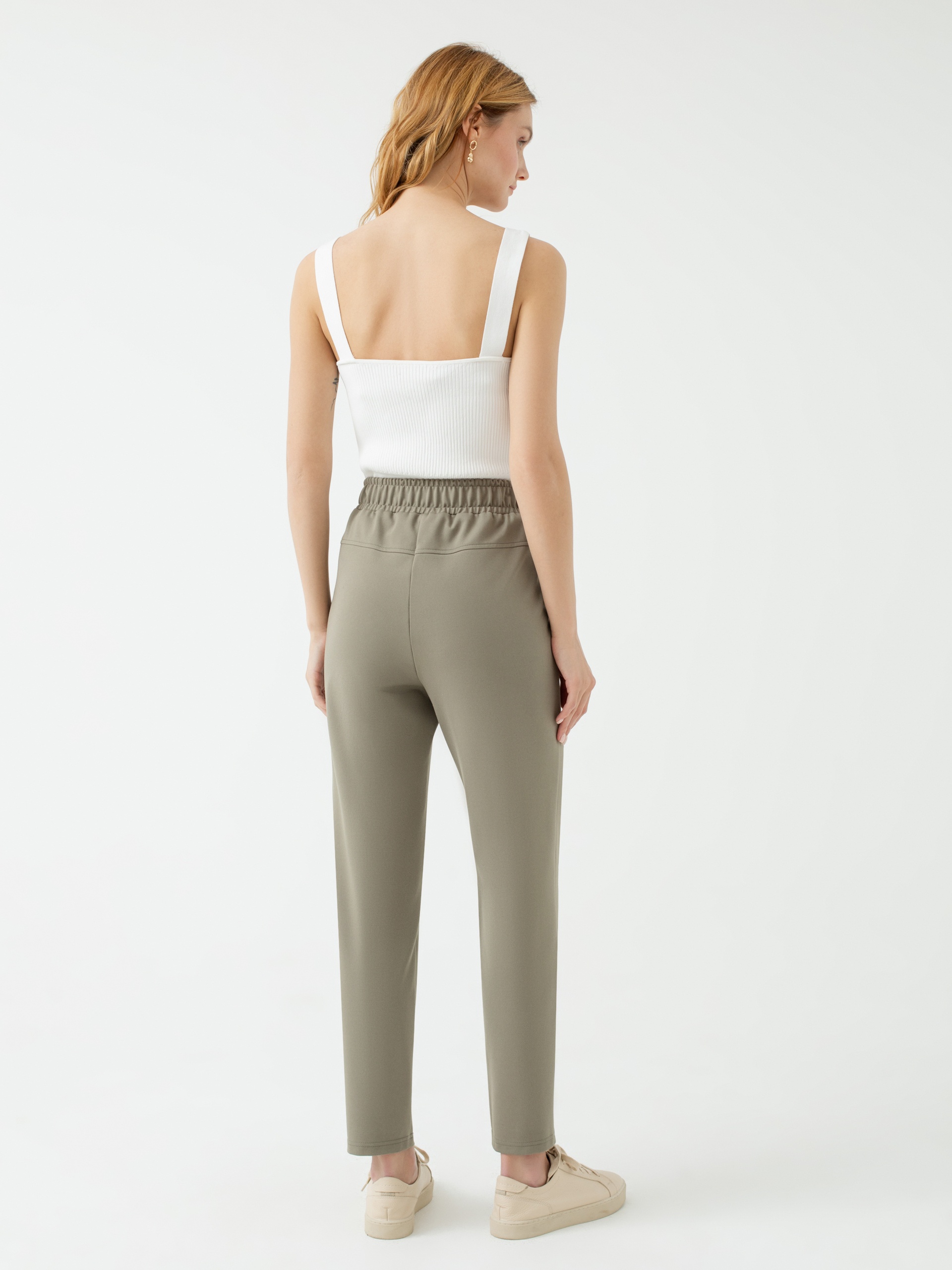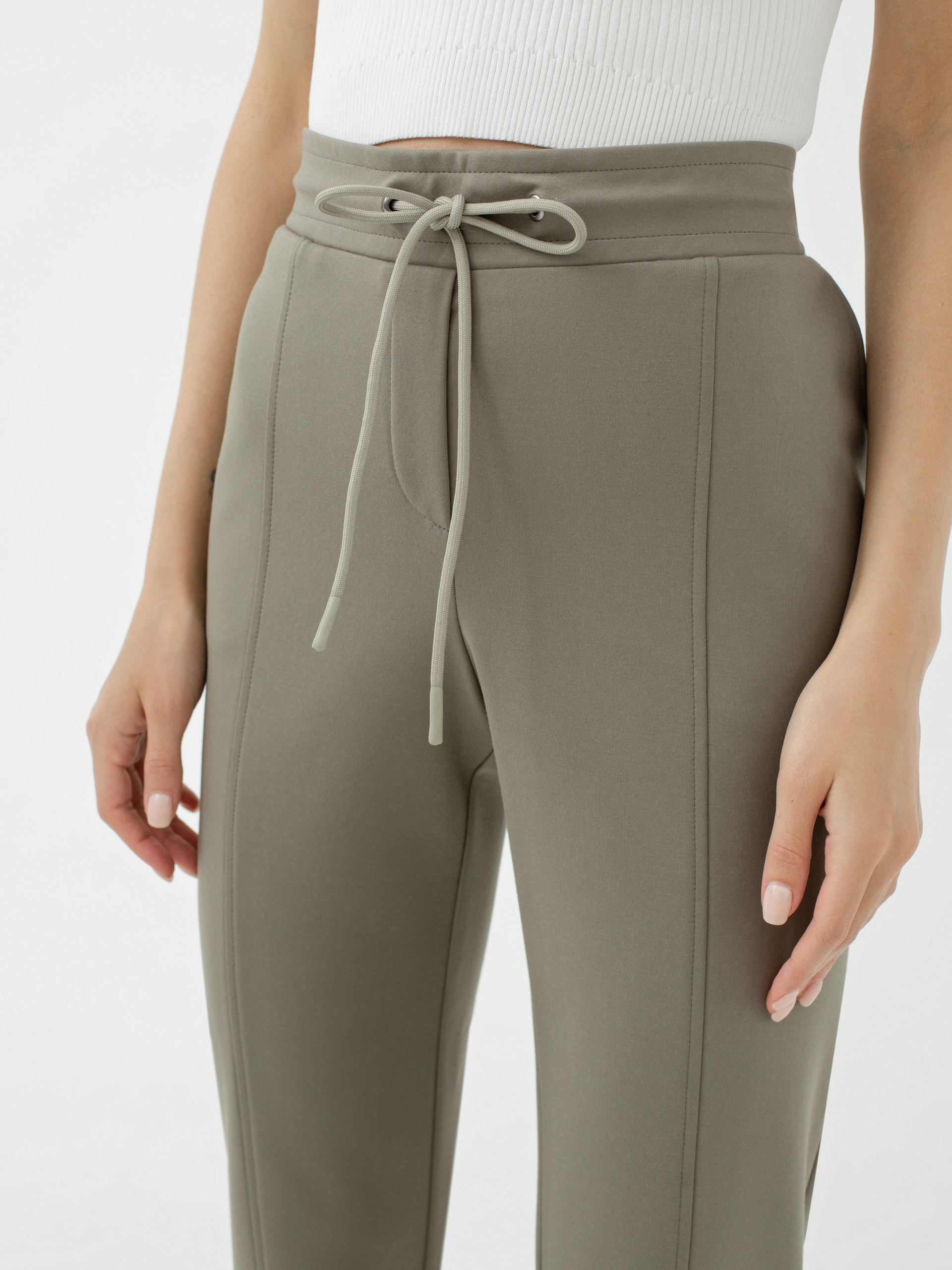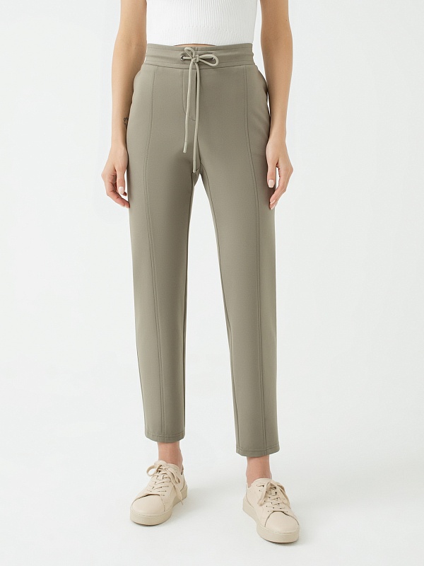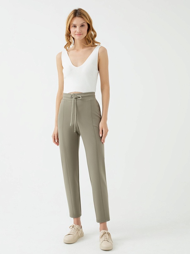 Спортивные женские прямые брюки из трикотажного полотна с резинкой в поясе и завязками. Цвет оливковый.