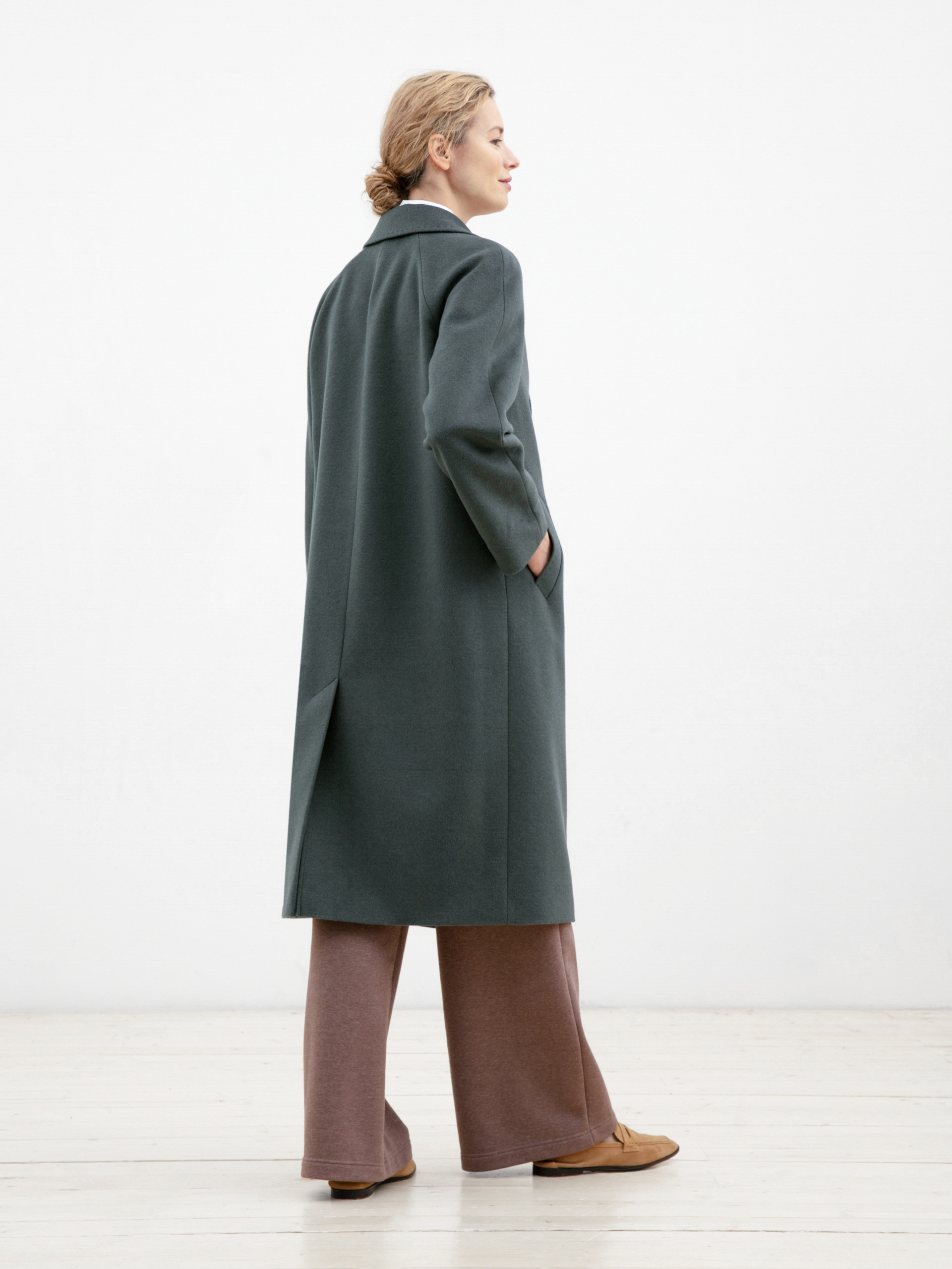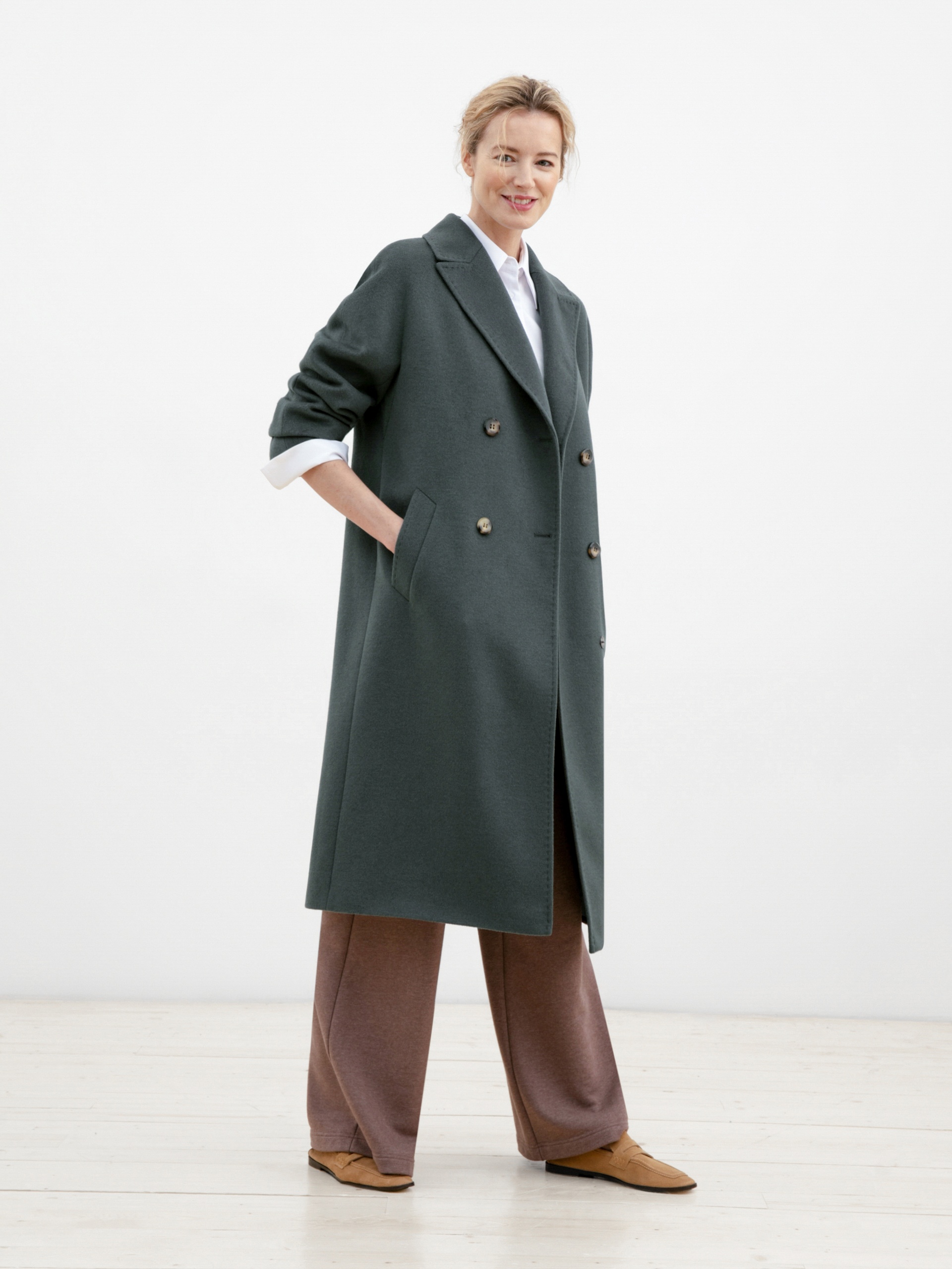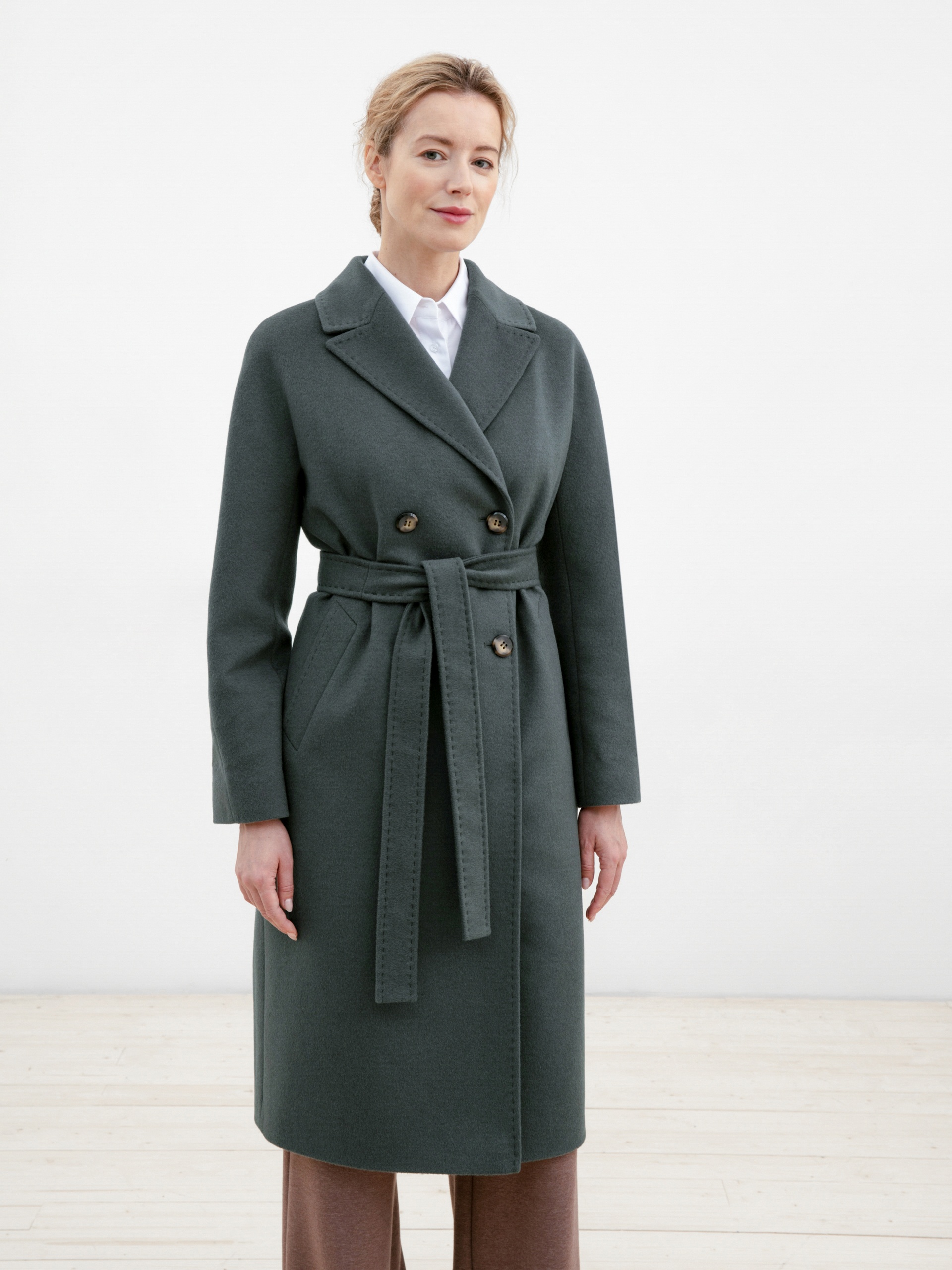 Двубортное прямое пальто цвета хаки с поясом - незаменимая классика. Прекрасно сочетается как с брюками, так и с юбками или платьями.Особенности: