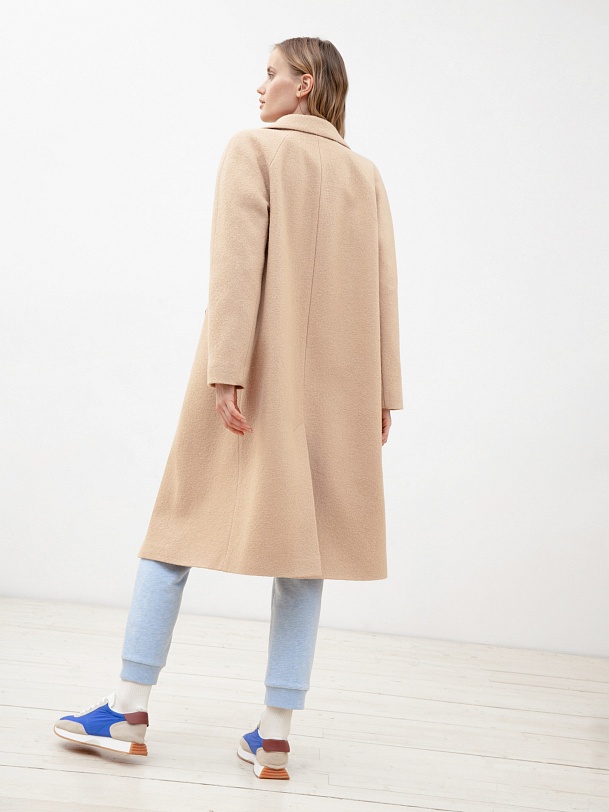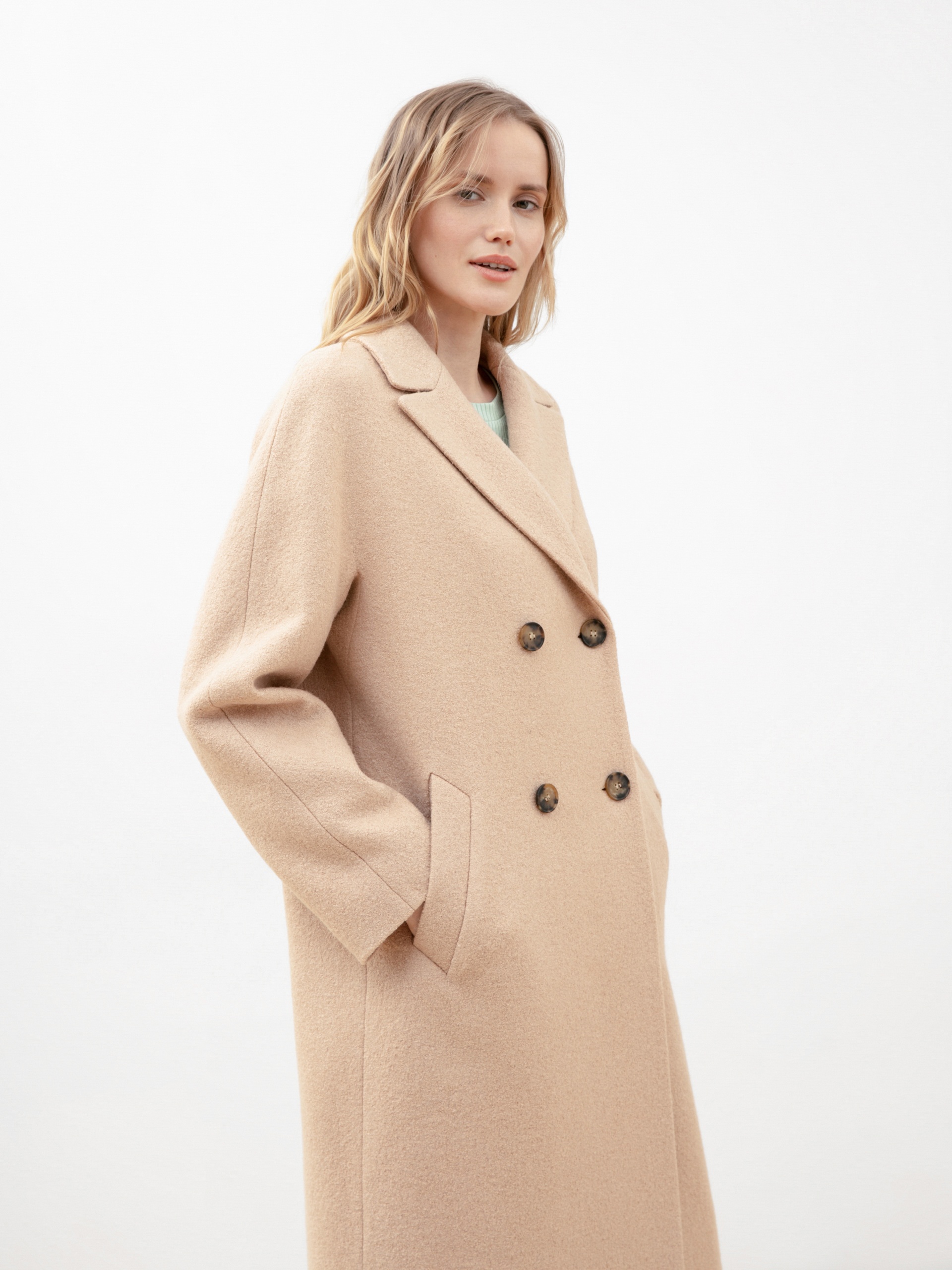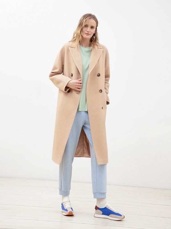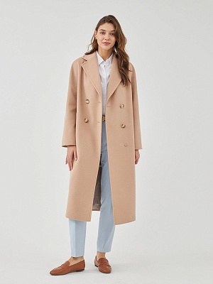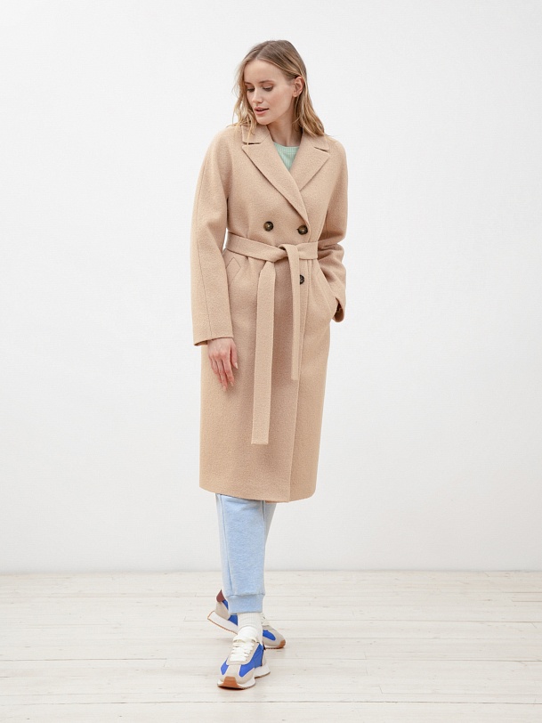 Двубортное прямое пальто бежевого цвета с поясом - незаменимая классика. Прекрасно сочетается как с брюками, так и с юбками или платьями.Особенности: