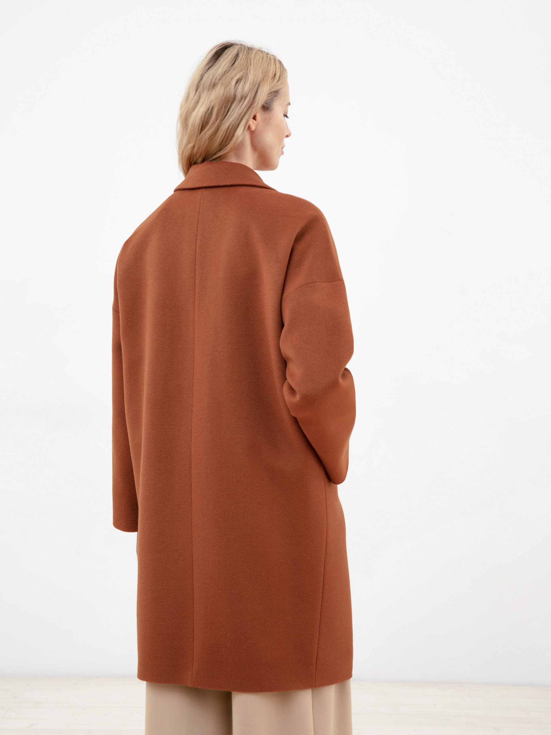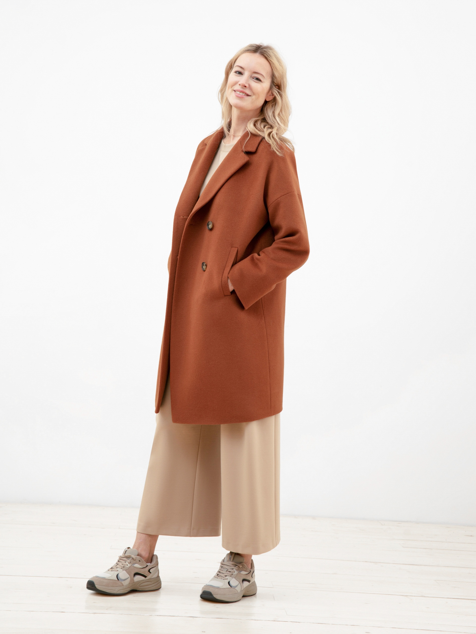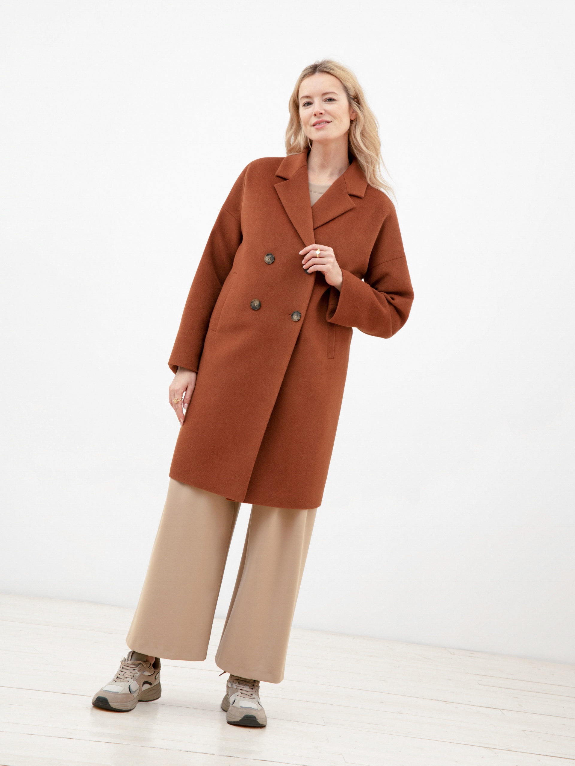 Двубортное пальто с характерным "О" силуэтом - универсальная вещь для любого гардероба. Рубашечный рукав со спущеной линией плеча создает дополнительный комфорт, что дает возможность носить под пальто такие вещи, как жакеты и при этом не затрудняет движение. Пальто имеет два глубоких и функциональных кармана с листочками, два ряда крупных пуговиц под натуральный рог и классический английский воротник. Длина пальто до колена, что позволяет сочетать его с юбками и брюками разной длины. Пальто выполнено из премиальной шерстяной ткани цвета "корица". Произведено с высокотехнологичной мембраной Raft Pro, которая защитит от дождя и самого сильного ветра. Произведено в Санкт-Петербурге.