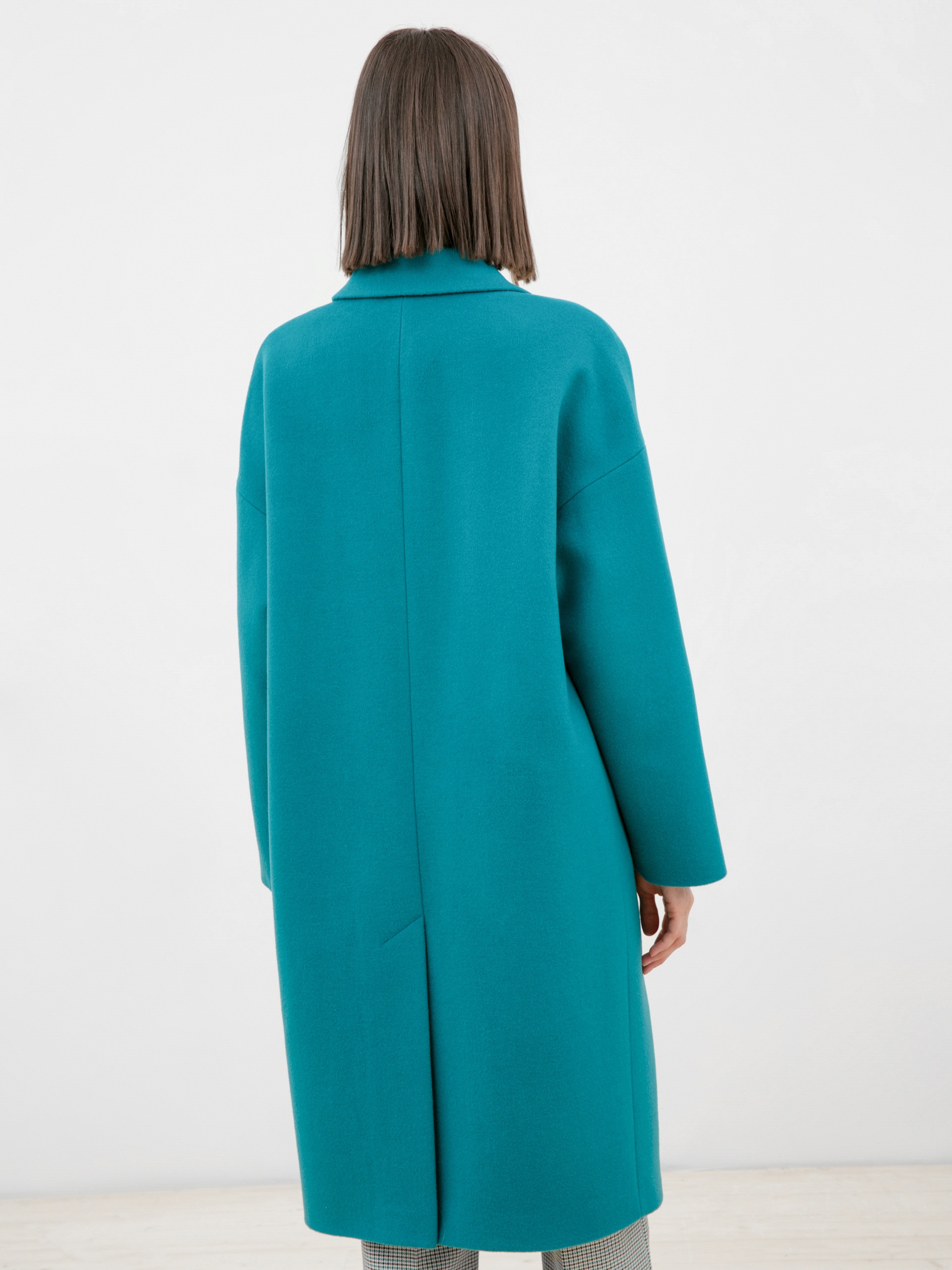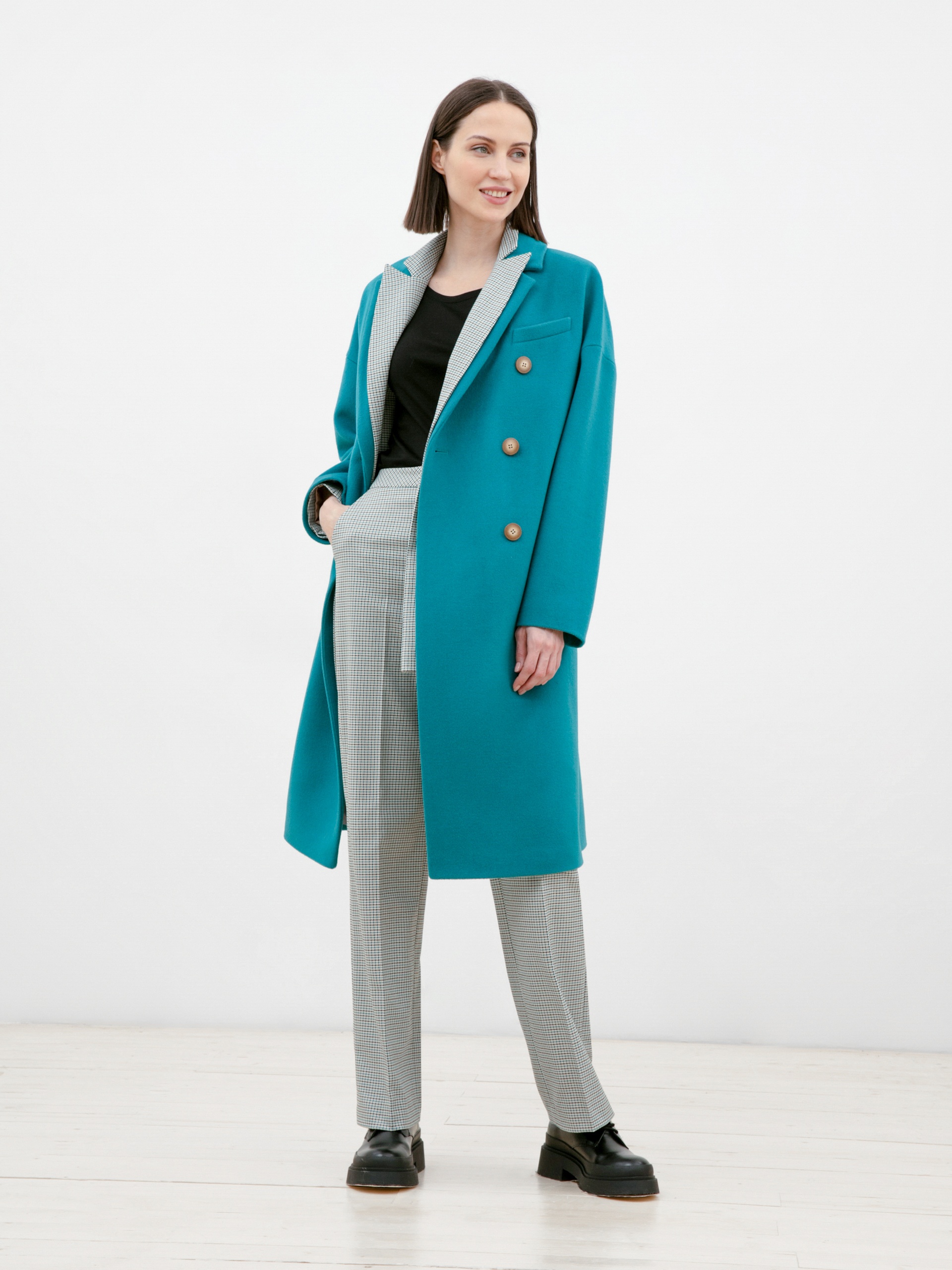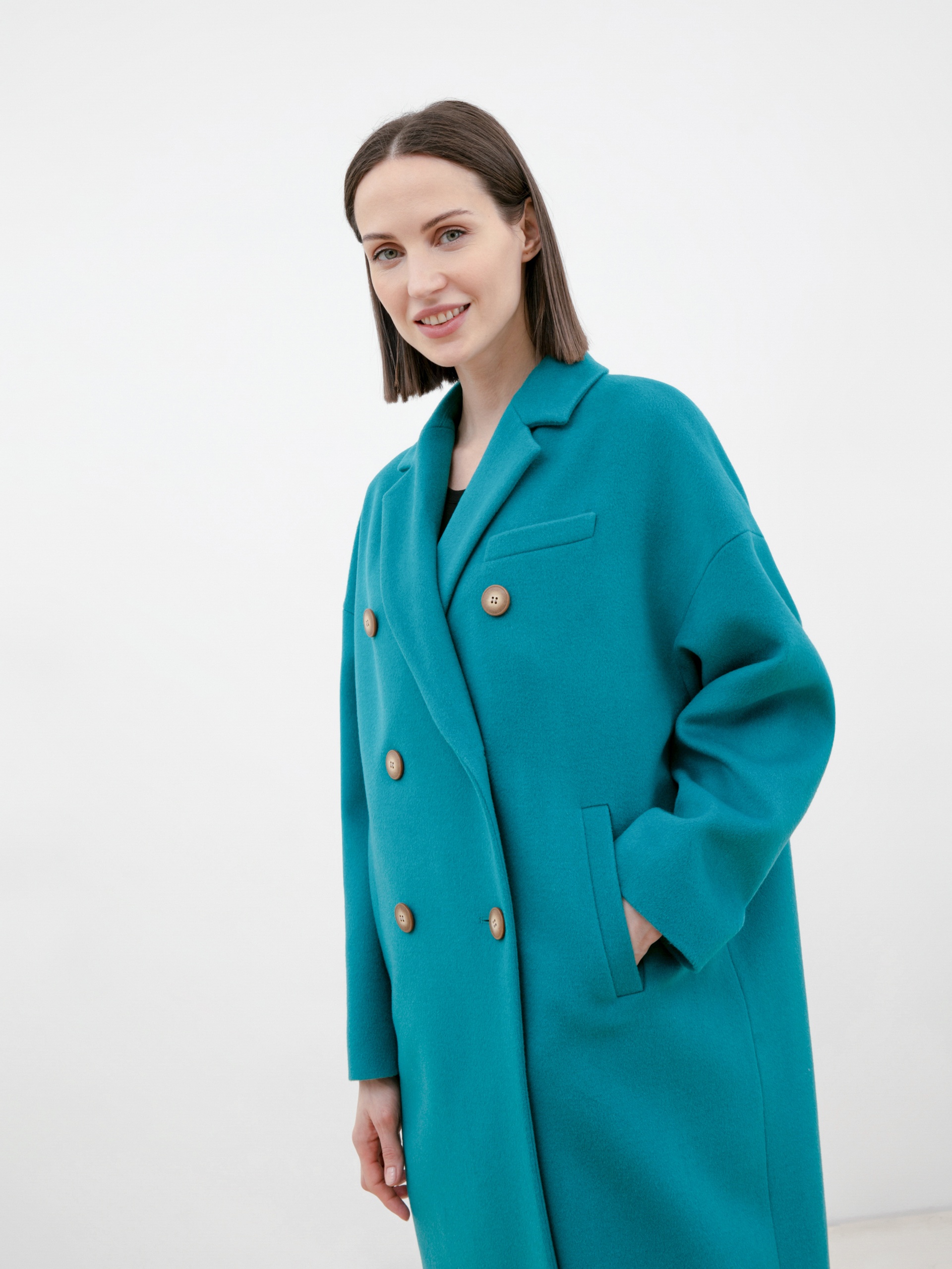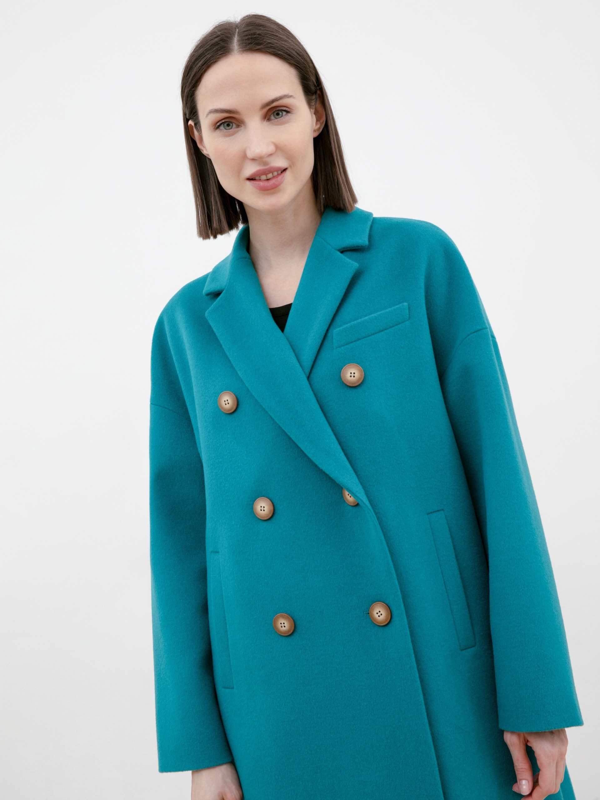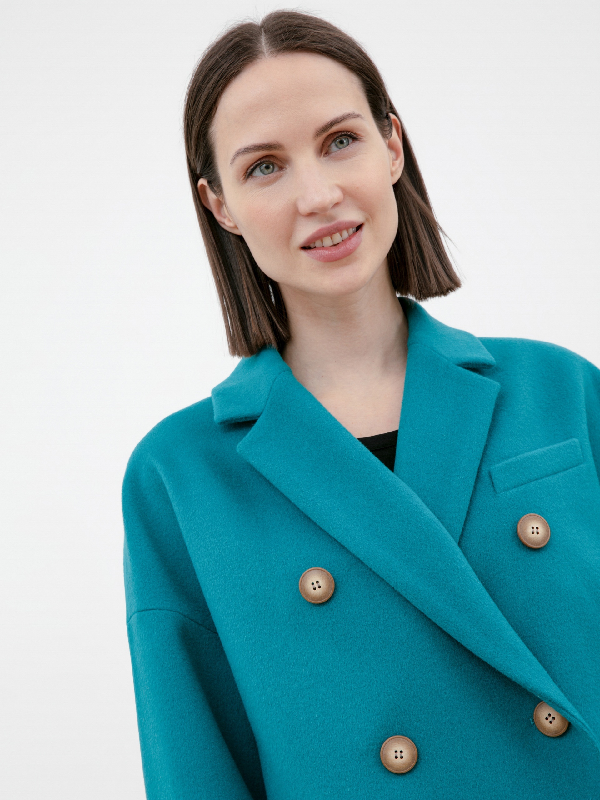 Двубортное укороченное пальто из премиальной ткани с 80% содержанием шерсти в роскошном бирюзовом цвете. Универсальная длина пальто закрывает колено и позволяет с легкостью комбинировать его с любым гардеробом. Рубашечный рукав дает возможность носить пальто даже на объемные вещи и при этом не стесняет движение, классический английский воротник придает элегантности, а карманы-листочки служат дополнительным декоративным элементом, как и застежка на два ряда крупных пуговиц под натуральный рог. Пальто изготовлено из шерстяной ткани с использованием запатентованных технологий в виде высокотехнологичной мембраны RaftPro, которая защищает даже от сильного ветра. Произведено в Санкт-Петербурге.