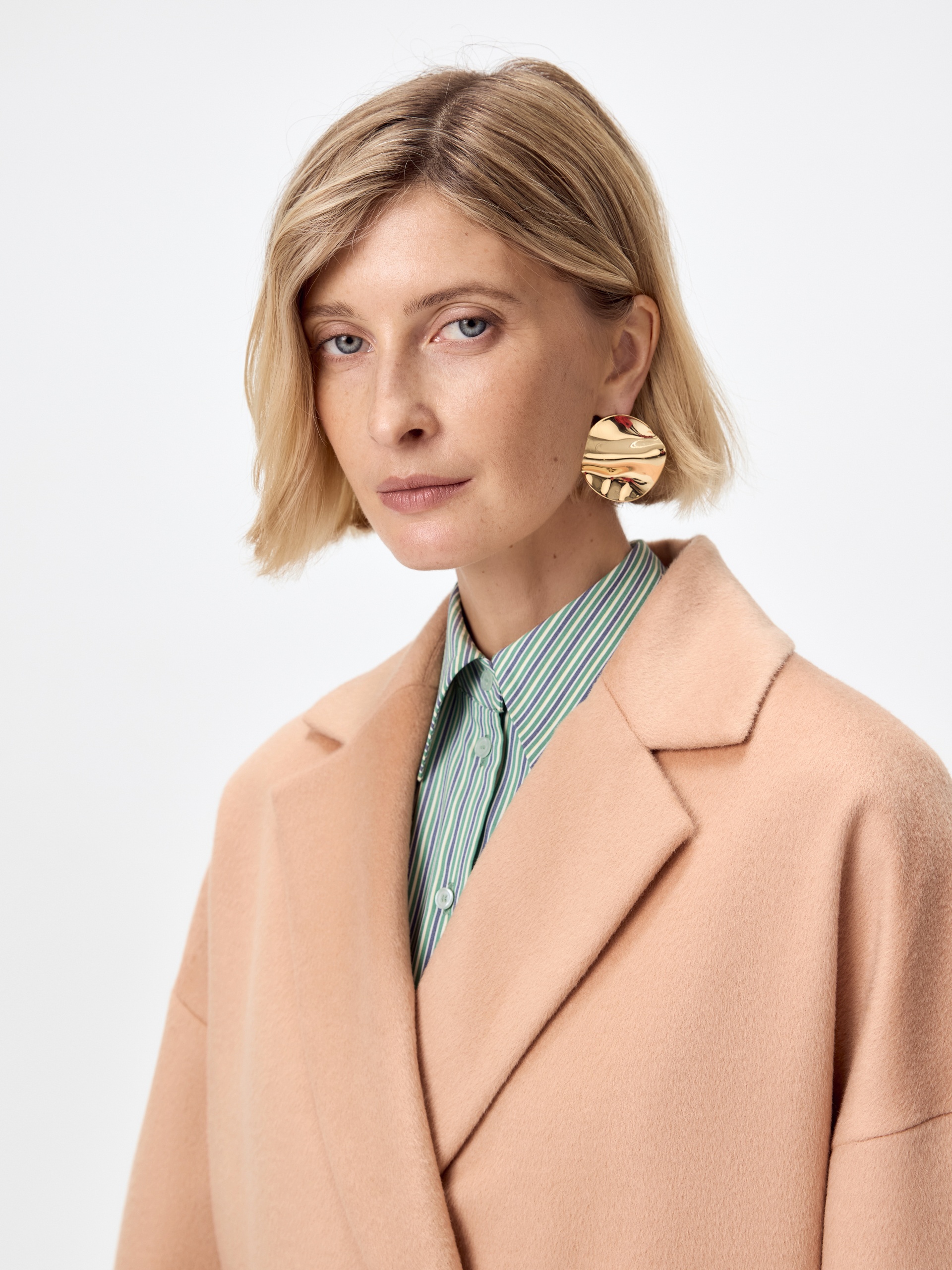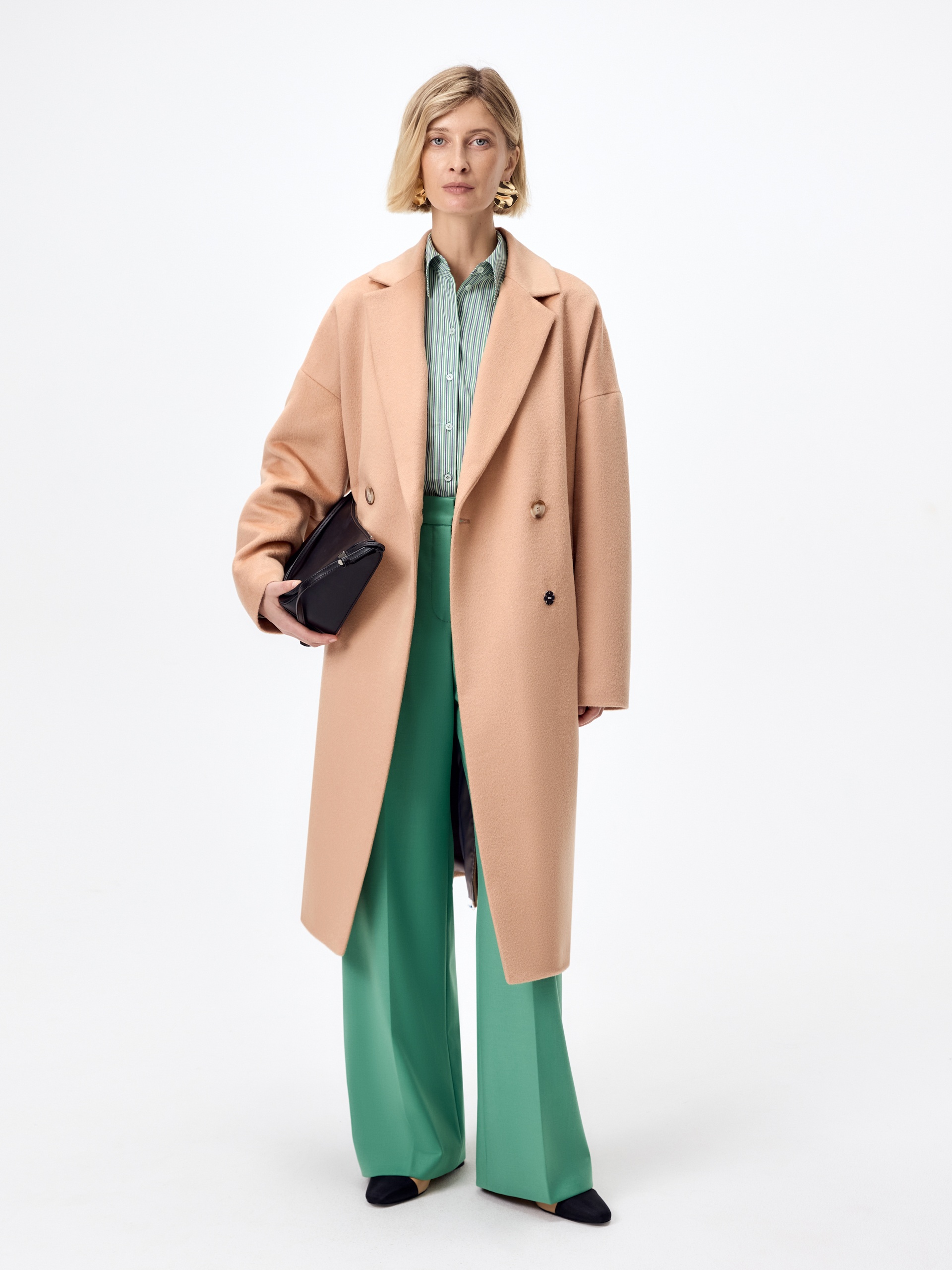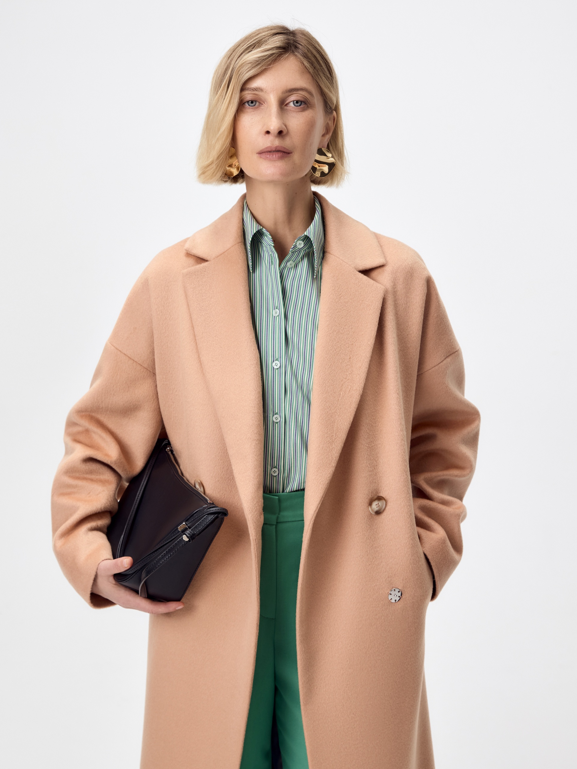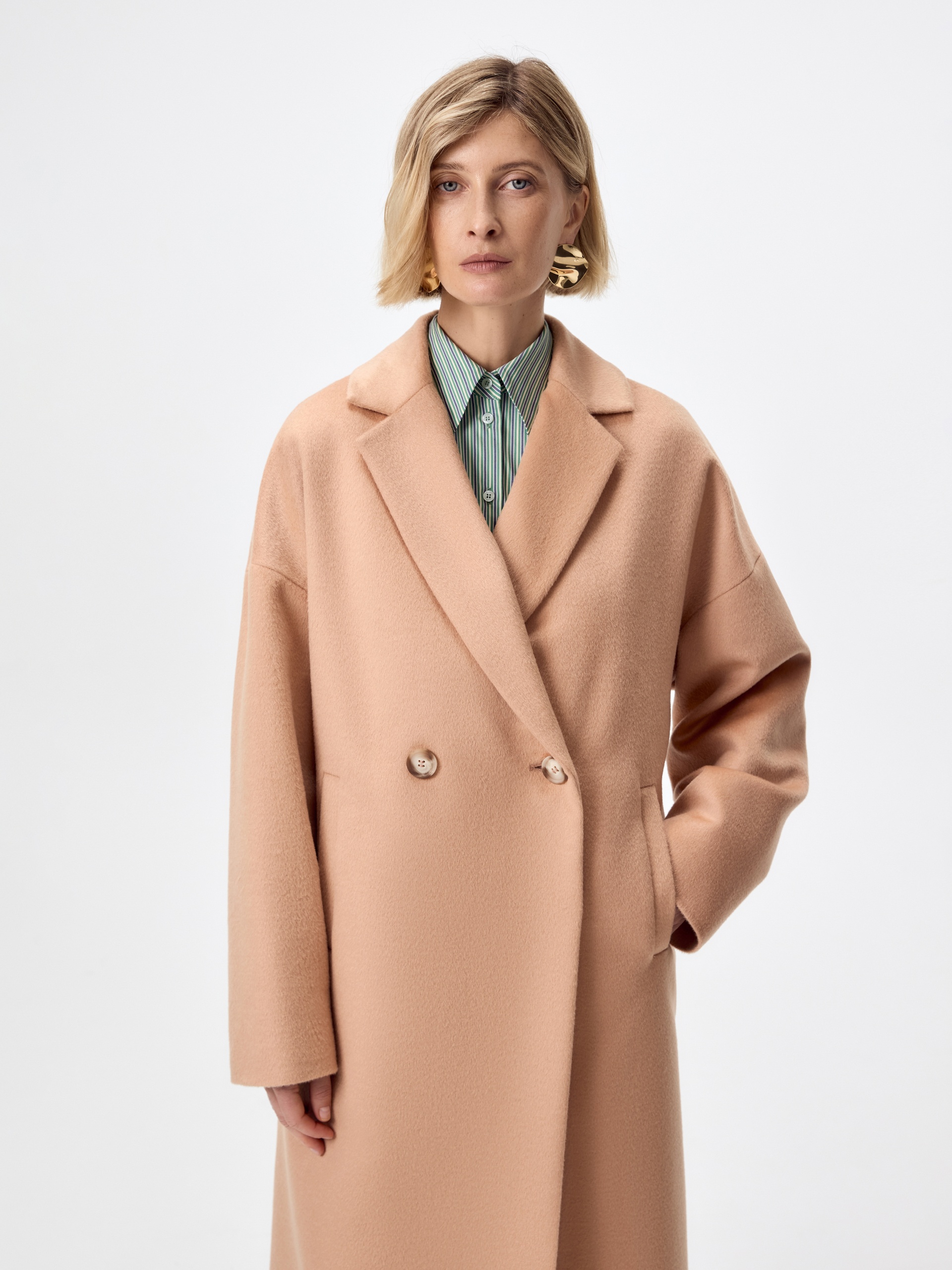 Двубортное укороченное пальто из премиальной ткани с 70% содержанием шерсти в бежевом цвете. Универсальная длина пальто чуть ниже колена позволяет с легкостью комбинировать его с любыми вещами. Комфортный рубашечный рукав дает возможность носить пальто даже на объемные вещи и при этом не стесняет движений, классический английский воротник придает пальто элегантности, а карманы-листочки служат дополнительным декоративным элементом, как и застежка на два ряда крупных пуговиц под натуральный рог. Пальто изготовлено из шерстяной ткани с использованием запатентованных технологий - высокотехнологичная мембрана RaftPro защищает даже от сильного ветра. Произведено в Санкт-Петербурге.