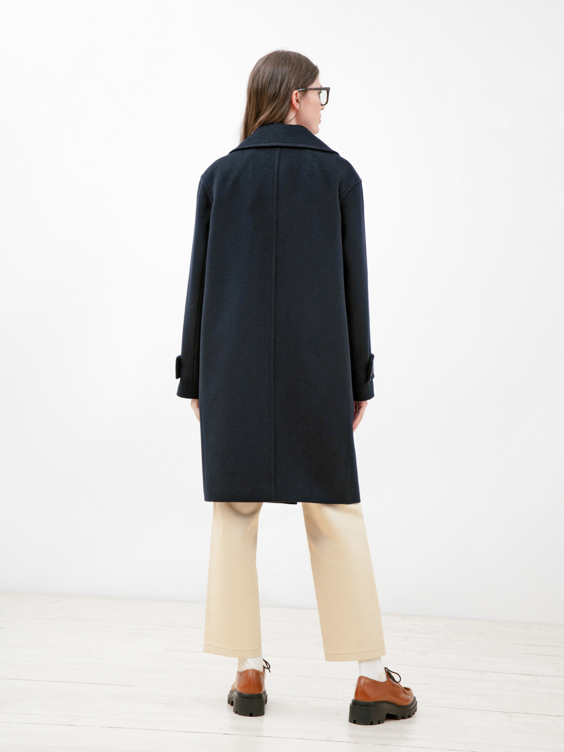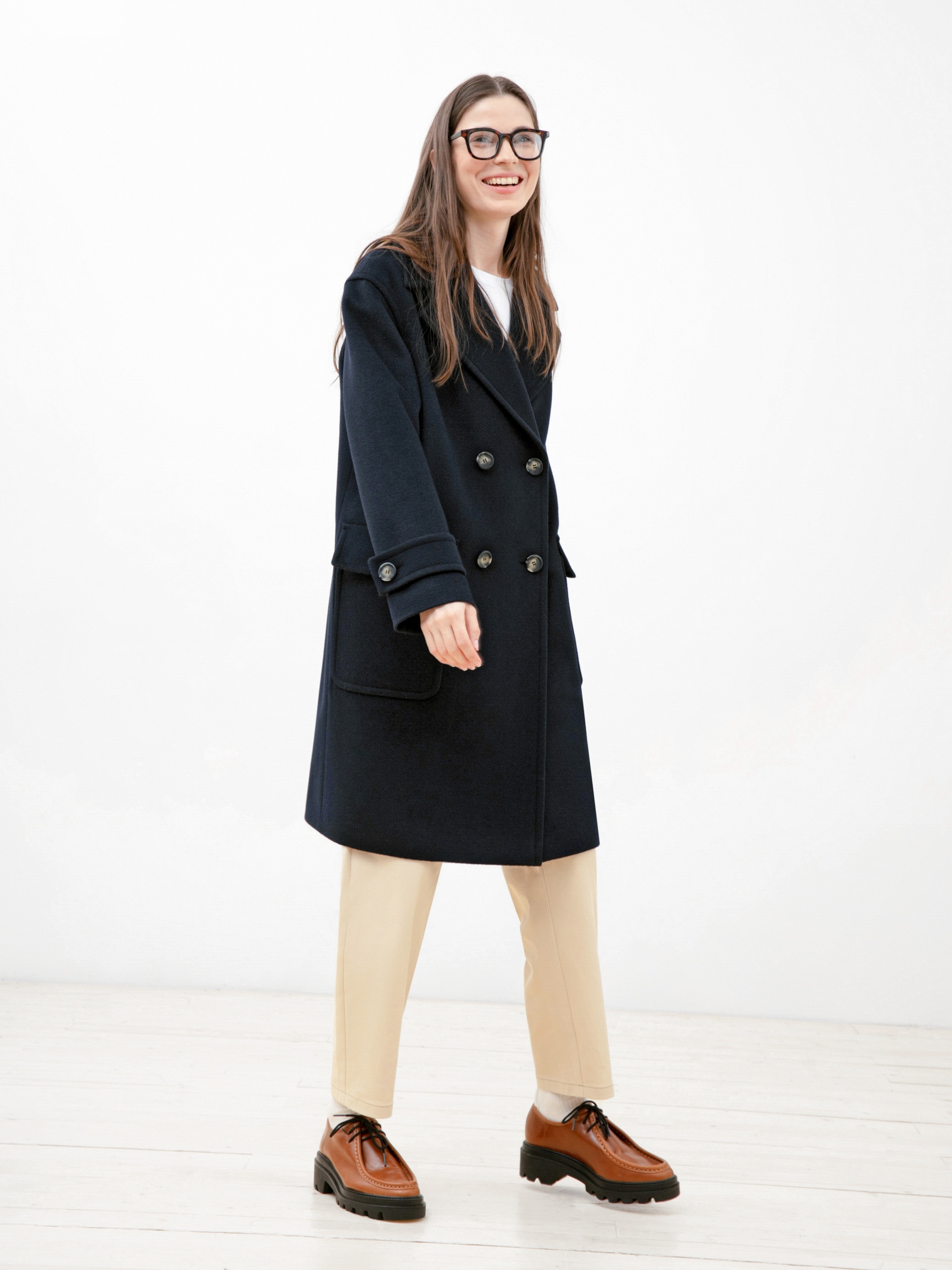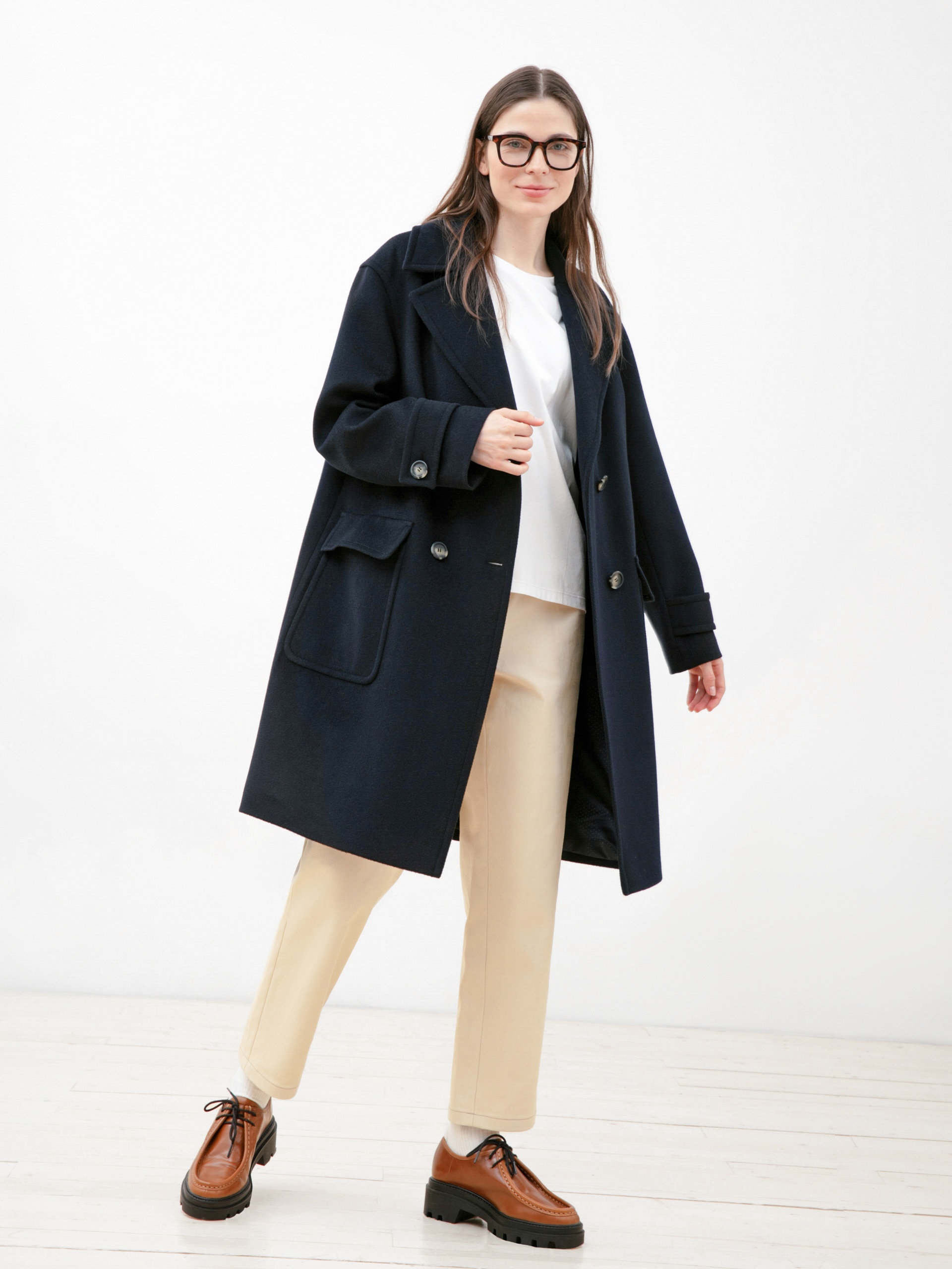 Двубортное пальто из премиальной шерстяной ворсовой ткани темно-синего цвета с 70% содержанием шерсти. Длина пальто до колена, что позволяет комбинировать его с большим колличеством повседневных образов. Рубашечный рукав с декоративной отделочной строчкой создают современную линию плеча , а широкий английский воротник придает пальто геометричности. По низу рукава декоративные паты с крупными роговыми пуговицами. Функциональные крупные карманы с декоративными клапанами поддерживают образ и дополняют его. Застежка на два ряда крупных пуговиц под имитацию натурального рога. Выполнено пальто из ворсовой шерстяной ткани с использованием запатентованных технологий в виде высокотехнологичной мембраны Raft-Pro, которая надежно защитит от сильного дождя и ветра. Произведено в Санкт-Петербурге.