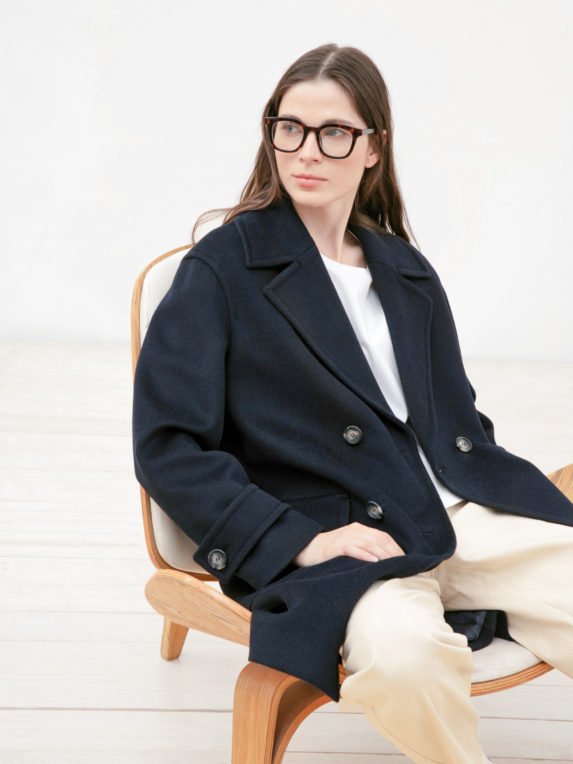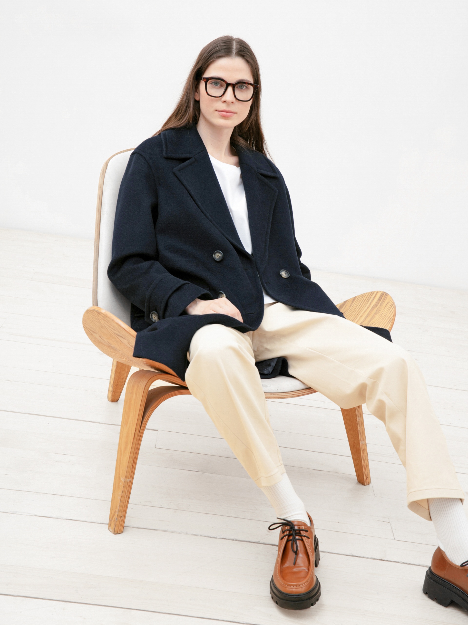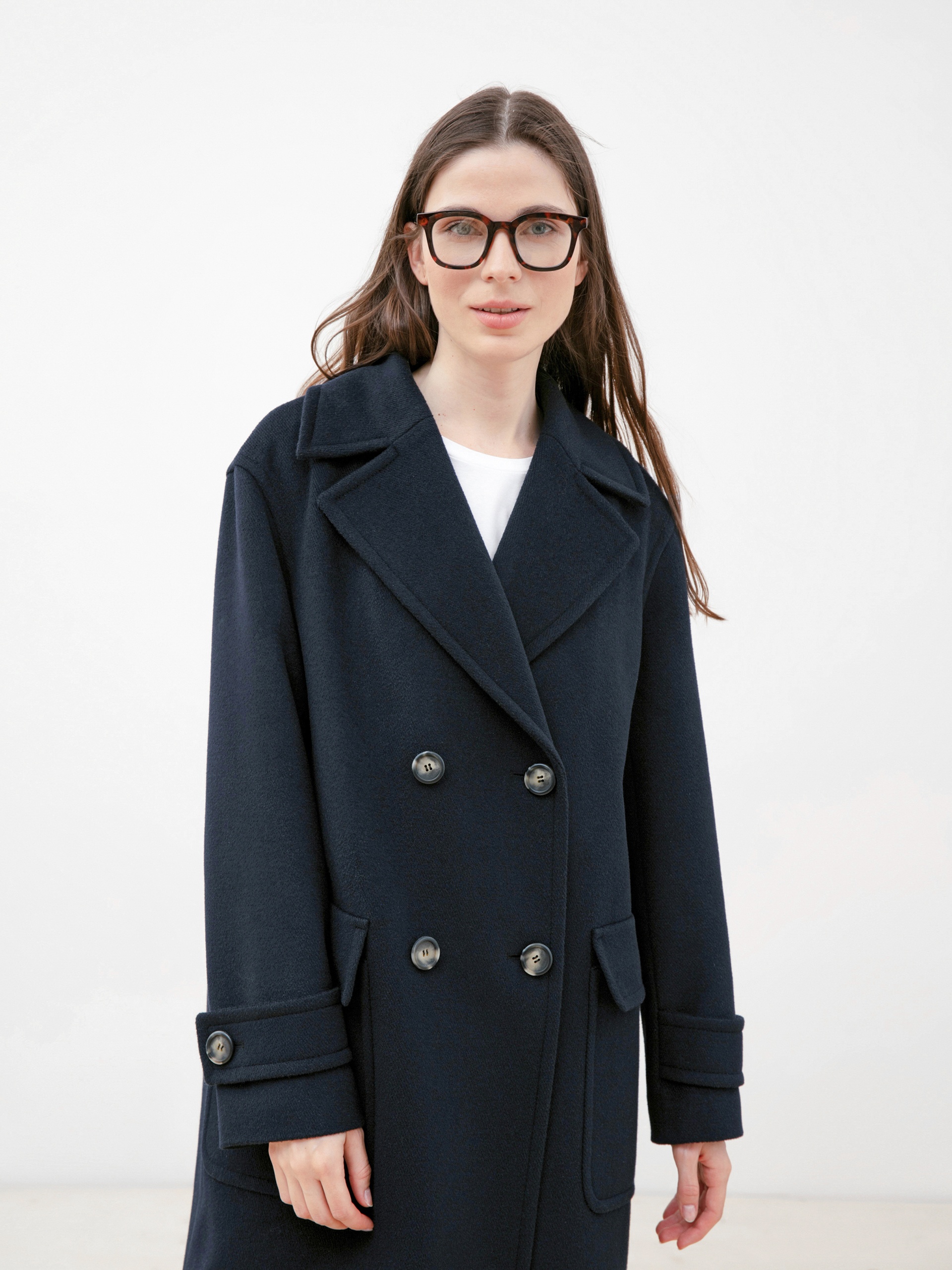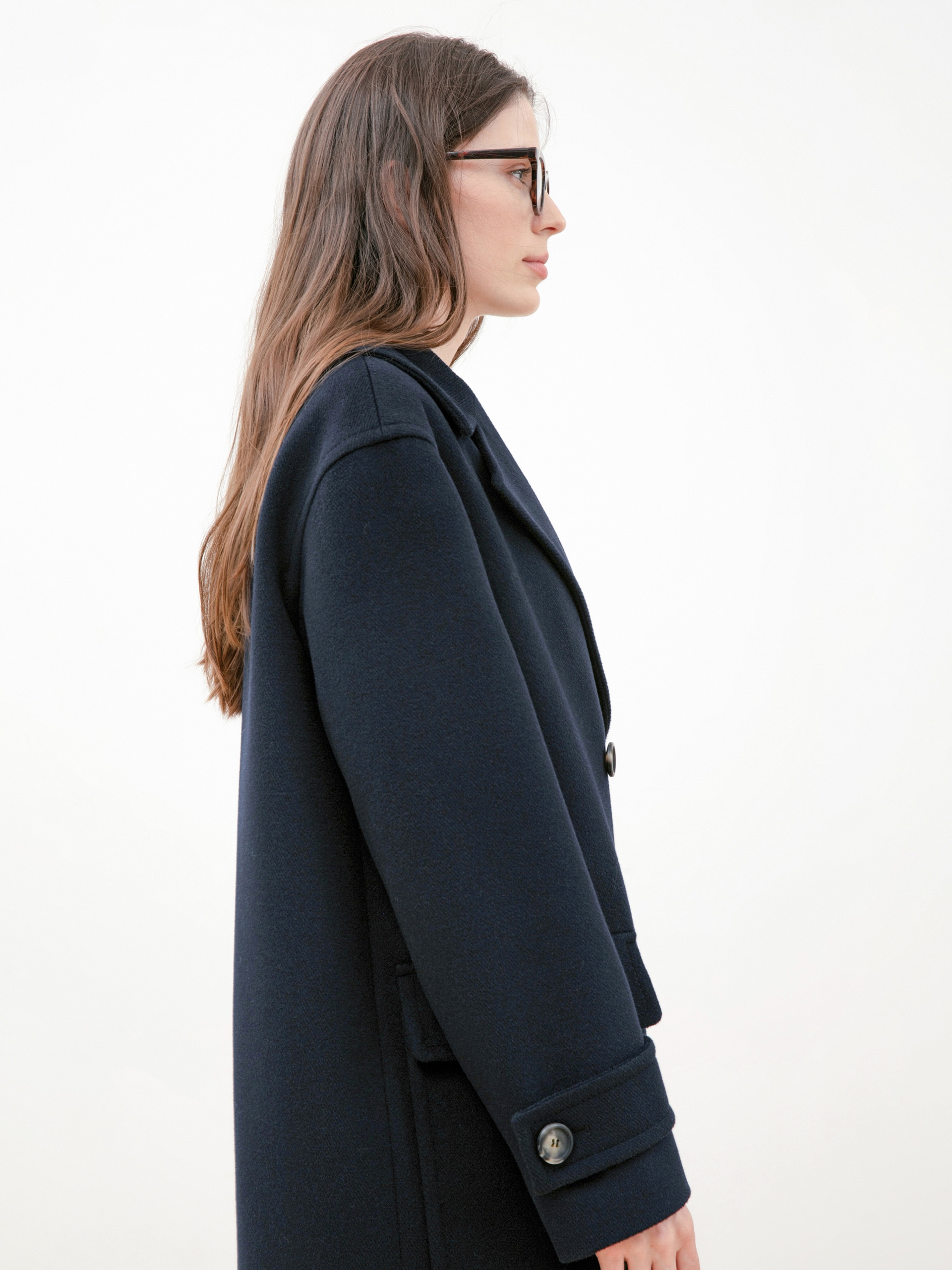 Двубортное пальто из премиальной шерстяной ворсовой ткани темно-синего цвета с 70% содержанием шерсти. Длина пальто до колена, что позволяет комбинировать его с большим колличеством повседневных образов. Рубашечный рукав с декоративной отделочной строчкой создают современную линию плеча , а широкий английский воротник придает пальто геометричности. По низу рукава декоративные паты с крупными роговыми пуговицами. Функциональные крупные карманы с декоративными клапанами поддерживают образ и дополняют его. Застежка на два ряда крупных пуговиц под имитацию натурального рога. Выполнено пальто из ворсовой шерстяной ткани с использованием запатентованных технологий в виде высокотехнологичной мембраны Raft-Pro, которая надежно защитит от сильного дождя и ветра. Произведено в Санкт-Петербурге.