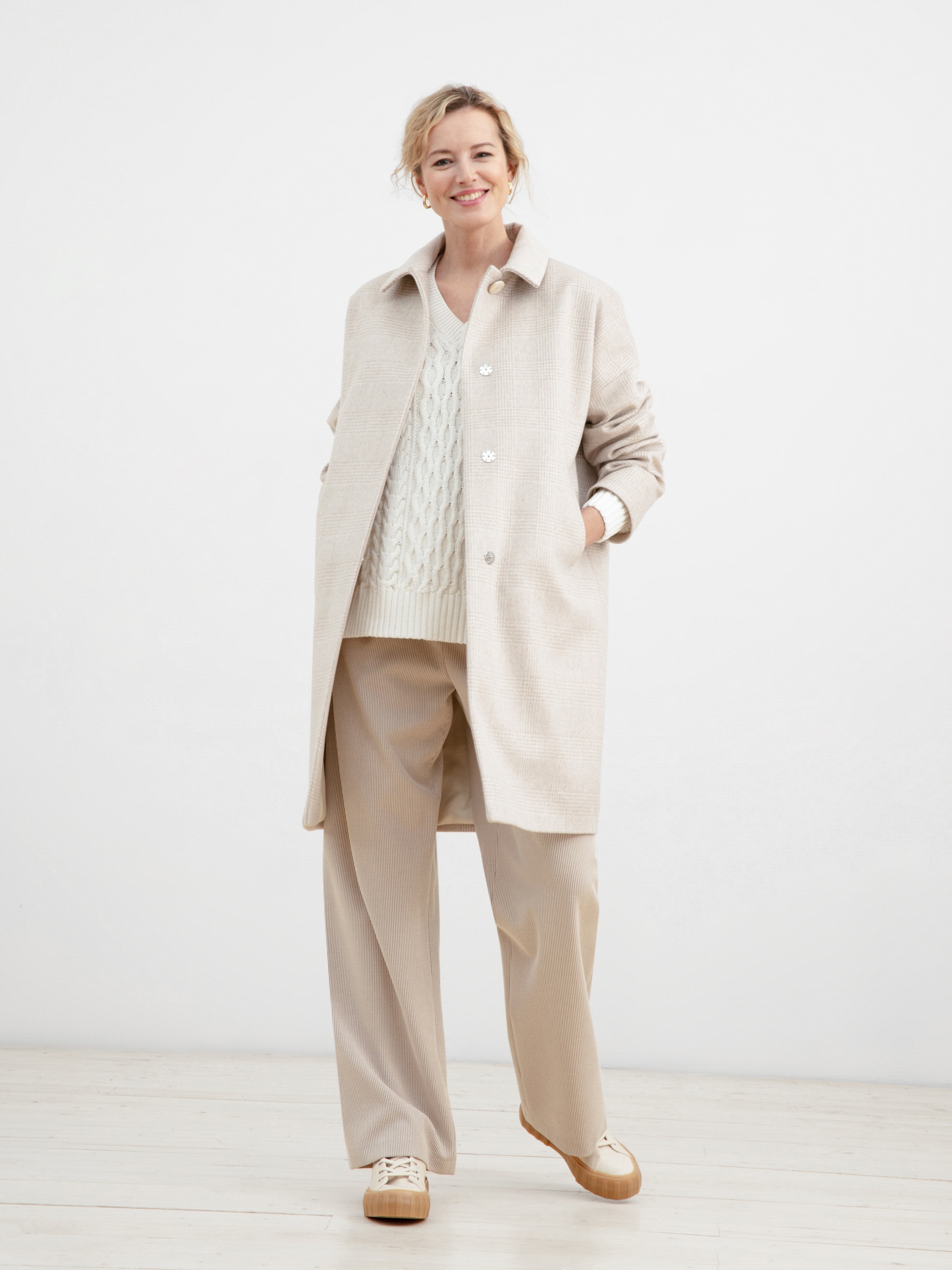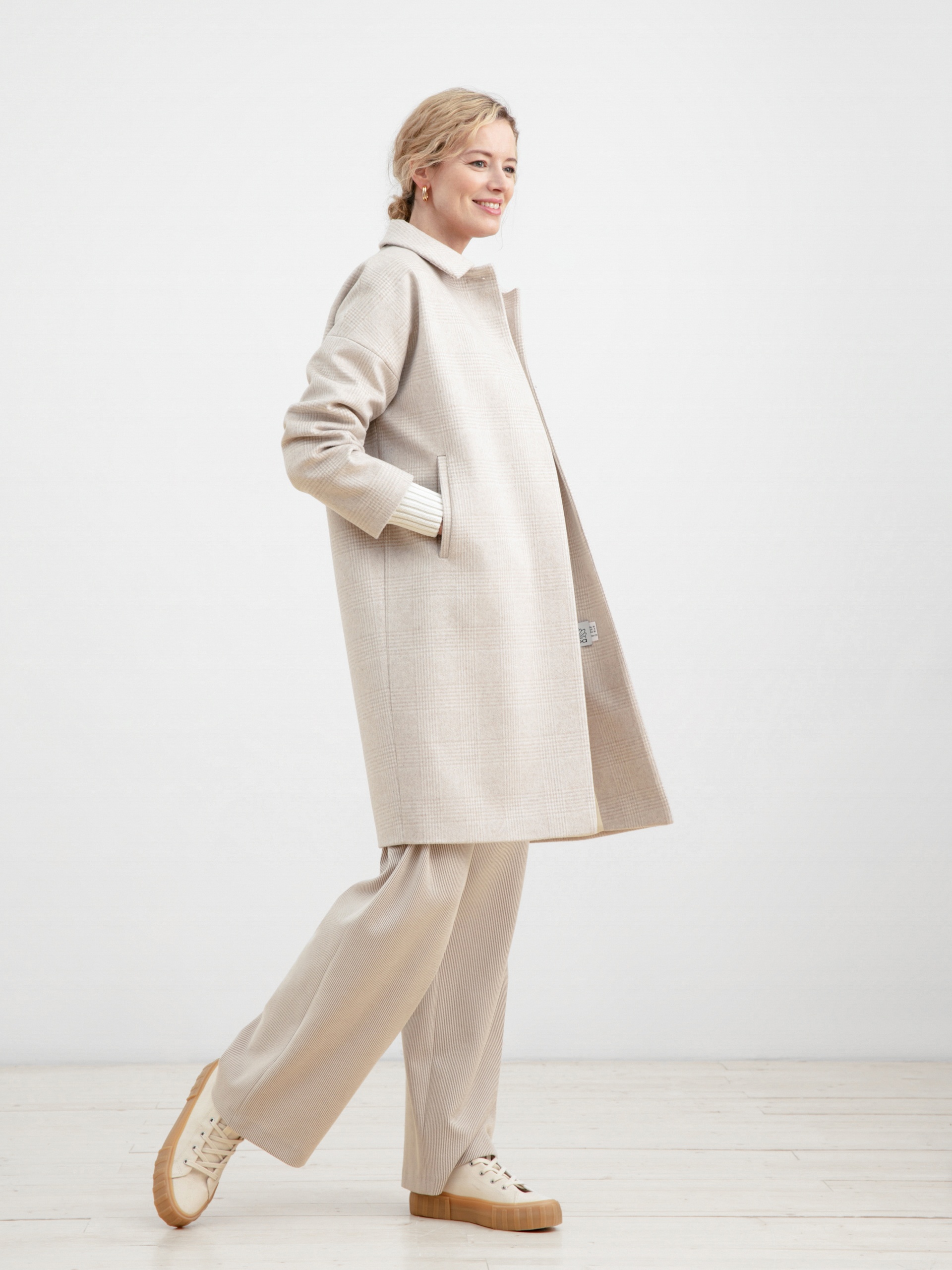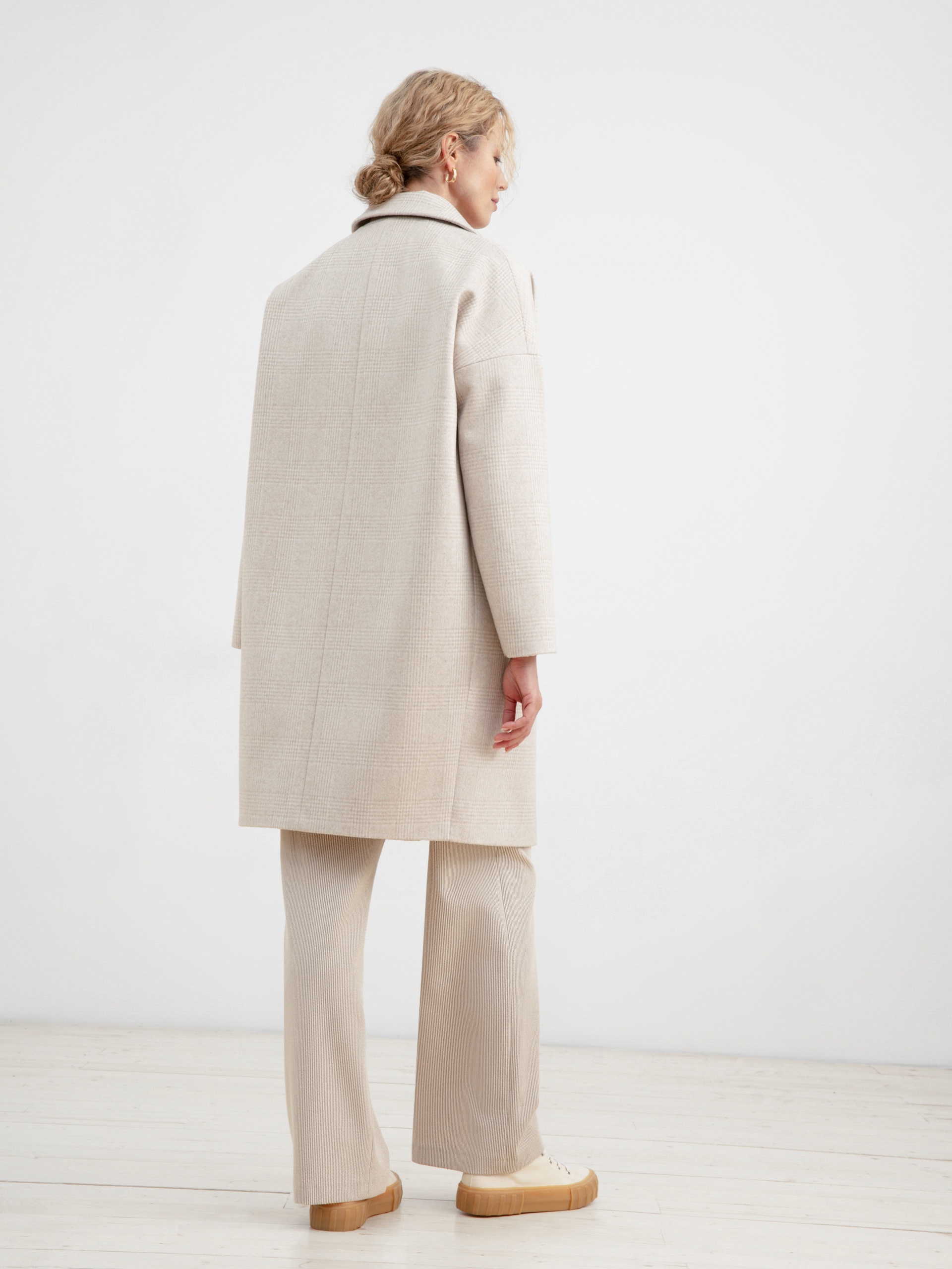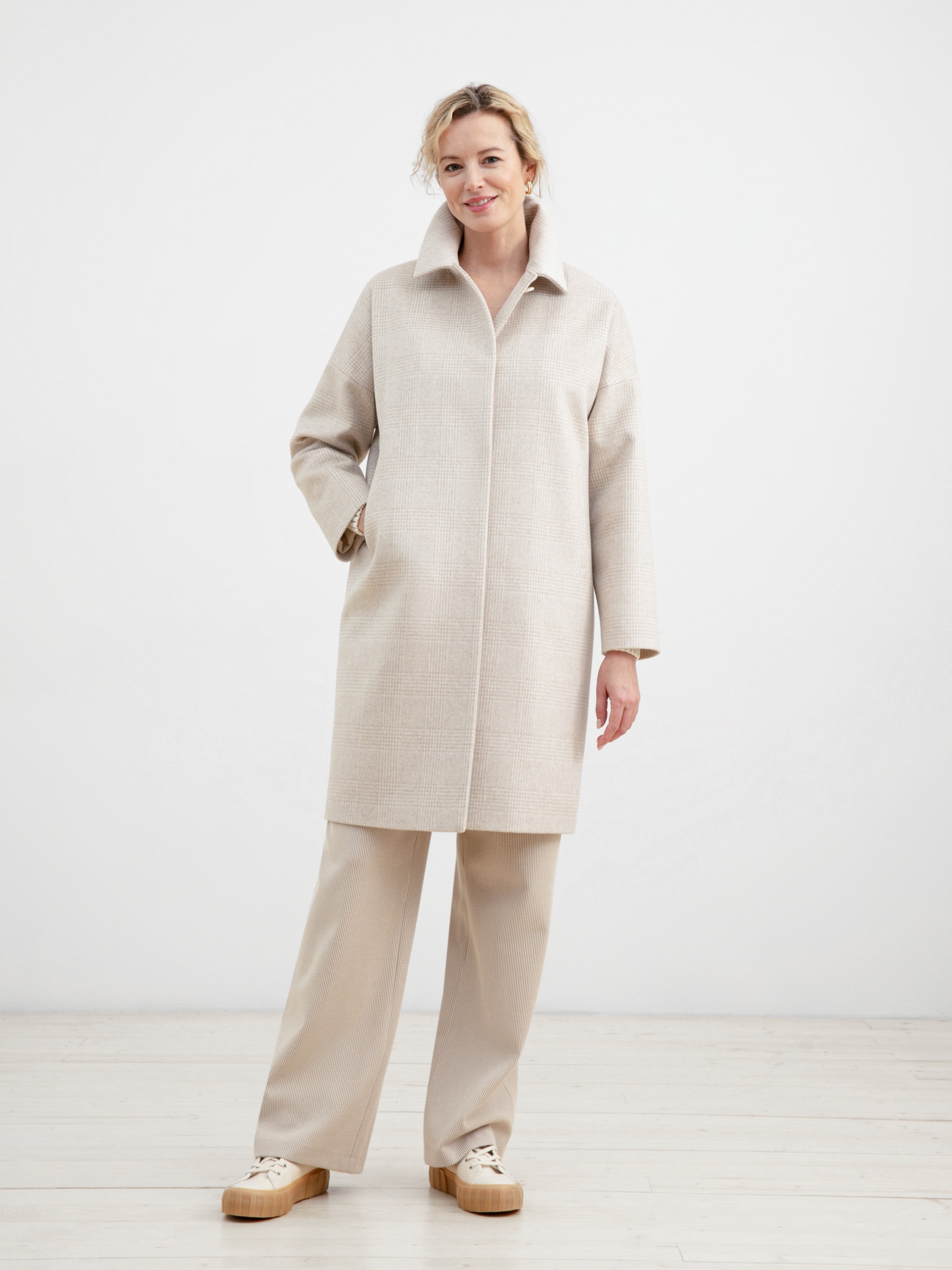 Однобортное пальто характерного силуэта "кокон" из премиальной шерстяной ткани в бежевую клетку. Длина пальто до колена, что делает его элеагантным и при этом комфортным в носке. Рубашечный рукав, аккуратный отложной воротник идеально выдерживают образ, сохраняя его минималистичным и роскошным без личших деталей. Узкие карманы-листочки, застежка на ряд пришивных кнопок и одну крупную роговую пуговицу. Изготовлено пальто из шерстяной ткани с использованием запатентованных технологий в виде высокотехнологичной мембраны Raft-Pro, которая надежно защитит от ветра и влаги в любую непогоду. Произведено в Санкт-Петербурге.