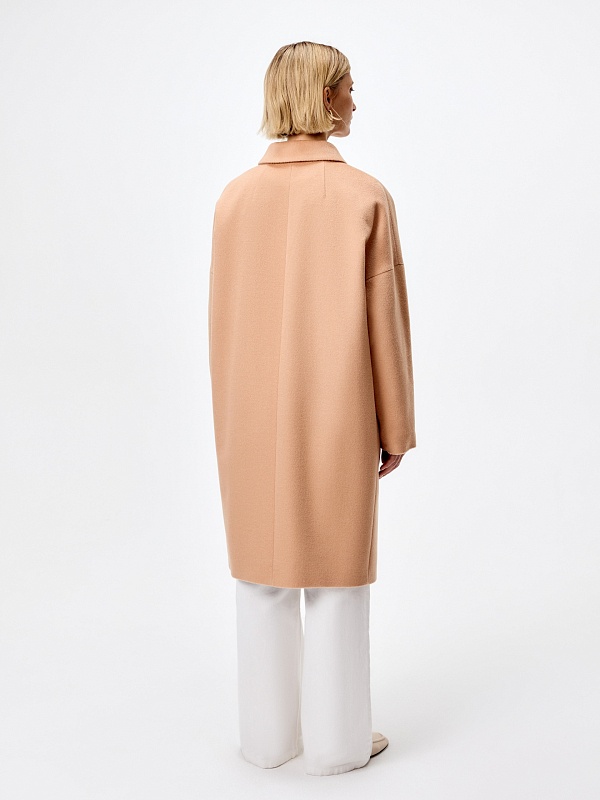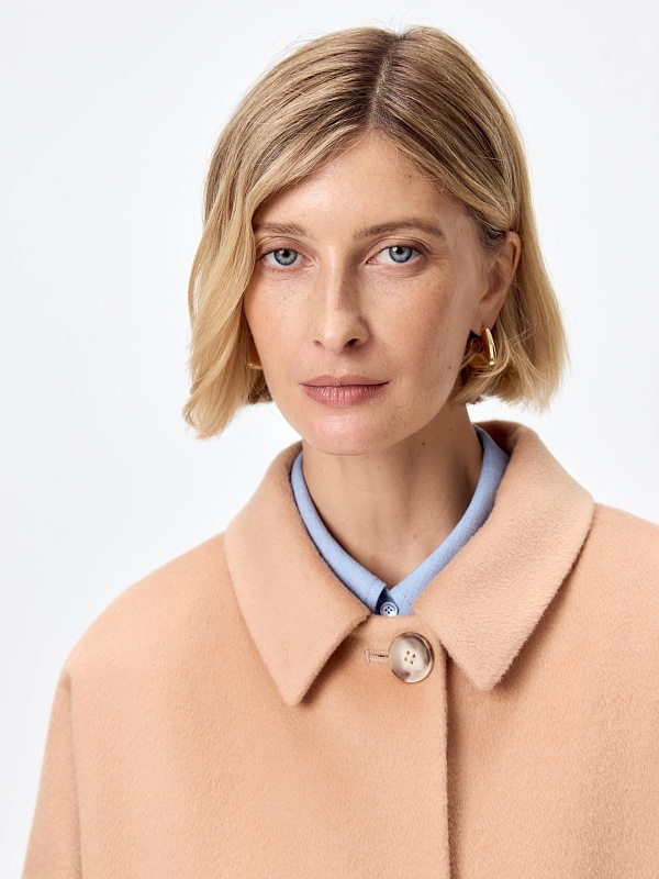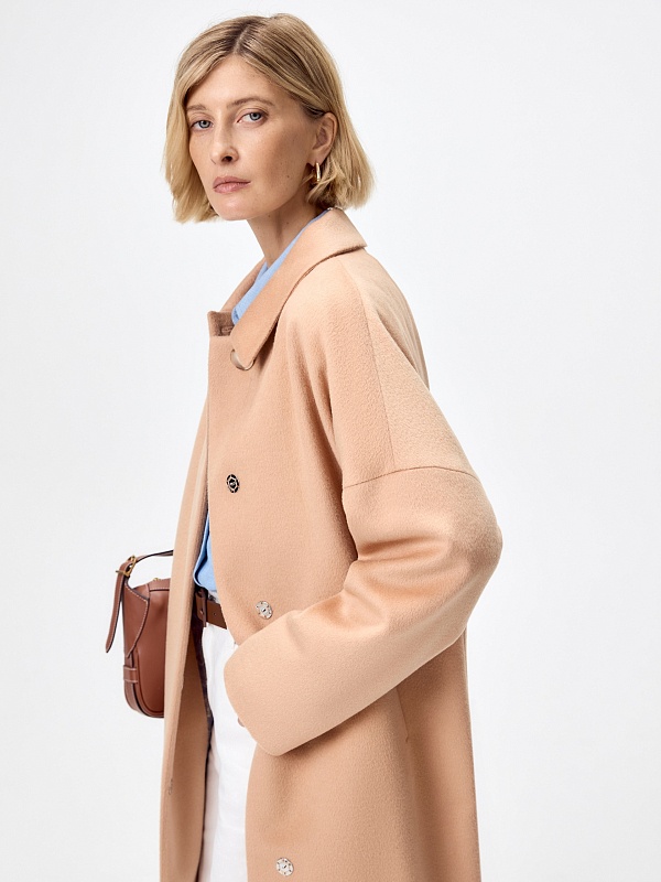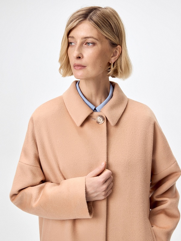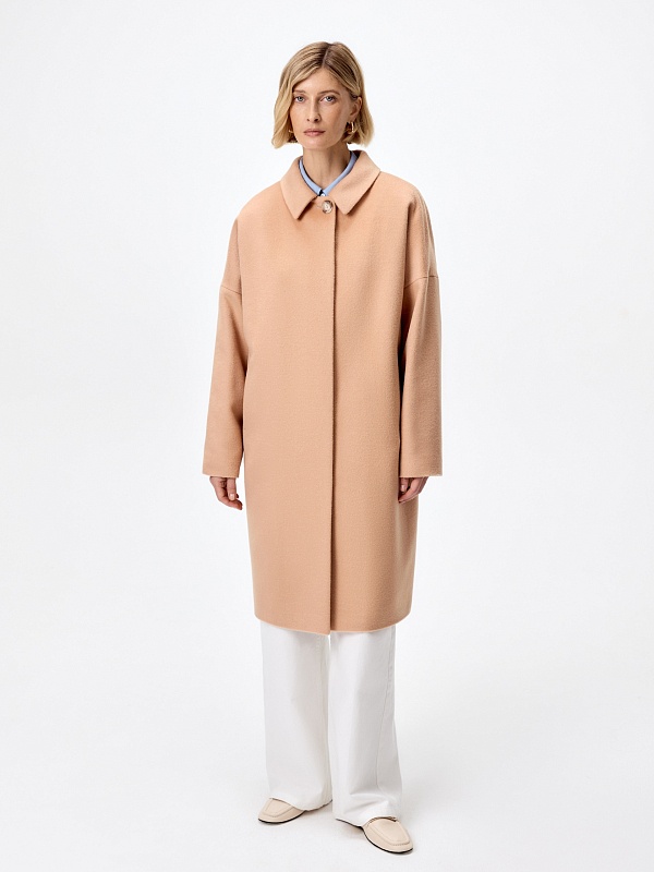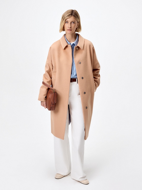 Однобортное пальто характерного силуэта "кокон" из премиальной шерстяной ткани бежевого цвета. Длина пальто до колена, что делает его элеагантным и при этом комфортным в носке. Рубашечный рукав, аккуратный отложной воротник идеально выдерживают образ, сохраняя его минималистичным и роскошным без личших деталей. Узкие карманы-листочки, застежка на ряд пришивных кнопок и одну крупную роговую пуговицу. Изготовлено пальто из шерстяной ткани с использованием запатентованных технологий в виде высокотехнологичной мембраны Raft-Pro, которая надежно защитит от ветра и влаги в любую непогоду. Произведено в Санкт-Петербурге.