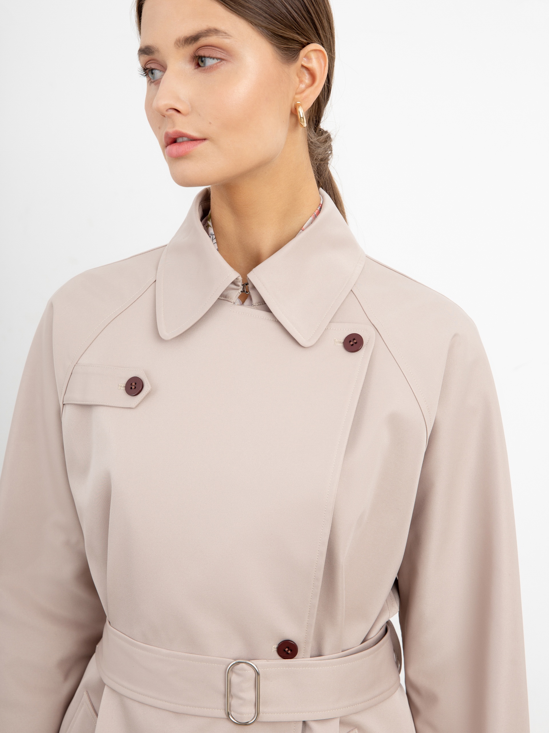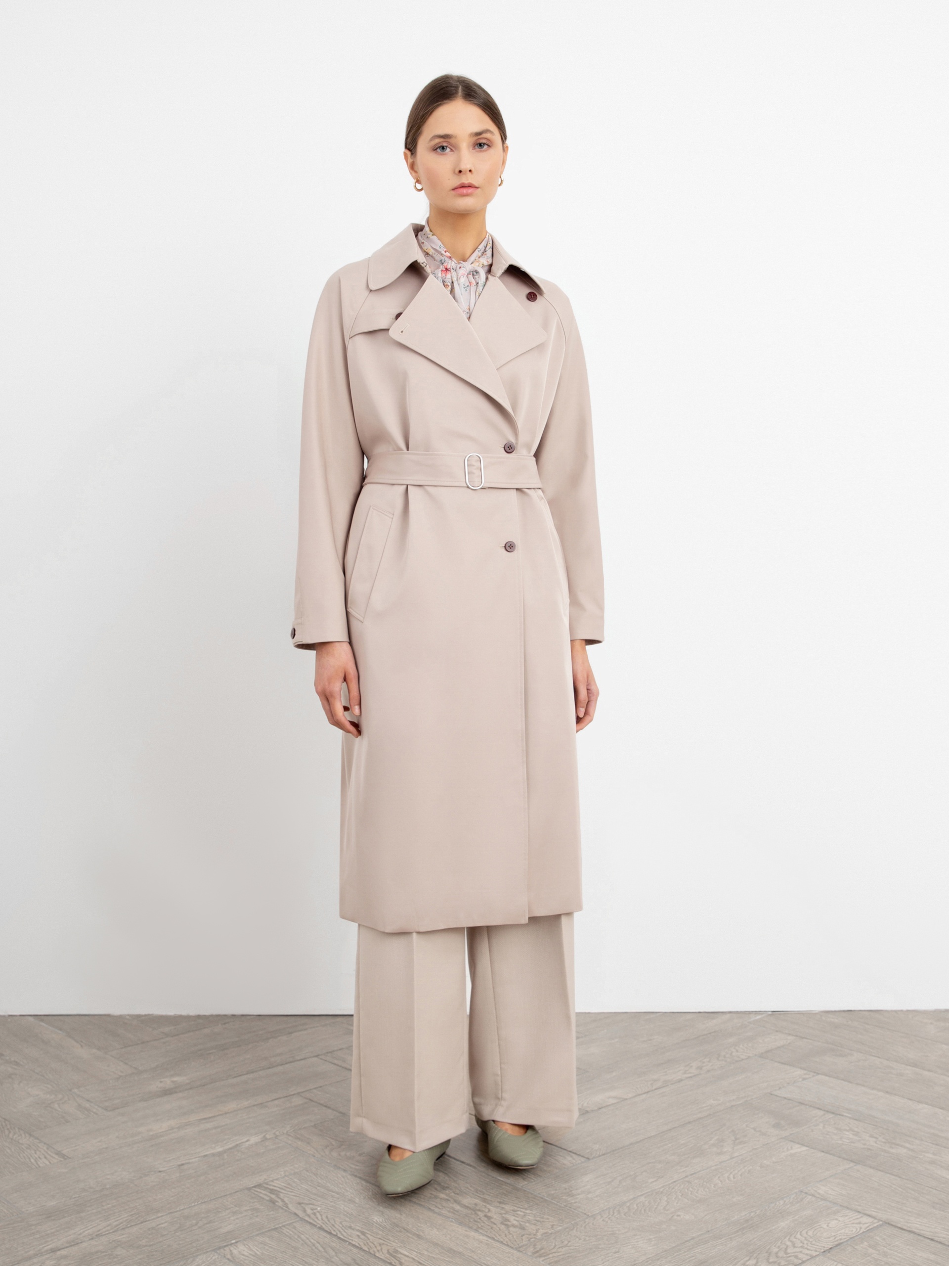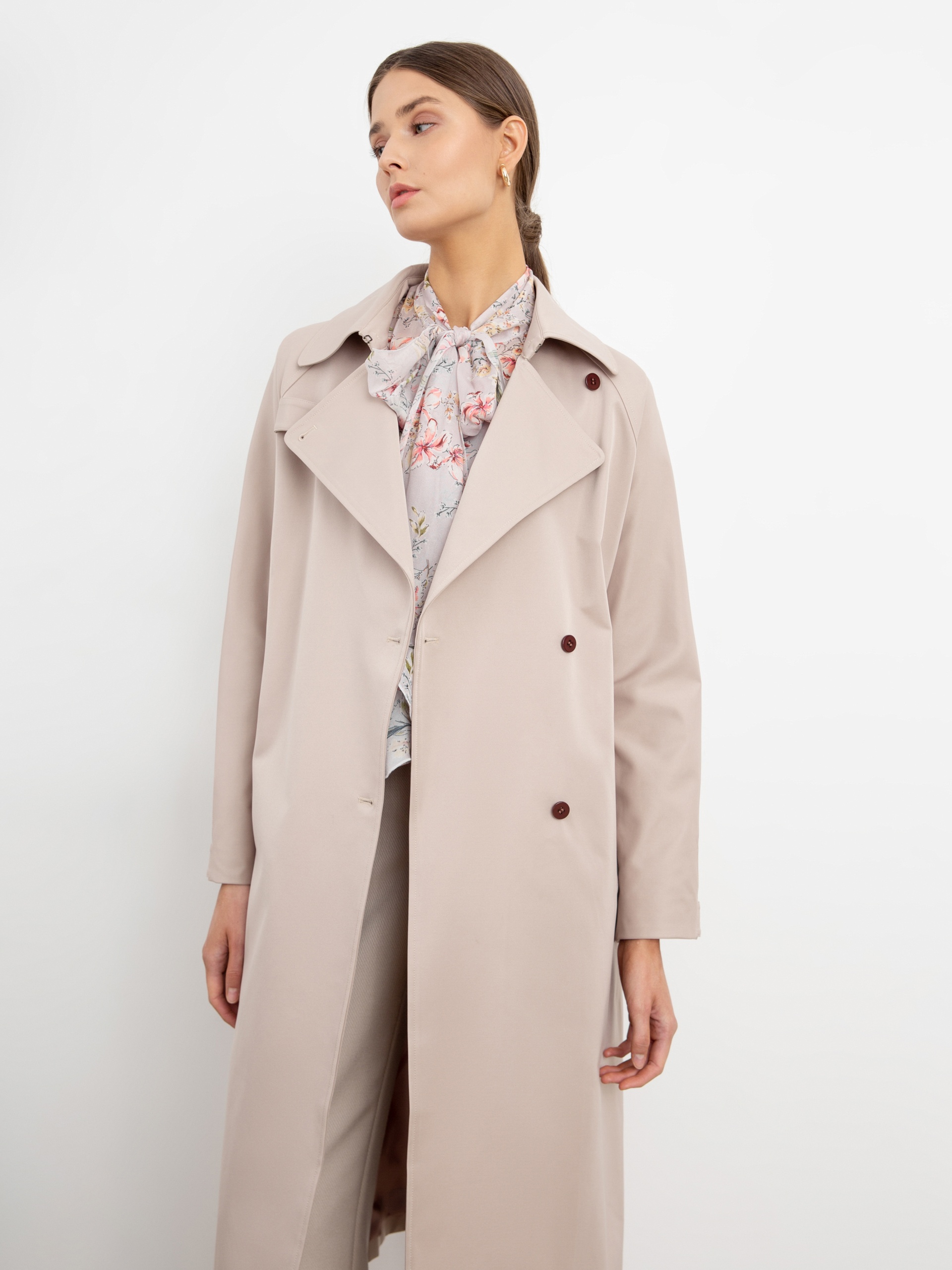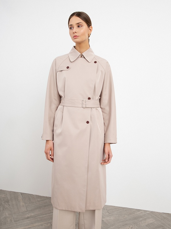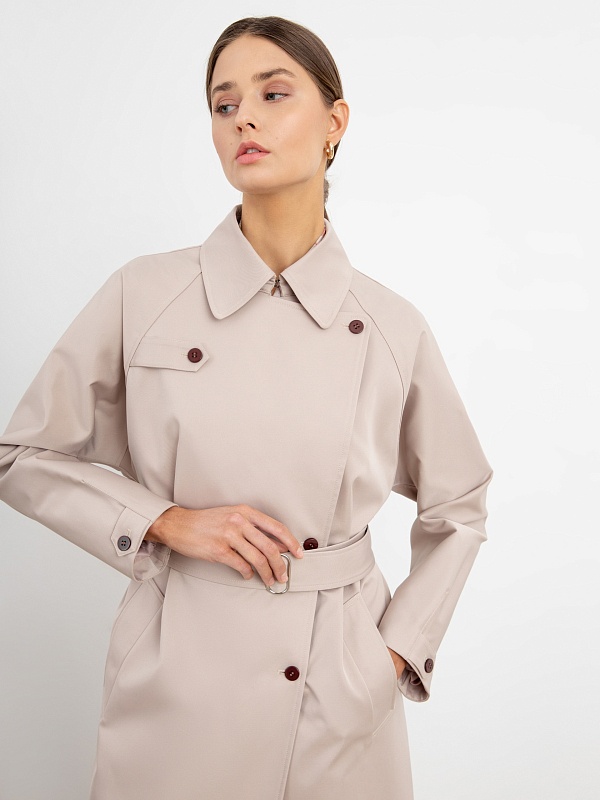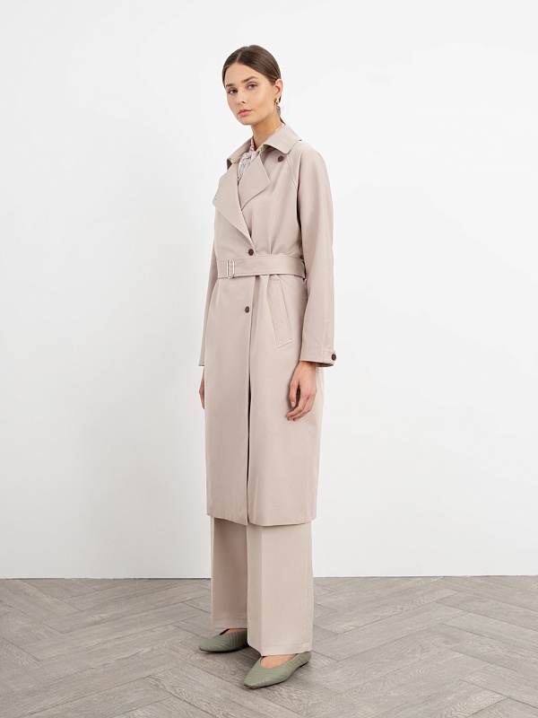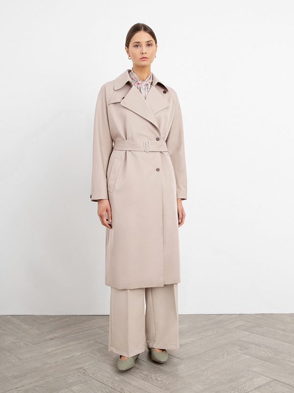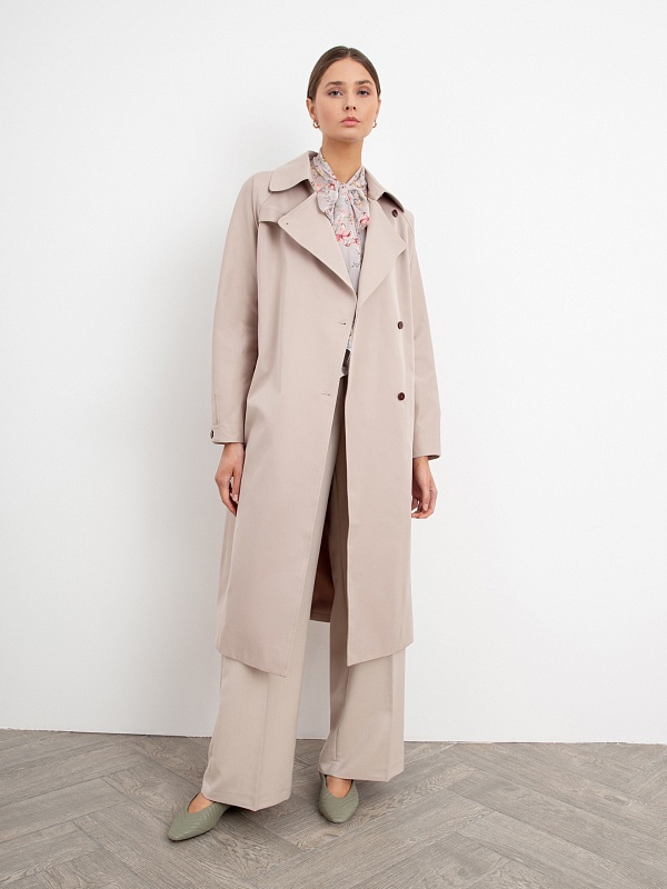 Двубортный тренч прямого силуэта из премиальной плащевой ткани нежного бежевого оттенка. Длина тренча ниже колена придает образу элегантности, а цвет и минимальное количество деталей делают образ легким и воздушным. Рукав-реглан не стесняет движение, а английский воротник застегивается на верхнюю пуговицу, для возможности защиты от ветра. Аккуратные карманы-листочки глубокие и вместительные, при этом не придают лишнего объема. Застежка на ряд контрастных миниатюрных пуговиц служит минималистичным декором и подчеркивает утонченность образа. Тренч имеет легкую водоотталкивающую пропитку, которая создает надежную защиту от дождя, при этом сохраняя высокое качество ткани. Тренч на подкладке. Произведено в Санкт-Петербурге.